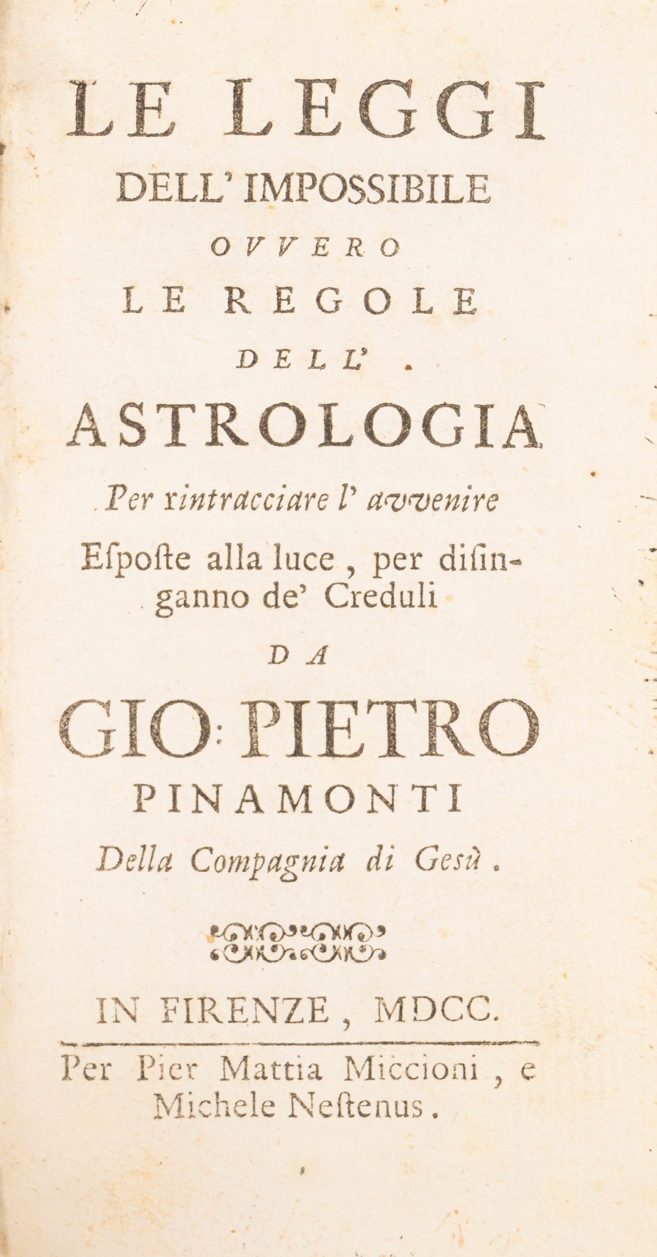 1700 Firenze, Pier Mattia Miccioni e Michele Nestenus, 1700. In 12°. Due carte aggiunte in fine volume con l'indice manoscritto dei capitoli. Legatura in piena pergamena rigida coeva, titolo manoscritto al dorso, nervature, lievi difetti.