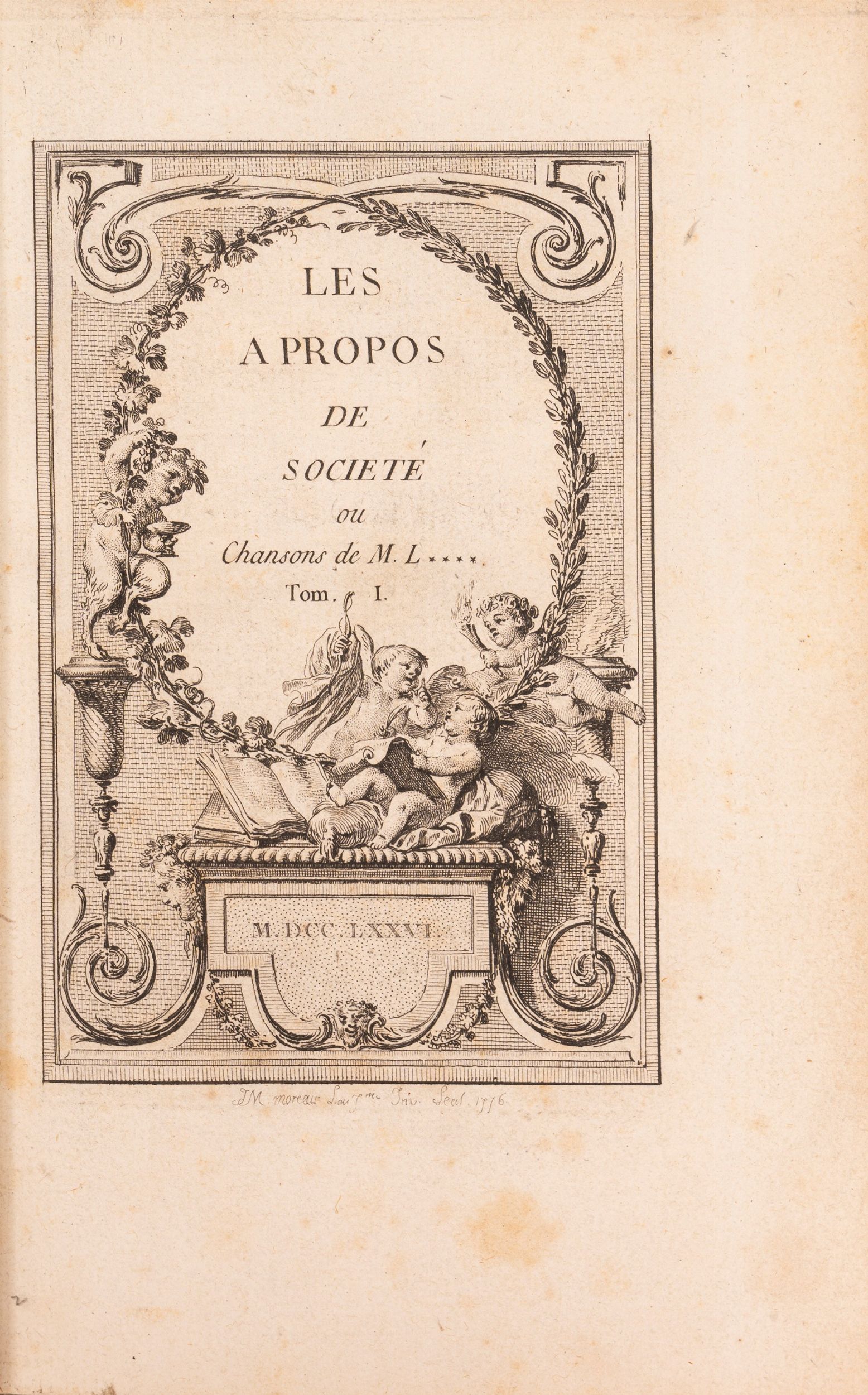 1776 Parigi, 1776. 3 volumi in 8°. Tre frontespizi (uno dei quali ripetuto) con titoli incisi nell'acquaforte e tavole di Jean-Michel Moreau, musica tipografica nel testo. Incisioni più piccole, sempre di Jean-Michel Moreau, in tutto il volume, comprese affascinanti raffigurazioni della società francese contemporanea. Testate e finali in tutto il volume. I tomi c ontengono lo spartito e il testo di 264 canzoni del drammaturgo, cantante e membro dell'Accademia di Francia Pierre Laujon (1727-1811). Raffinata legatura in marocchino nero. Dorsi a cinque nervi con titoli incisi in oro.