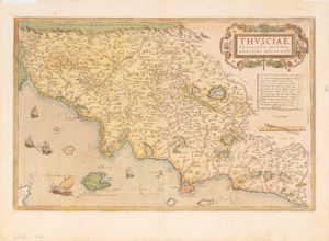 1595 Anversa, 1595 ca. 490 x 350 mm. Incisione su rame con una carta dell'Italia antica tratta dal Parergon Theatri [..]
