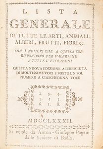 Il catalogo di quest'asta presenta 400 lotti suddivisi in tre tornate. La prima contiene oltre un centinaio di preziosi edizioni antiche dei secoli XV e XVI, tra cui spiccano due rarissime edizioni dantesche del 1478, una stampata a Venezia l’altra a Milano, il prezioso Lattanzio di Subiaco del 1465, primo libro stampato in Italia, la rarissima edizione parigina del Candelaio di Giordano Bruno, il Boccaccio di Dolfin del 1516, il Petrarca dei Giunti del 1504 etc. Gli altri secoli sono ben rappresentati dalle rare edizioni seicentesche della Commedia, da una copia del Dante di Zatta in carta azzurra con le incisioni colorate, dalla splendida prima edizione dei Contes de La Fontaine del 1762, dal prezioso album di caricature di Ghezzi del 1750. La parte finale del catalogo non è da meno, con rari libri d’artista in copie spesso dedicate, edizioni preziose del Novecento ed una serie quasi completa della mitica rivista Verve.