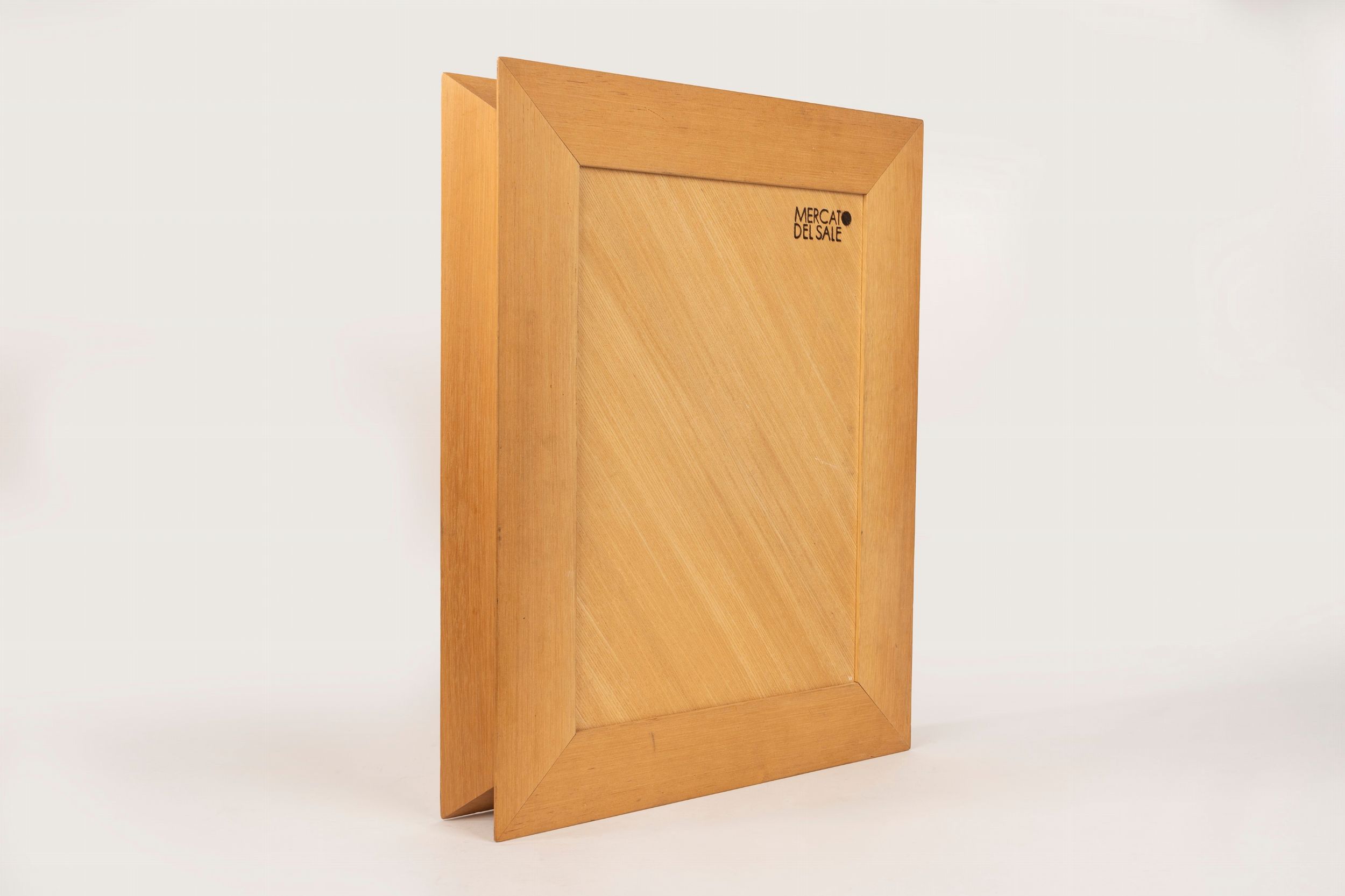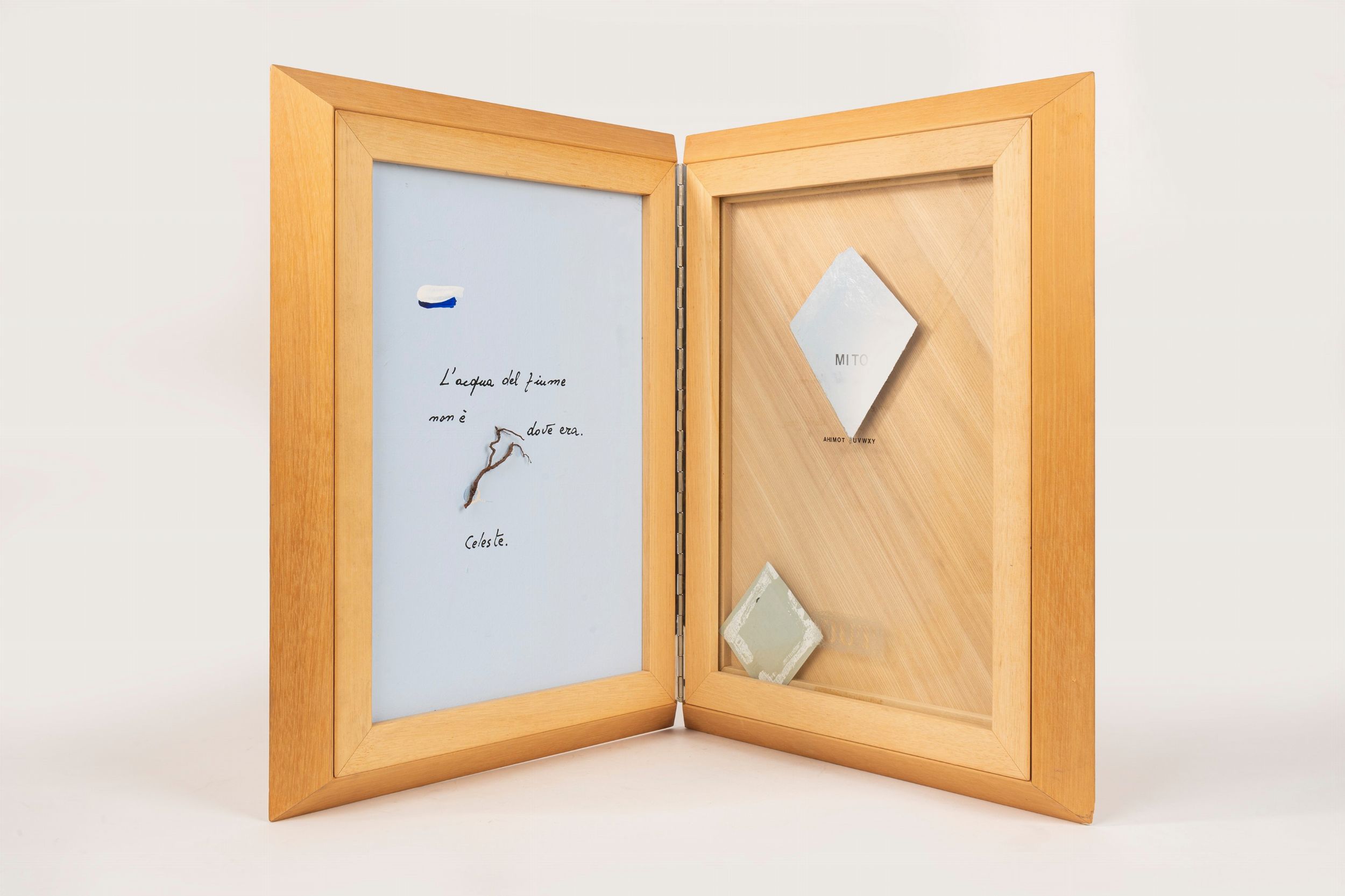1967 Teca in legno chiusa a libro, all'interno, sul lato destro, un'opera di Ugo Carrega, s ull'altro lato un'opera di Vincenzo Ferrari sotto vetro.  La teca in legno fu disegnata da Claudio Salocchi.