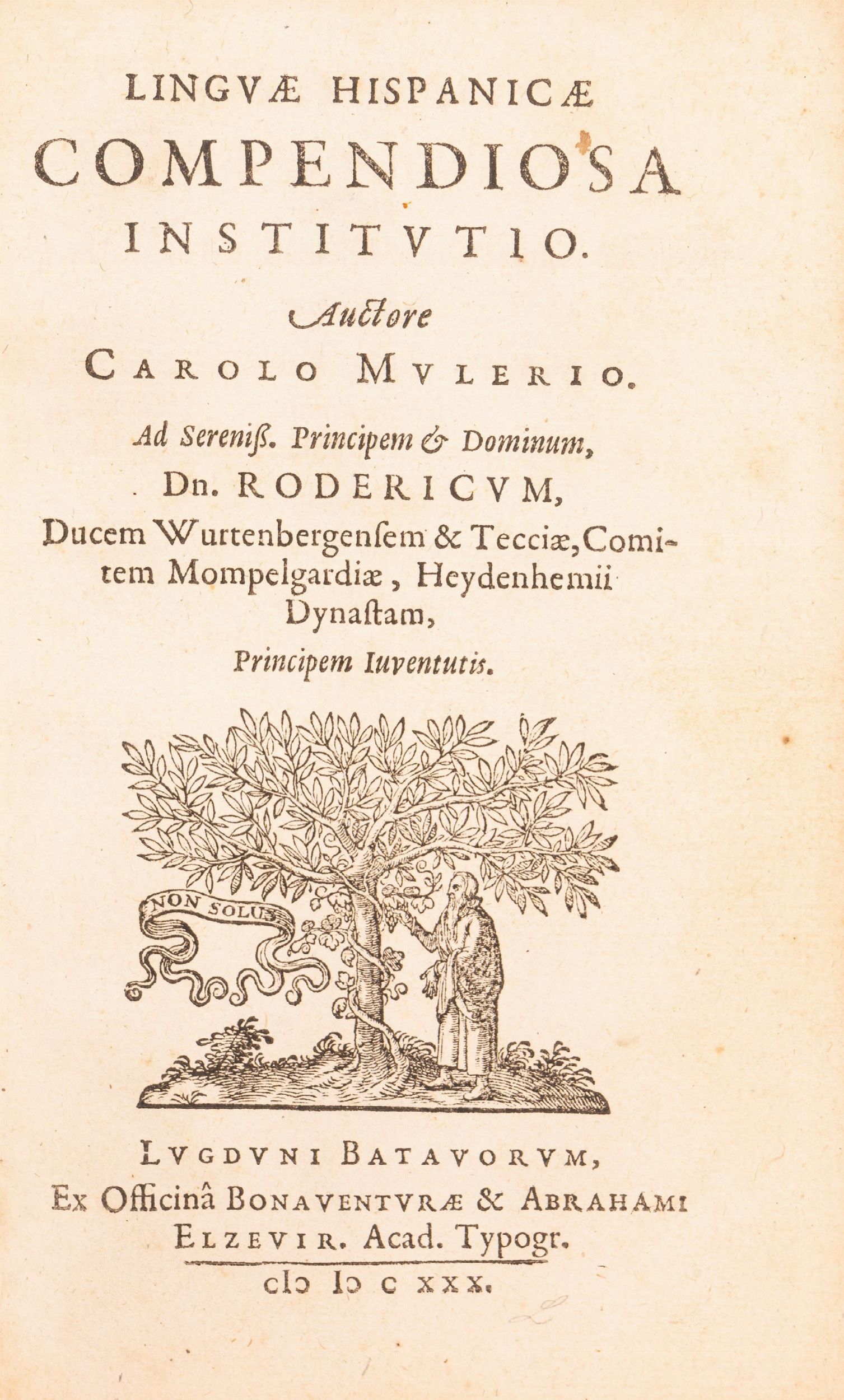 1630 Leida, Ex Officina Bonaventurae & Abrahami Elzevir, 1630, in 8°. Comprende anche Linguae italicae compendiosa istitutio e Linguae gallicae compendiosa istitutio del medesimo autore con segnatura propria. Legatura in cartonato e dorso in pelle con titolo impresso in oro. Tagli a spruzzo color rosso e marca tipografica al frontespizio. Testatine, capolettera e finalini xilografici. Lievi difetti e macchie.