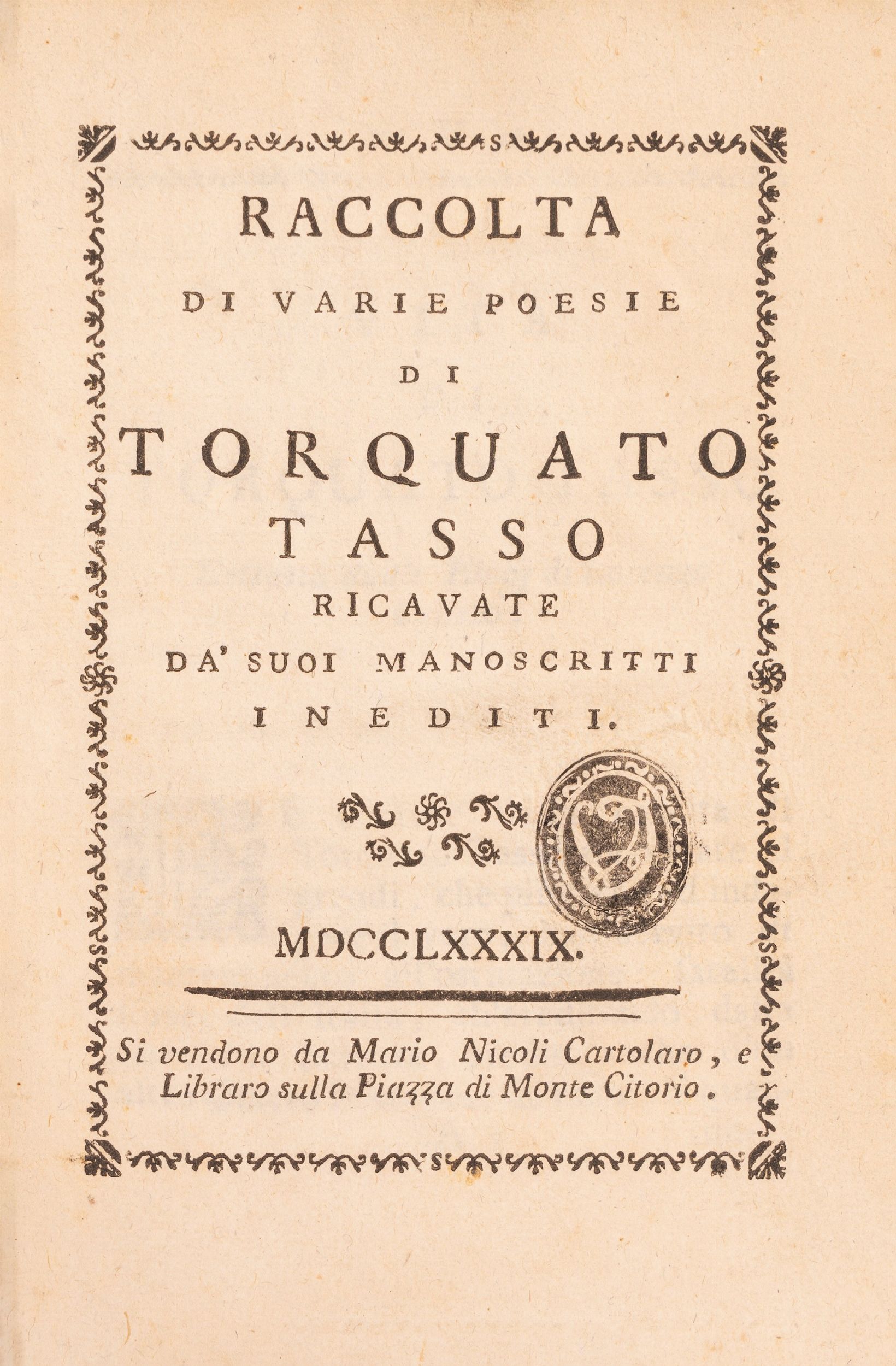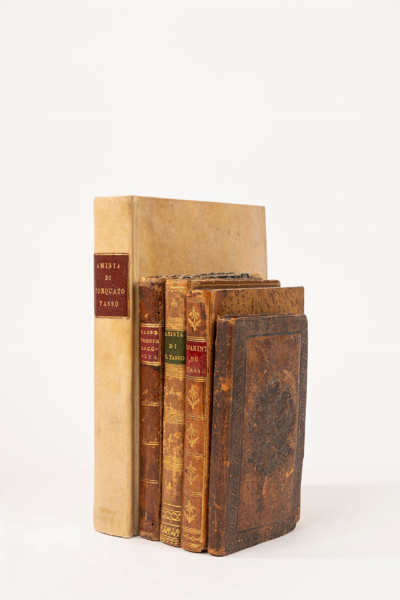 1736 Lotto composto da 5 edizioni tassiane in italiano ed in francese, tra le quali: Aminta, favola boscareccia... Venezia , G.B. Pasquali, 1736. In 8°. Frontespizio stampato in rosso e nero, testatini e finalini xilografici, fioriture sparse, piccola lacuna al margine superiore di pp. 357 - 361, legatura in pergamena del sec.XX, tassello in pelle rossa con titolo in oro al dorso. § Aminta. [Utrecht], P. Munstedam, 1725. In 12°. Antiporta allegorica, armi del dedicatario dell'opera, 5 tavole incise all'acquaforte, sporadiche fioriture, legatura dell'epoca in pelle marrone, decorata a secco, ai piatti cornice di fiori, stemma nobiliare ai piatti, lievi difetti. § Raccolta di varie poesie di Torquato Tasso ricavate da' suoi manoscritti inediti. Roma, Mario Nicoli, 1789. In 8°. Frontespizio entro cornice xilografica, legatura in mezza pelle, tassello in pelle rossa con titolo in oro al dorso, difetti. Insieme nel lotto altre due edizioni dell'Aminta.