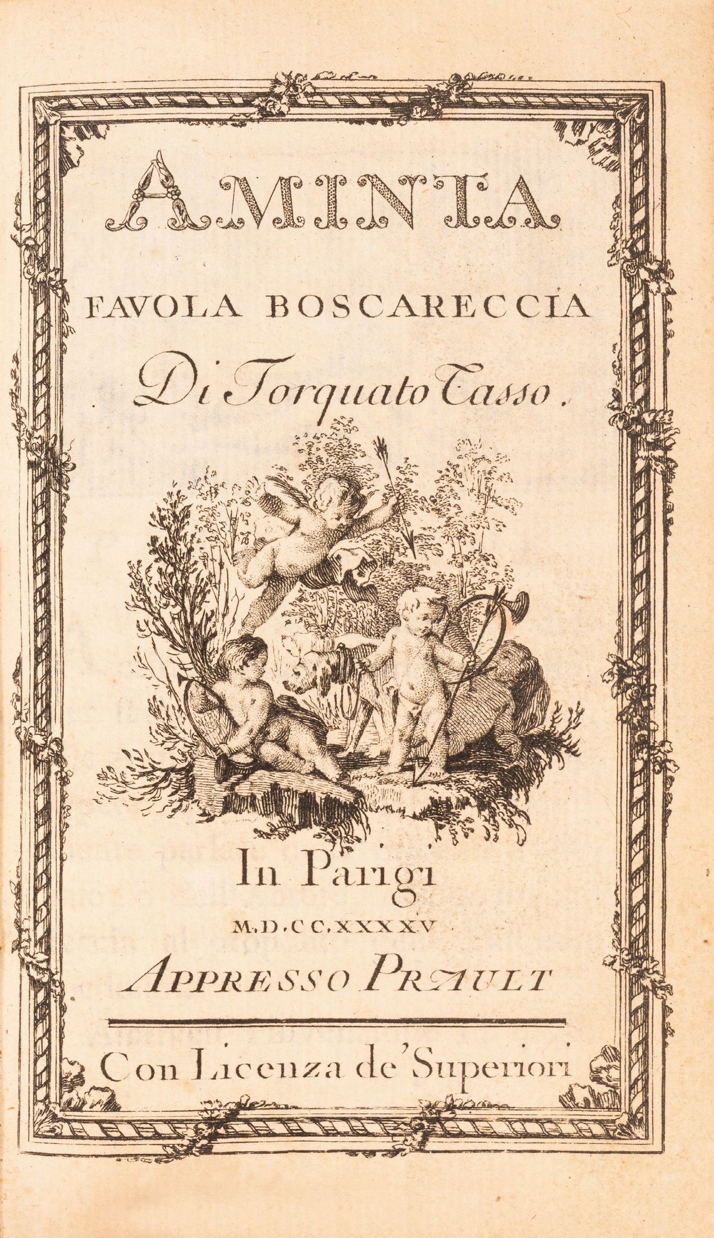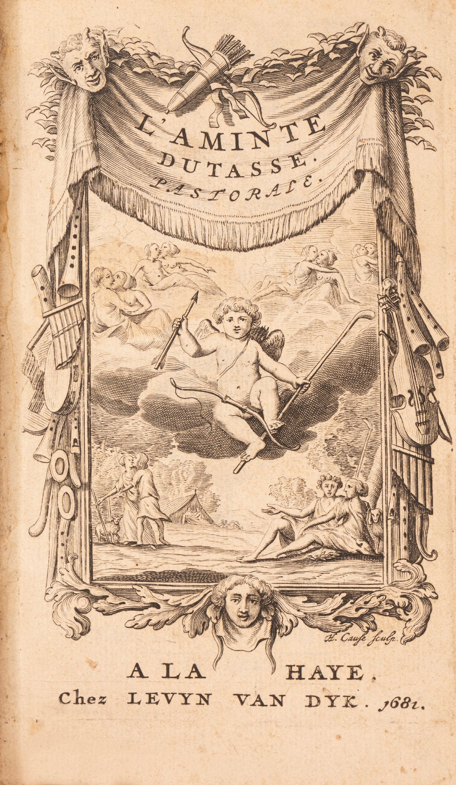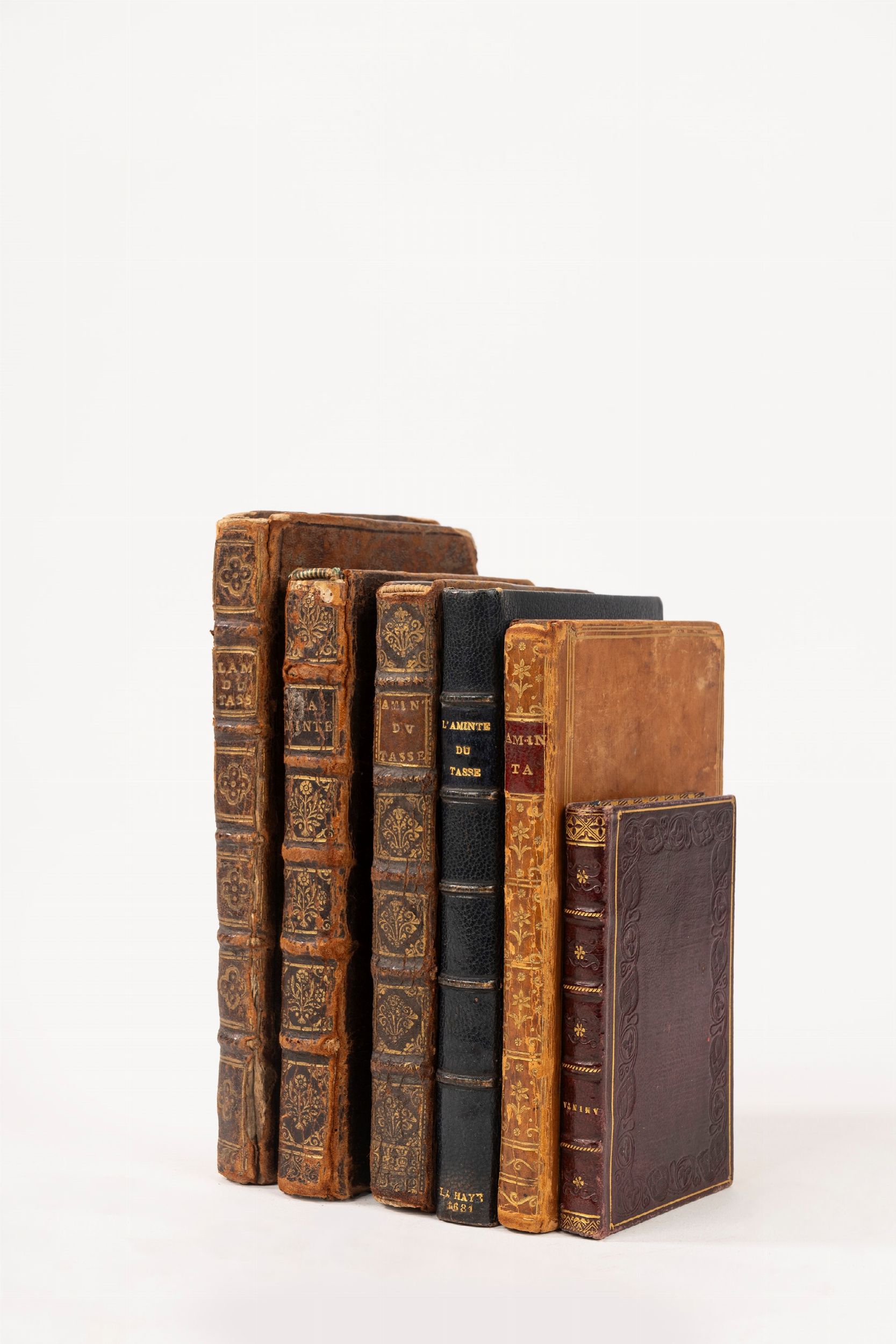 1676 L'Aminte du Tasse. Pastorale traduite de l'Italien en vers françois , Parigi, Claude Barbin, 1676. In 8°. Antiporta incisa in rame, marca tipografica al frontespizio, testatine e capilettera, 6 tavole a piena pagina, lievi fioriture. Legatura in pelle marrone, dorso a 5 nervi con titolo e fregi in oro, tagli dorati, difetti agli angoli e alle cerniere. § L'Aminte. L'Aya: van Dyk, 1681. In 8°. Antiporta allegorica incisa in rame, testatine e capilettera, 6 tavole a piena pagina, alcune carte con piccoli restauri, legatura del sec.XIX in marocchino blu, dorso a 5 nervi, titolo in oro ad un comparto, tagli dorati. Ex libris Gustave Bourcard. § L'Aminte du Tasse. Pastorale traduite de l'Italien en vers françois . Rouen, David Berthelin, 1679. In 8°. Legatura in pelle marrone, dorso a 5 nervi con titolo e fregi in oro, tagli a spruzzo rossi, spellature. Insieme nel lotto altre due edizioni italiane dell'Aminta e una in francese.