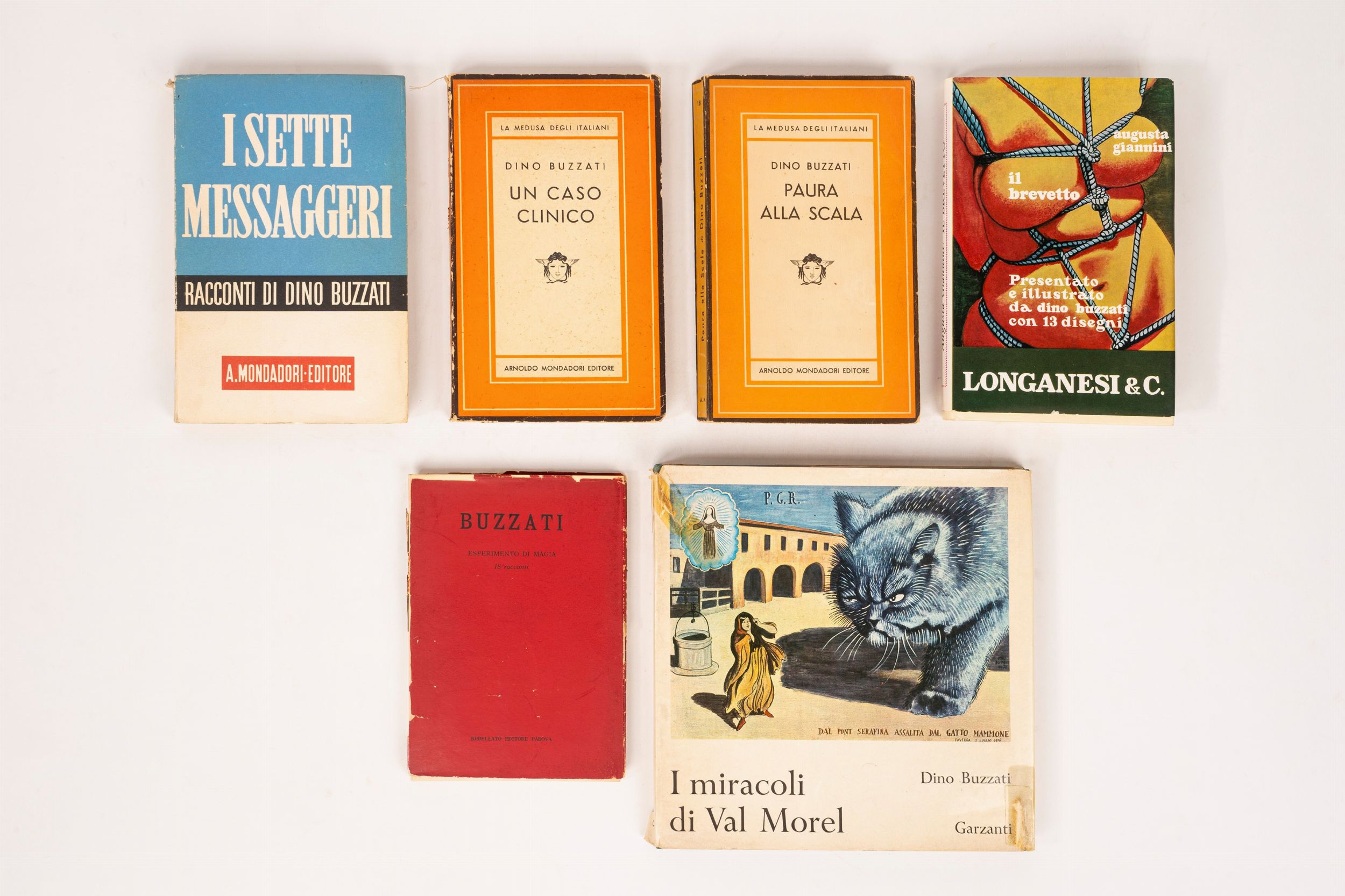 1949 6 volumi di Buzzati, perlopiù prime edizioni, tra cui: Paura alla Scala. Milano, Mondadori, 1949. cm 19,5 x 11,7. Brossura editoriale arancione, titoli stampati in nero al dorso e ai piatti, lievi difetti. Prima edizione. § Un caso clinico . Milano, Mondadori, 1953. 19,5 x 11,8 cm. Brossura editoriale arancione, titoli stampati in nero al dorso e ai piatti, segni d'uso alla brossura. Prima edizione. § I sette messaggeri. Milano, Mondadori, 1942. cm 19,5 x 12,8. Brossura editoriale stampata in rosso, nero e azzurro, qualche difetto alla brossura. Prima edizione. § Esperimento di magia. 18 racconti , Padova, Rebellato, 1958. 17 x 12 cm. Brossura editoriale rossa staccata dal corpo del testo, mancanze. Tiratura limitata di 500 esemplari, il nostro n. 420. Insieme nel lotto anche I miracoli di Val Morel , Milano, Garzanti, 1971, prima edizione e Augusta Giannini, Il brevetto. Presentato e illustrato da Dino Buzzati con 13 disegni. Milano, Longanesi, 1967.