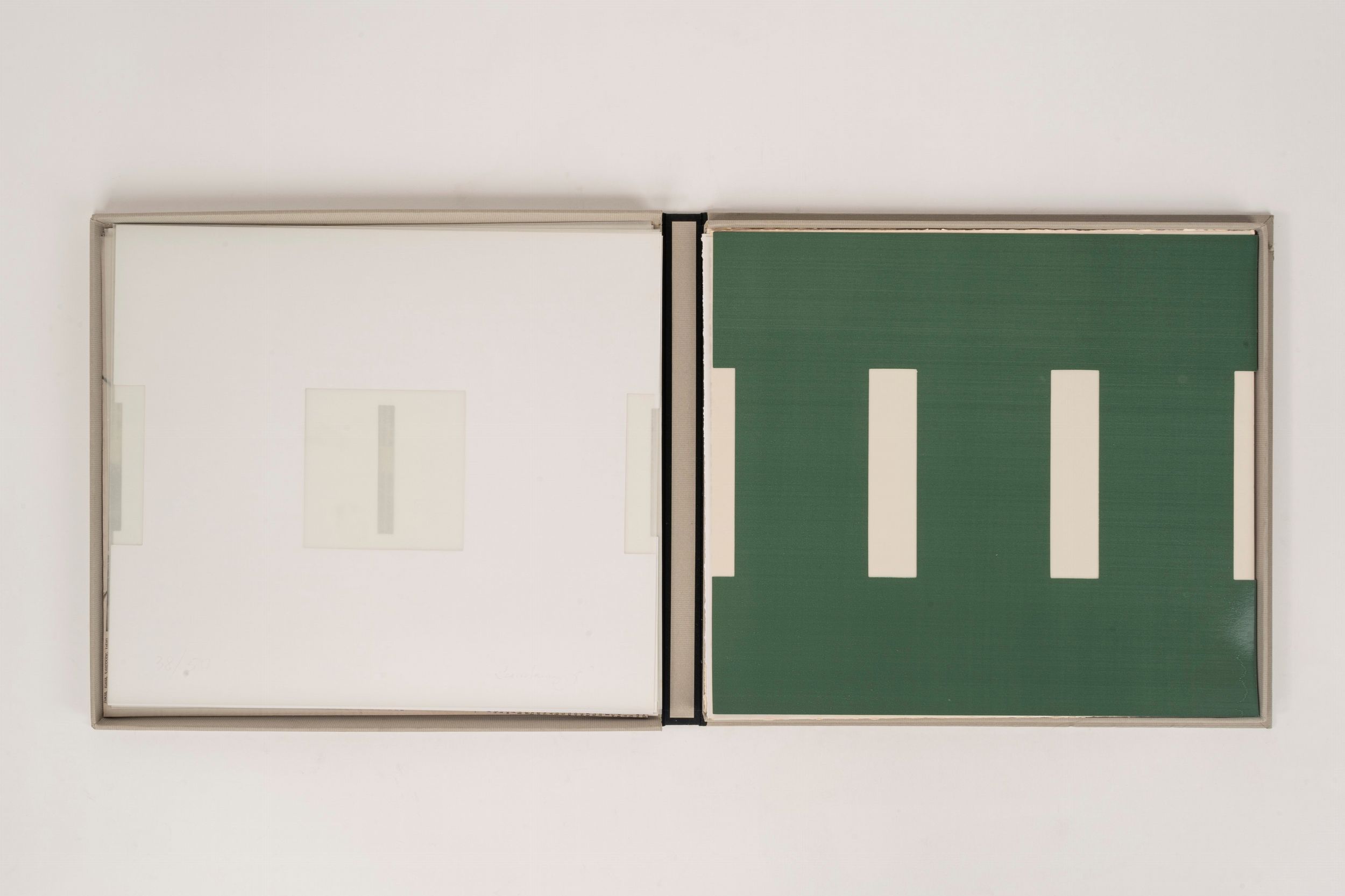 2000 Muggiò, Sam Villa, 2000. Cartella in cartone grigio contenente nove serigrafie impresse su tre tipi di carta 30 x 34 cm, tre serigrafie per ogni autore numerate e firmate sul retro.