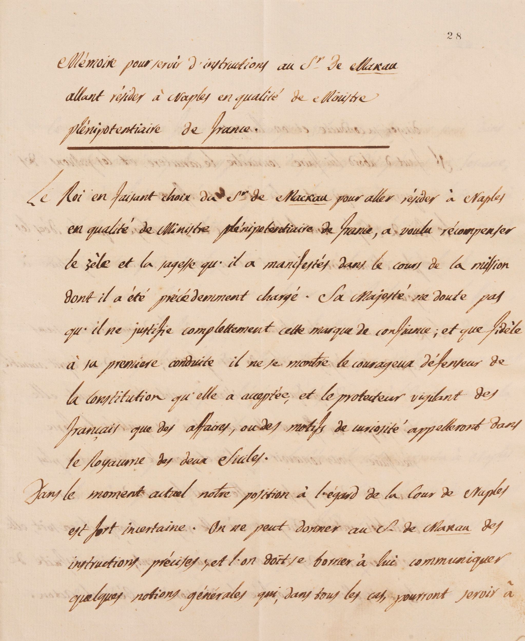 1792 Manoscritto con sottoscrizione autografa di Luigi XVI di Borbone ((Versailles, 23 agosto 1754 – Parigi, 21 gennaio 1793), inviato al barone Luigi Armando di Mackau. Scritto in inchiostro bruno su carta e rilegato con un filo rosso, si compone di 16 pp. vergate da una sola mano, 235 x 192 mm. Datato Parigi, 10 giugno 1792. Il barone Luigi Armando di Mackau, figlio di un ambasciatore, era entrato giovanissimo nella carriera diplomatica come ministro plenipotenziario alla corte del Württemberg. Due anni prima aveva conosciuto i sovrani di Napoli nel loro viaggio di ritorno dall'incoronazione di Leopoldo II. Il 30 aprile del 1792 il barone è stato nominato Ministro plenipotenziario presso la Corte di Napoli, dove arrivò il 12 agosto, avendo come Segretario di legazione Ugo di Basseville. Dopo la sua morte, avvenuta nel 1793, Vincenzo Monti compose la Bassvilliana. Il testimone è molto interessante, non solo per i personaggi coinvolti, ma per il suo valore storico: il Re ha scritto le presenti Memorie il 10 giugno 1792, a due mesi dalla sua deposizione che precedette di non molto la sua decapitazione. Con questo scritto il Re non voleva dare delle istruzioni precise, ma solo delle nozioni generali, perché è consapevole della sua posizione incerta a Napoli. Cerca di dargli una panoramica del Regno di Napoli e dei personaggi coinvolti, descrivendogli i comportamenti da tenere.