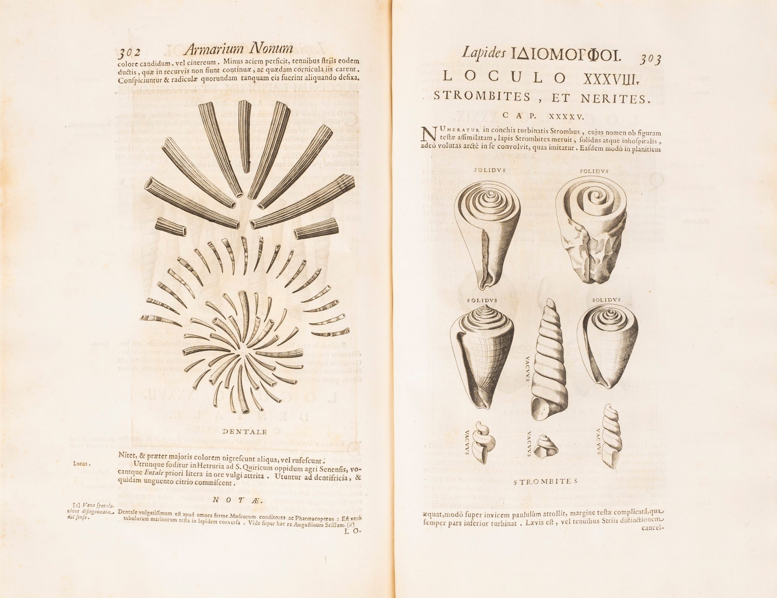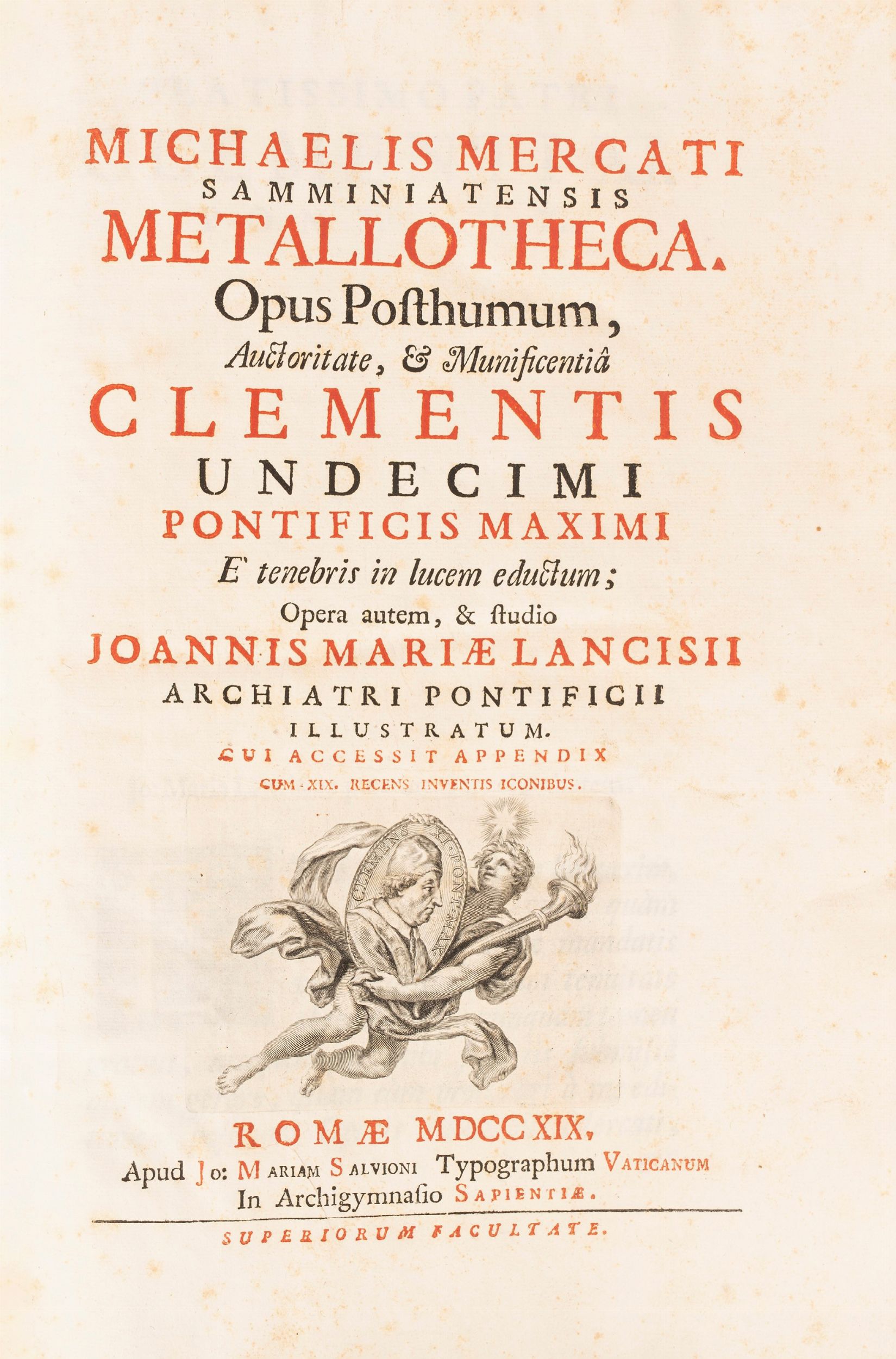 1719 Roma, Giovanni Maria, Salvioni, 1719. In folio. Occhietto, antiporta disegnata da Pietro Bianchi e incisa da J. Frey, frontespizio in rosso e nero con vignetta calcografica con ritratto di Clemente XI, 8 tavole incise di cui 2 doppie, illustrazioni calcografiche, ritratto dell'autore disegnato da P. Nelli su dipinto di Tintoretto e inciso da B. Fariat, parte seconda con proprio frontespizio in rosso e nero con vignetta calcografica, ritratto di Lancisi inciso da Frey su dipinto di S. Conca, illustrazioni calcografiche. Arrossature sparse. Legatura in piena pergamena rigida coeva con impressioni a secco ai piatti, titolo manoscritto al dorso, fregi in oro, tagli in azzurro, lievi difetti.