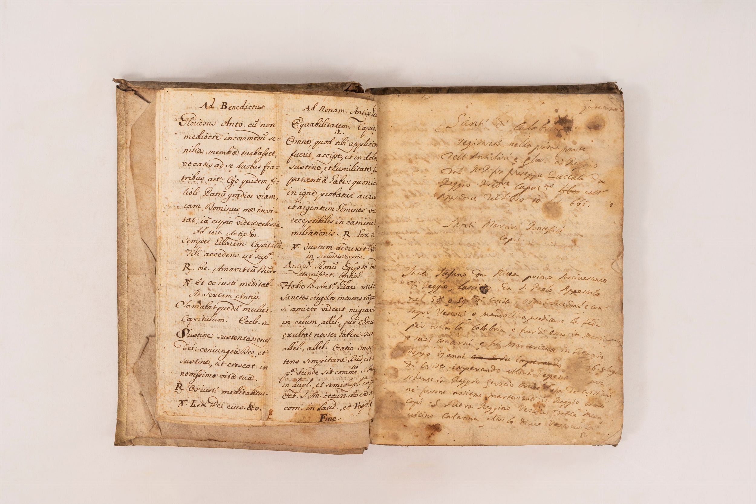 1700 Manoscritto composito in inchiostro bruno. Legatura in pergamena sciolta. La prima parte è un messale dedicato alla festa del Santo. La seconda parte è costituita da un'antologia di brevi vite di santi e martiri. Macchie, bruniture, lievi danni e restauri alla legatura.