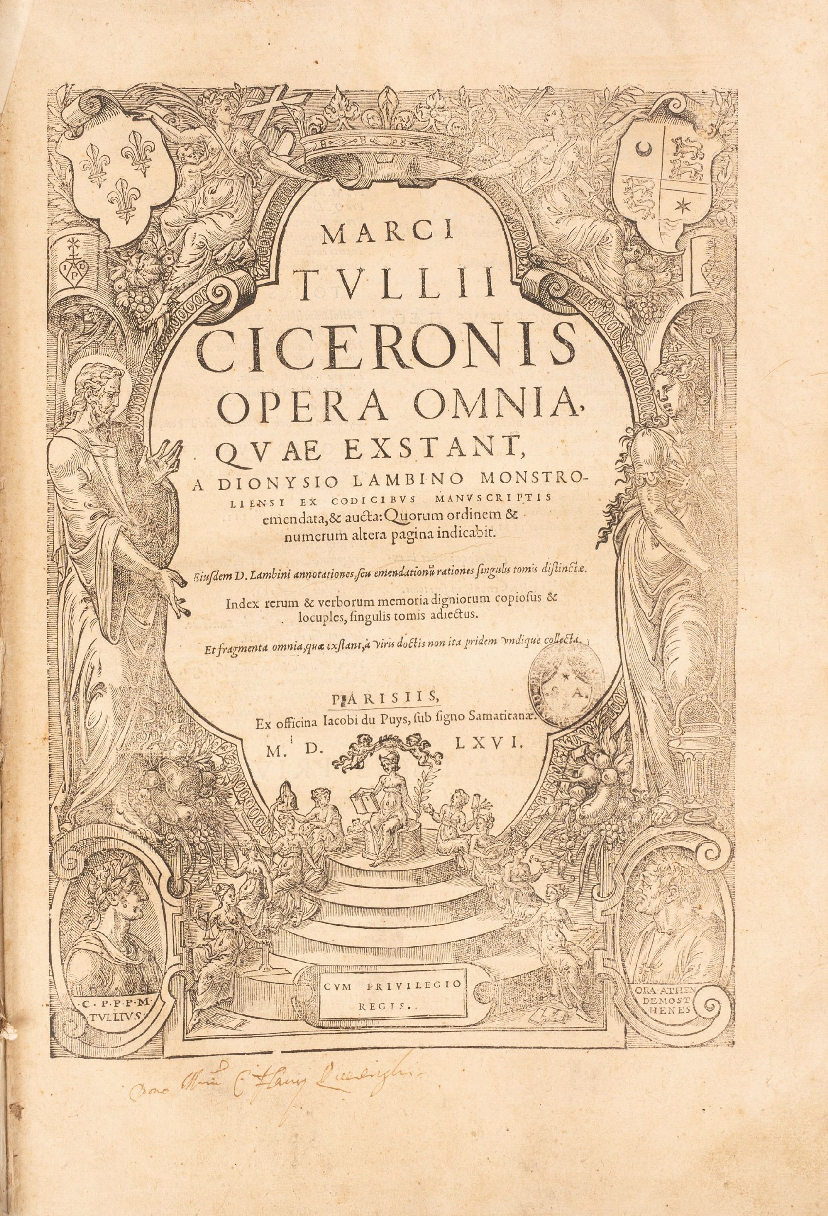 1566 Parigi, Iacobi du Puys, 1566. In folio. Tomo primo. Titolo al frontespizio entro ricca cornice xilografica decorata con i ritratti di Cicerone e Demostene, capilettera e testatine incisi, leggera brunitura, qualche alone di umidità. Legatura in piena pergamena floscia, titolo manoscritto al dorso, difetti e strappi marginali. Solo un tomo di quattro.