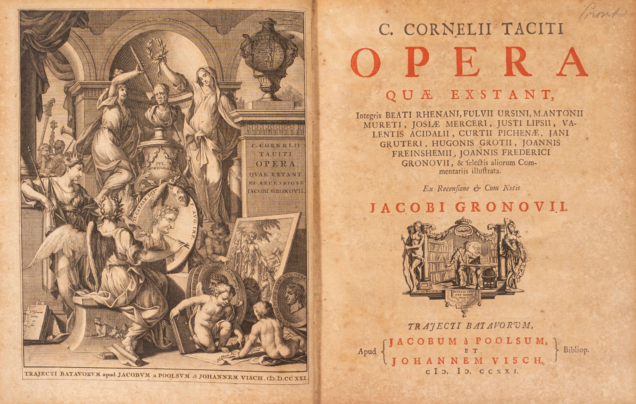 1721 Traiecti Batavorum, apud Jacobum a Poolsum et Joannem Visch, 1721. In 4°. 2 voll. Frontespizio in rosso e nero con marca tipografica xilografata, antiporta incisa al vol. 1, arrossature, brunitura. Legatura in piena pergamena, titolo in oro al dorso entro tassello, tagli rossi.