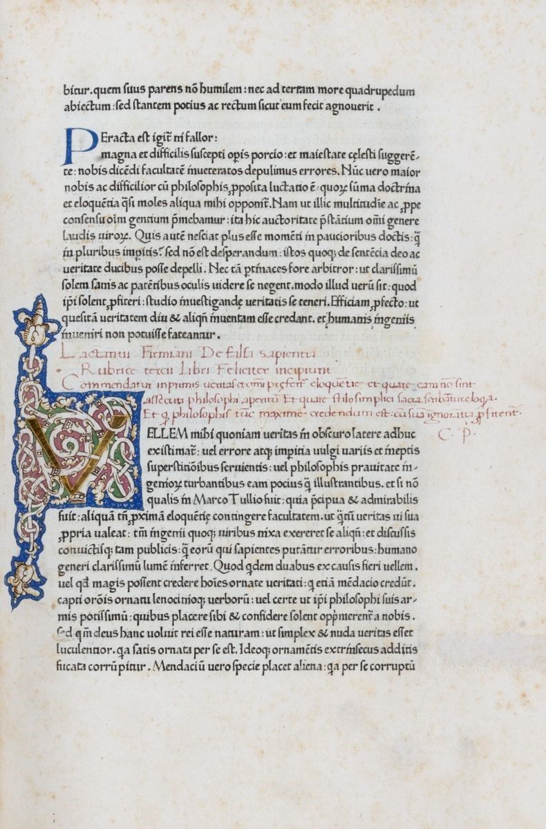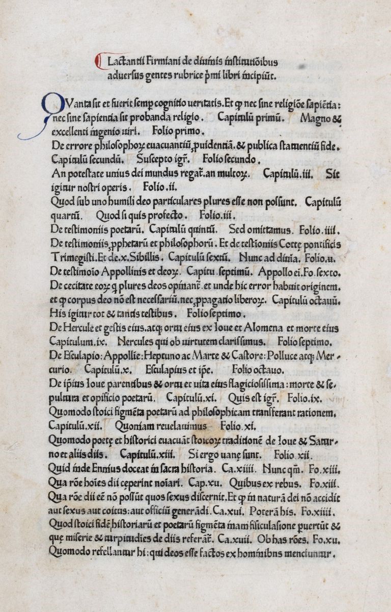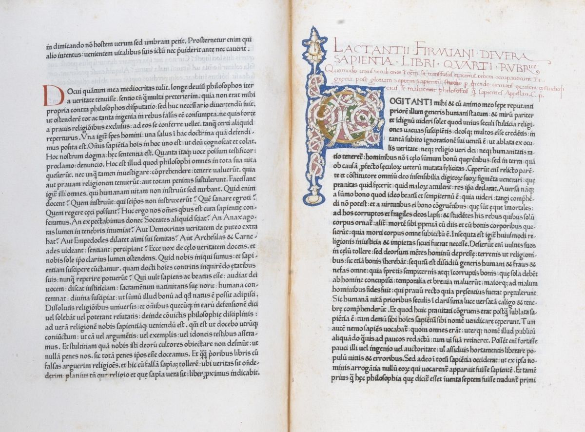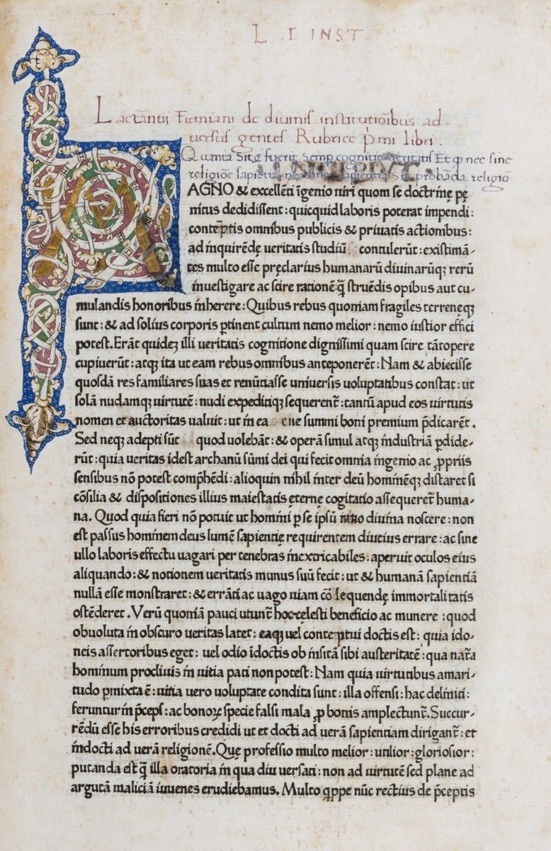 1465 Subiaco, [Conradus Sweynheym and Arnoldus Pannartz], 29 ottobre 1465. In 2°. 338 x 230 mm. 182 di 186 carte non numerate, a10 [b2 mancante] c-h10i12k-p10q12r-t10 mancano i due fogli di errata [fascicolo b] impressi successivamente ed assenti in molti esemplari e le due carte bianche finali [t9-10]. Testo su una colonna di 36 linee, caratteri 120 SG e 120 Gk. Capilettera dipinti in inchiostro rosso e blu, titoli delle varie sezioni manoscritti in scrittura corsiva e rubricati in rosso, 9 SPLENDIDE MINIATURE AD APERTURA DEI DIVERSI LIBRI a bianchi girari con lettera a foglia d’oro su sfondo blu e decorazioni in rosa e verde, si tratta delle lettere M-Q-V-C-N-Q-B-A e Q, glosse marginali sbiancheggiate ai margini di alcune carte, due strappi marginali restaurati a c.hr e h6r, restauro al centro della carta s7 con recupero manoscritto di alcune lettere, risarcimenti al margine esterno delle ultime 10 carte, la carta del colophon da altro esemplare e restaurata, legatura romantica della metà del XIX sec. in pelle marrone con al dorso impresso in oro 'Lactantius mcccclxv.'