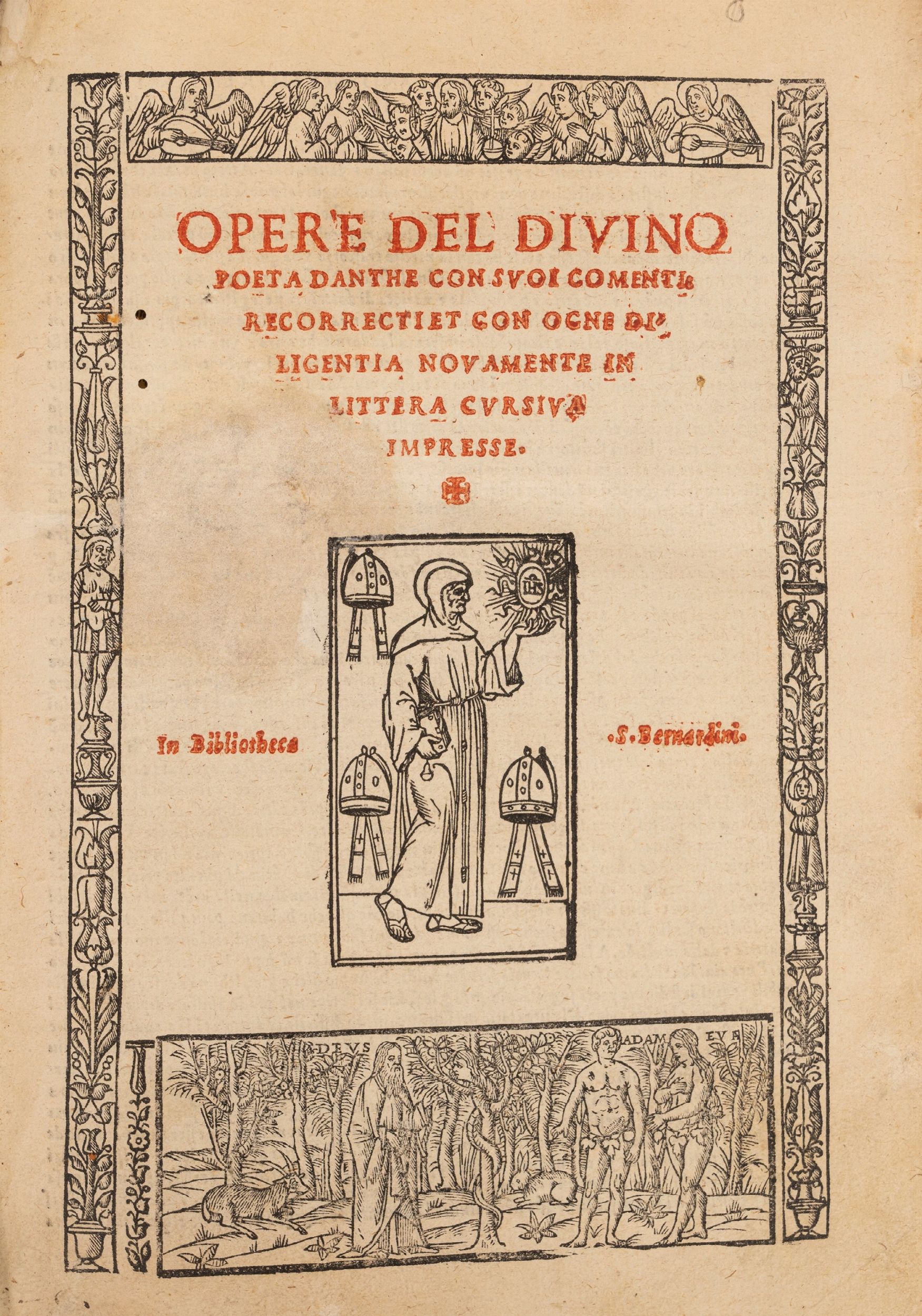 1520 Venetia : per miser Bernardino Stagnino da Trino de Monferra, 1520 adi XXVIII marzo. In 4°. Frontespizio in rosso e nero, al centro immagine di S. Bernardino da Siena con disco radiante con monogramma di Cristo IHS e tre mitre attorno, entro cornice xilografica, illustrazioni xilografiche ad inizio di ogni canto, marginali bruniture ma nel complesso ottimo esemplare, LEGATURA VENEZIANA COEVA CON IMPRESSIONI A SECCO E DECORAZIONI IN ORO, TAGLI DORATI E GOFFRATI , fermagli e lacci, piccoli difetti e mancanze al dorso e ai piatti, tracce di abrasione al frontespizio, lievi aloni marginali. Fogli ai contropiatti con scritture cinquecentesche.