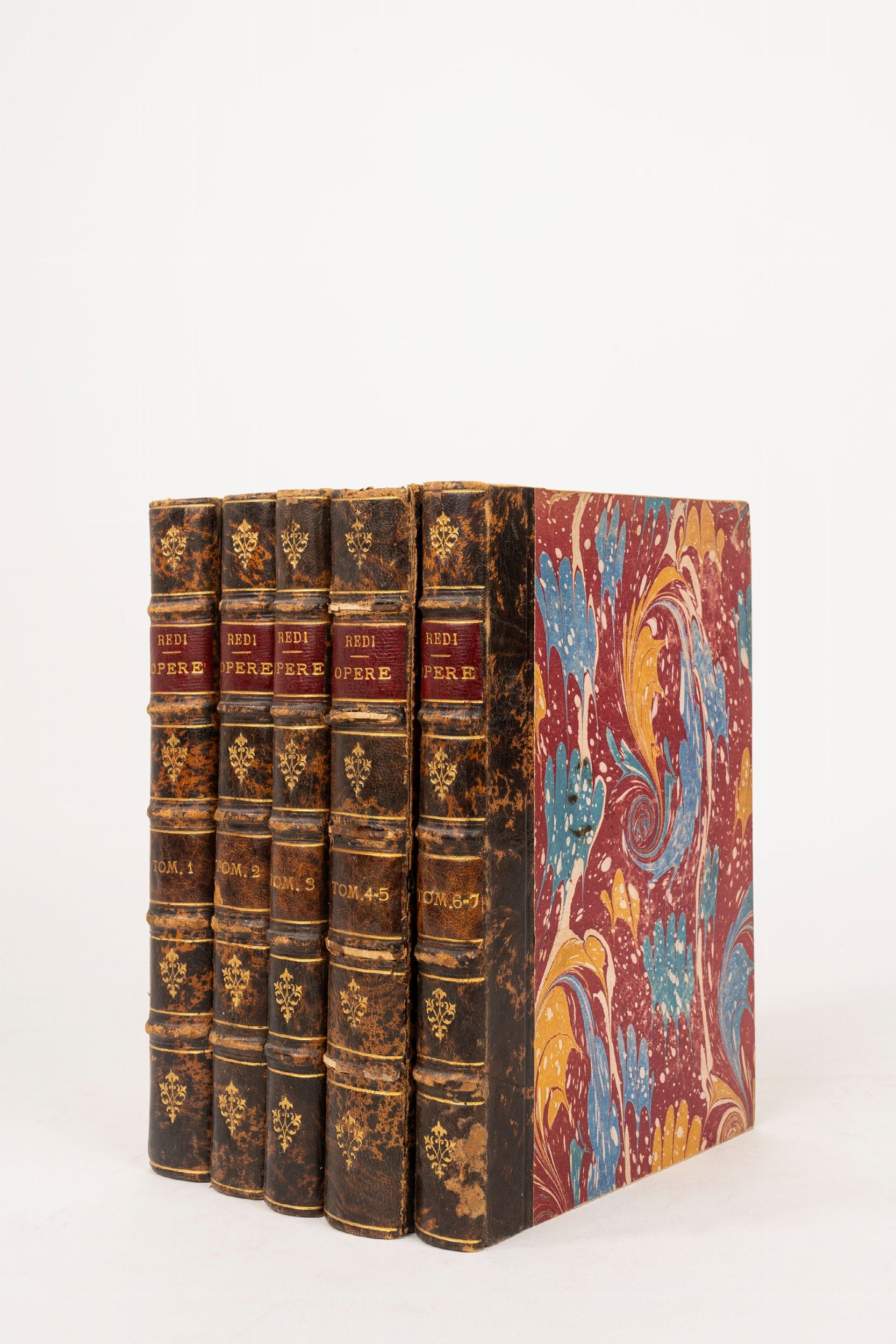 1742 Venezia, Eredi Hertz, 1742. In 4°. Sette parti in 5 voll. (1) c. (di tavola incisa ripiegata rappresentante quattro facce di moneta, una con il profilo dell'autore) 42 (4) 141 (1) 29 c. (di tavole incise), (2) 142 (2) XXVI c. (di tavole incise) 39 (3) (2) c. (di tavole incise); (8) 86 (2) 6 c. (di tavole incise), 302 (1) c. (di tavola incisa); (8) 318 (2); (20) (2) c. (di ritratti di Antonio Vallisnieri e di Francescio Redi) 467 (1); (22) (1) c. (occhietto inciso con vignetta allegorica e la scritta Lettere di Francesco Redi parte II) 319 (3); (10) (1) c. (occhietto inciso con vignetta allegorica e la scritta Opere del Redi Consulti Medici etc Tomo Sesto) 339 (1); (10) (1) c. (occhietto inciso con vignetta allegorica e la scritta Lettere di Francesco Redi parte II) 148 (1) c. (occhietto inciso con vignetta allegorica e la scritta Arianna Ditirambo del Redi) (2) 64. Sul frontespizio monogramma calcografico degli editori Hertz, altre tavole incise a piena pagina nel testo. Legatura coeva in mezza pelle maculata e cartone, i volumi raccolti entro un box di cartone marrone.
