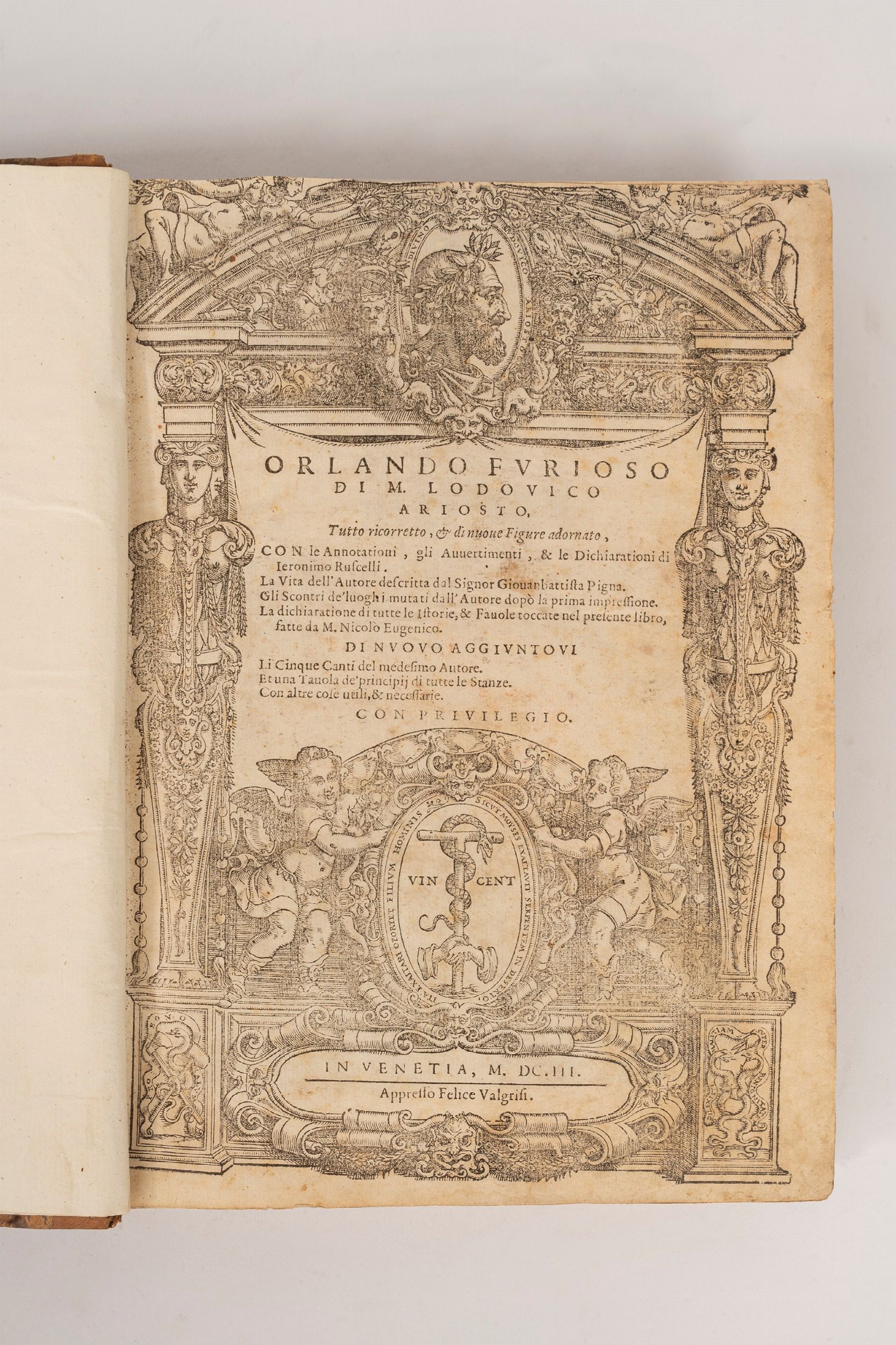 1603 Venezia, Felice Valgrisi, 1603. In 4. Titolo in elegante bordura con ritratto dell'autore e impresa tipografica, bordura silografica per gli Argomenti, iniziali, fregi e 51 belle illustrazioni in legno a piena pagina, I cinque canti con proprio frontespizio ed impresa sono impressi da Nicol Moretti, marginali fioriture, un po’ corto in testa al frontespizio che appare anche appena consunto al margine esterno, legatura moderna in mezza pelle nocciola e cartone, con titolo su tassello rosso. Ex libris moderno al contropiatto.