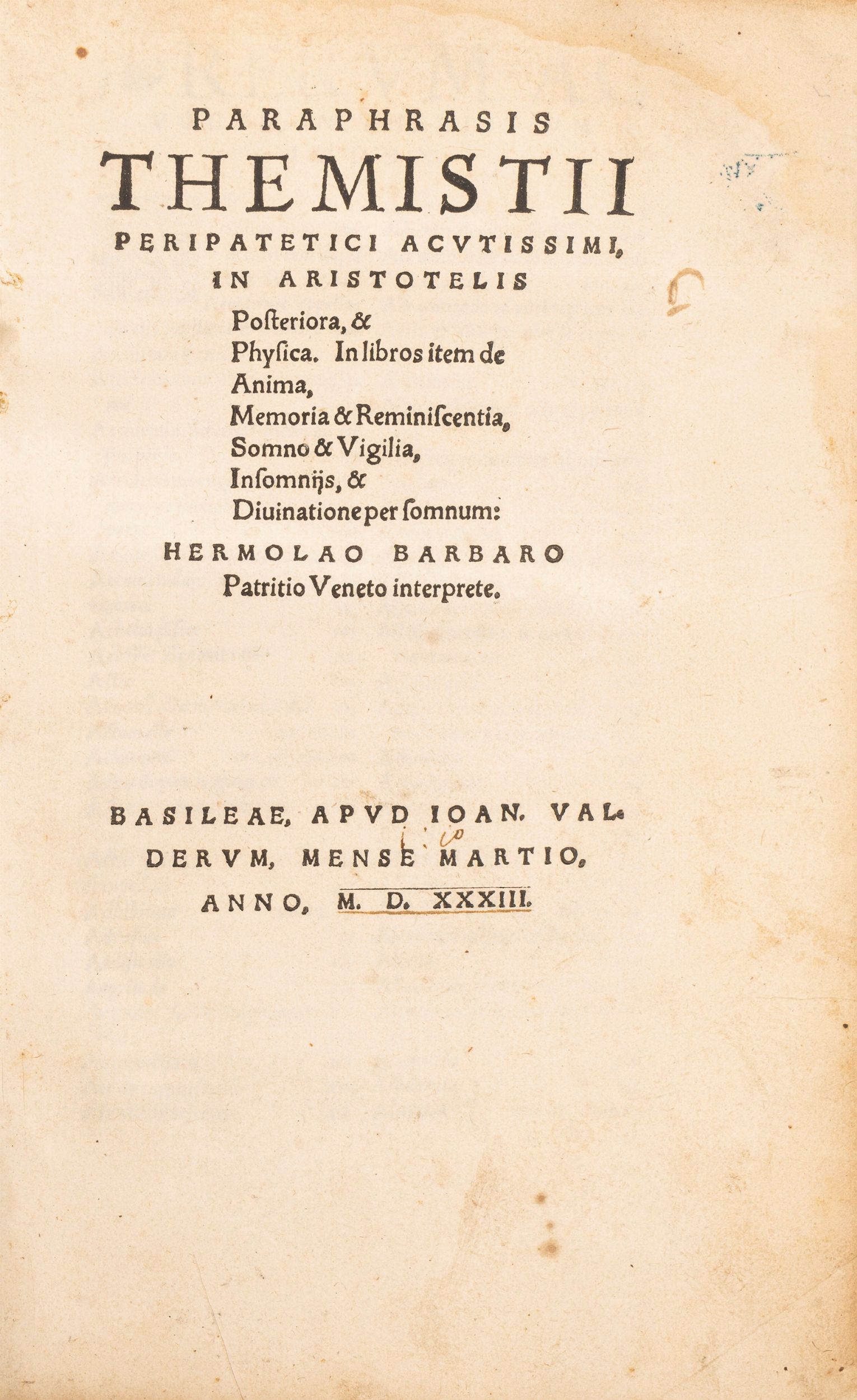 Paraphrasis Themistii peripatetici actualissimi in Aristotelis