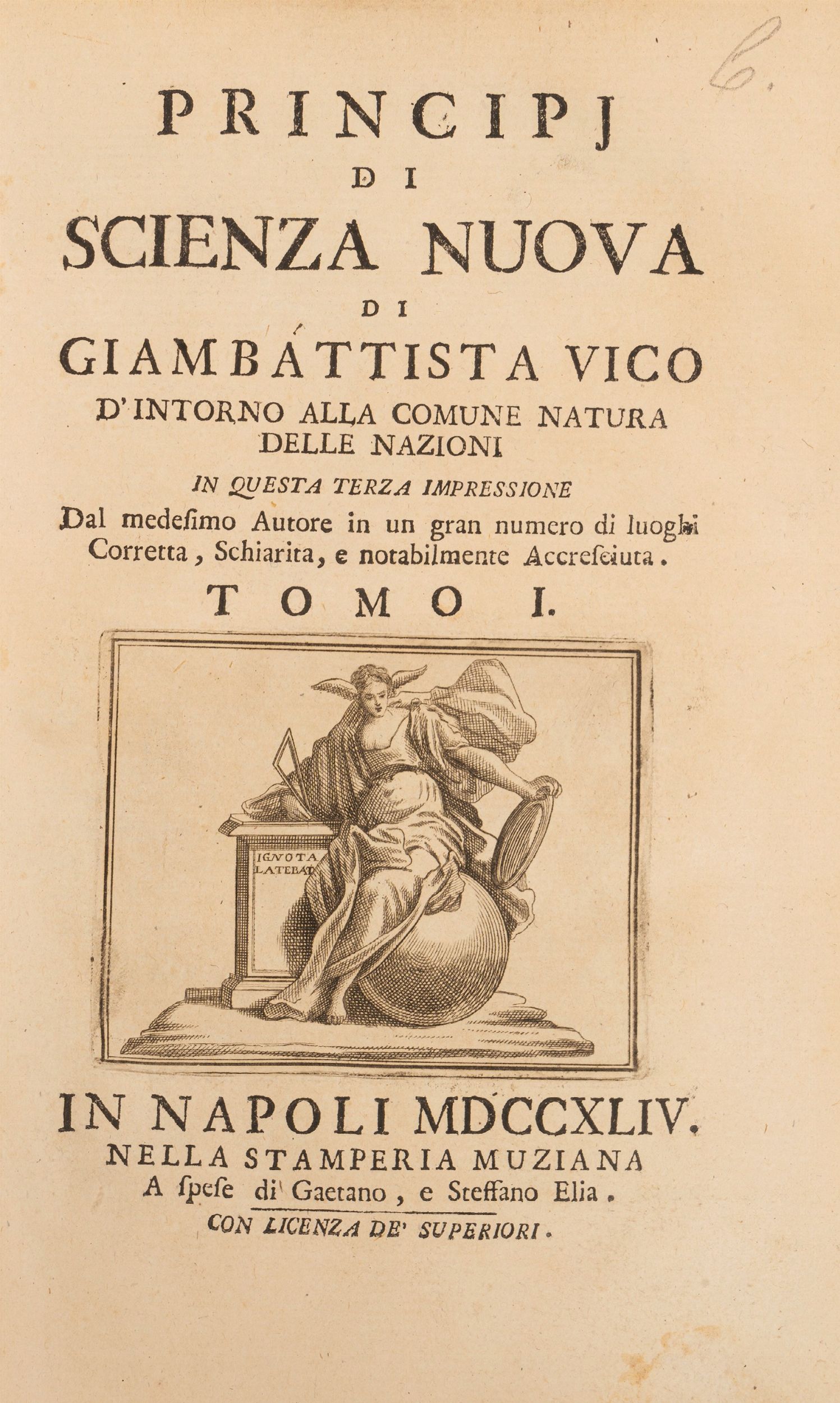 1744 Napoli, Stamperia Muziana, 1744. In 4°. Due parti (ciascuna con il proprio frontespizio) in un volume. Con il ritratto dell'Autore, un antiporta allegorica e una tavola cronologica più volte ripiegata fuori testo, il tutto finemente inciso in rame. Vignetta allegorica al primo frontespizio e fregio al secondo. Legatura in pergamena del settecento. Dorso con titolo e autore su tassello rosso.