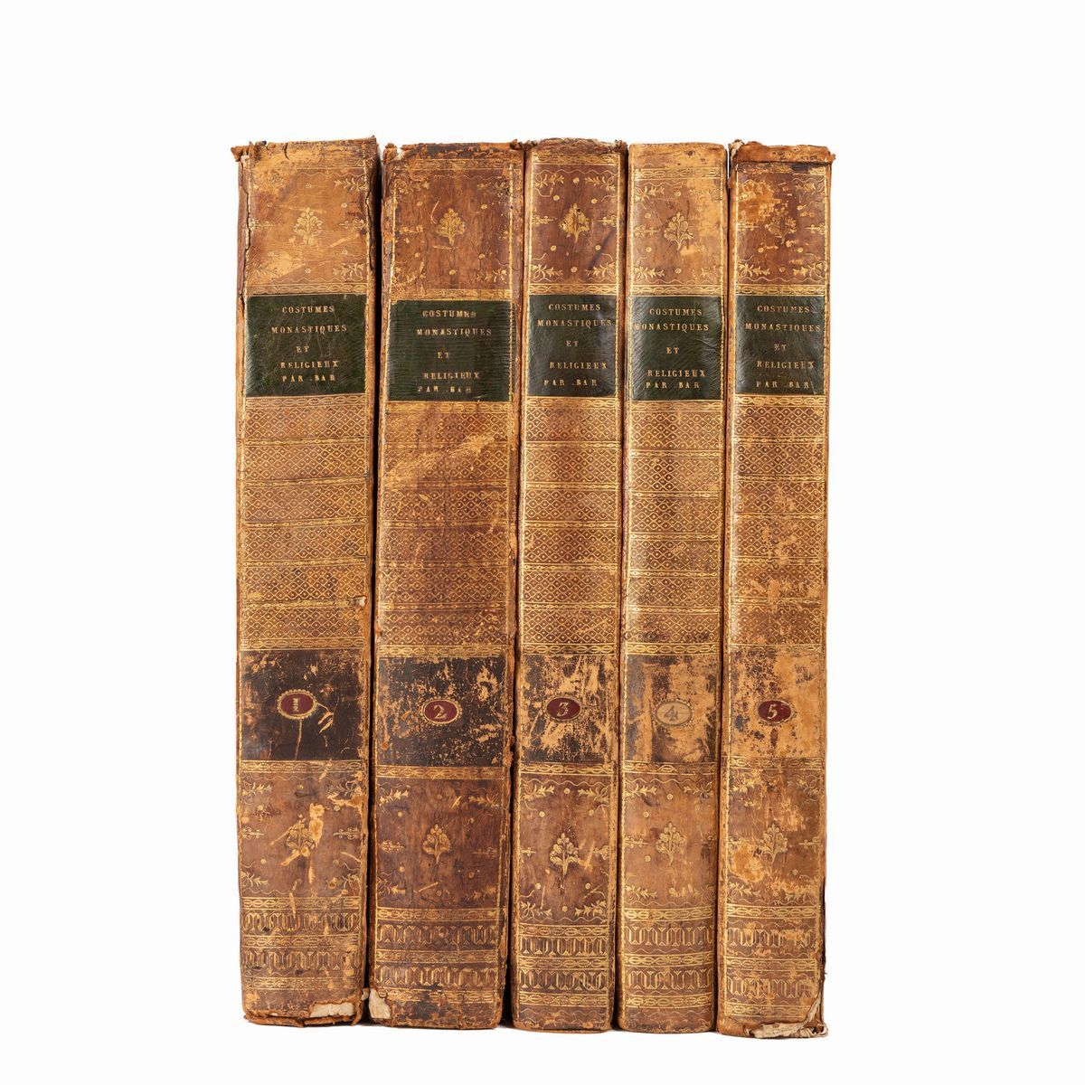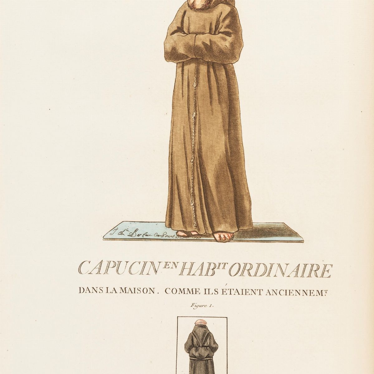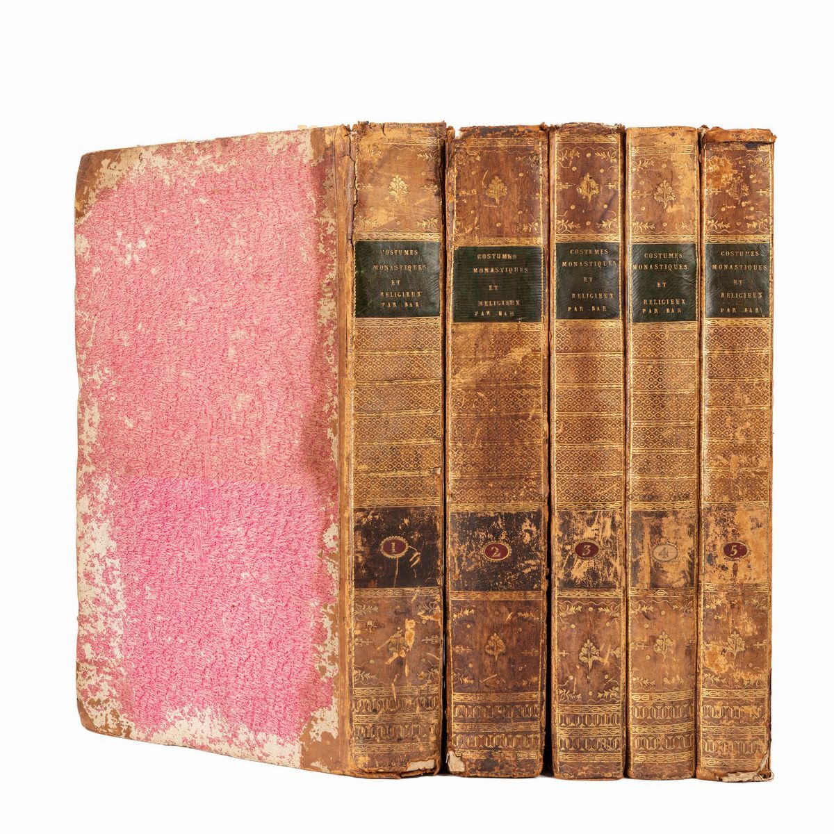 1778 Paris, chez l'auteur, 1778-1791. In 2°. 6 tomi in 5 volumi. Antiporte, titoli incisi con vignetta a colori, frontespizi incisi e colorati, oltre 500 tavole di costumi incise 'à la manière noire' e colorate dallo stesso Bar, carte di testo in azzurro, ESEMPLARE IN BARBE , legatura in mezza pelle e cartonato rosa con titoli al dorso.