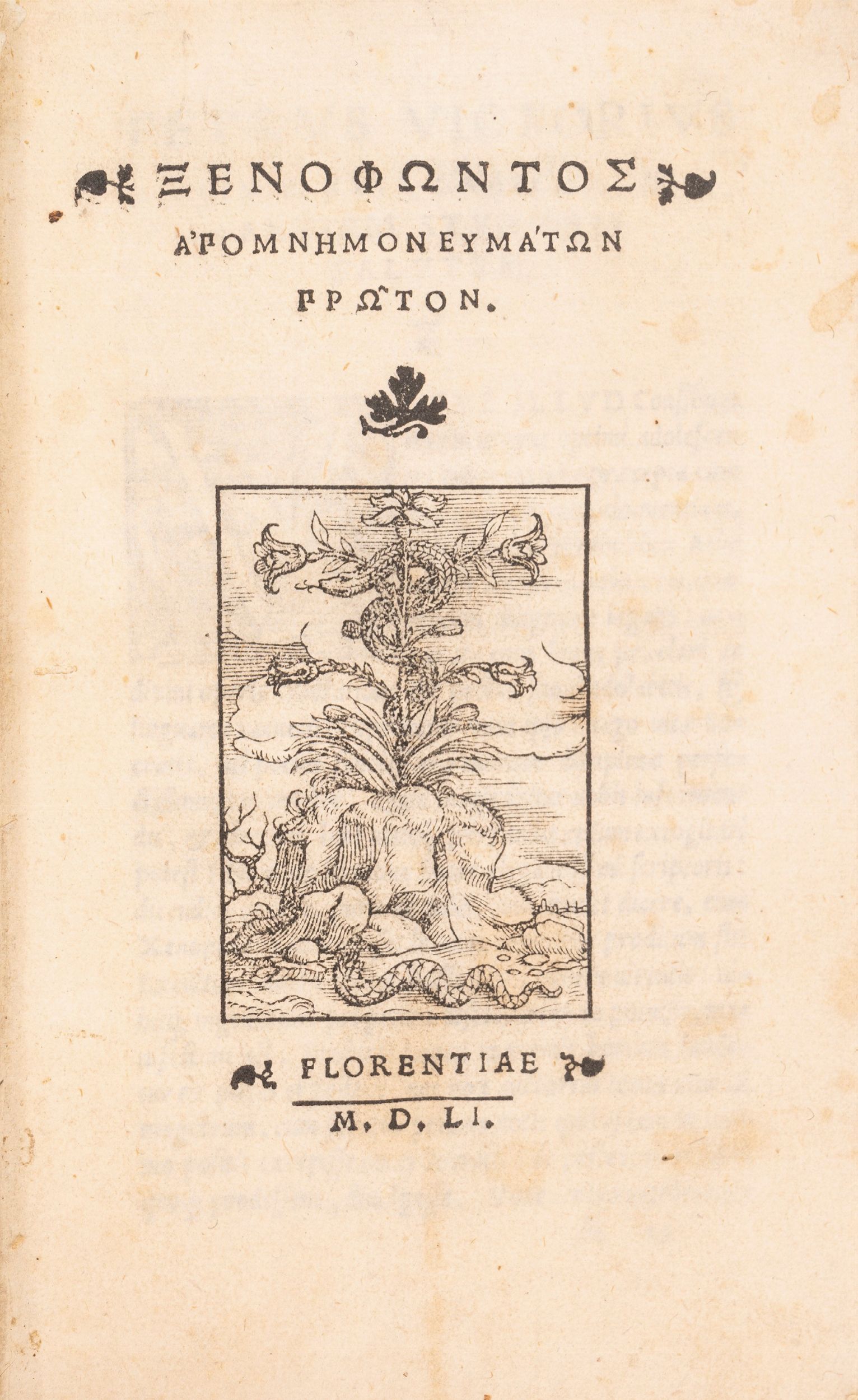 1551 Firenze, appresso i Giunti, 1551, 8°. Legatura in pergamena floscia e tassello con titolo. Testo in greco. Marca tipografica al frontespizio e capolettera xilografici. Lievi difetti.
