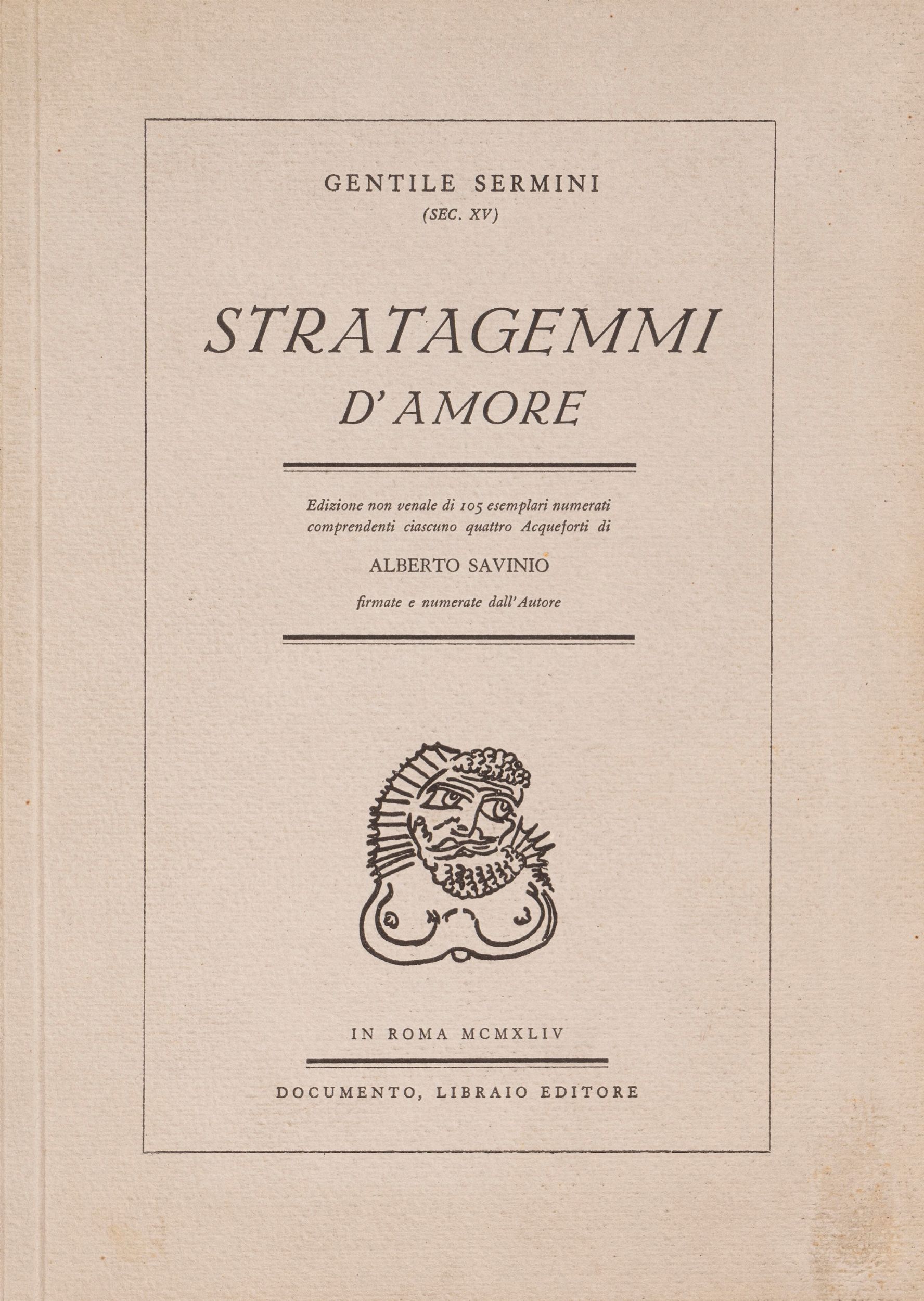 1944 Roma, Documento, 1944. In 8°. Capilettera figurati. Con quattro acqueforti su fogli sciolti di Alberto Savinio firmate e numerate dall'autore («Incontro», «Idillio», «La civetta», «Love call»), qualche alone marginale, brunitura alla carta de «La civetta». Brossura in cartoncino grigio stampato in nero al piatto anteriore, con un piccolo disegno al tratto di Savinio stampigliato al centro della copertina. Esemplare 97/105.
