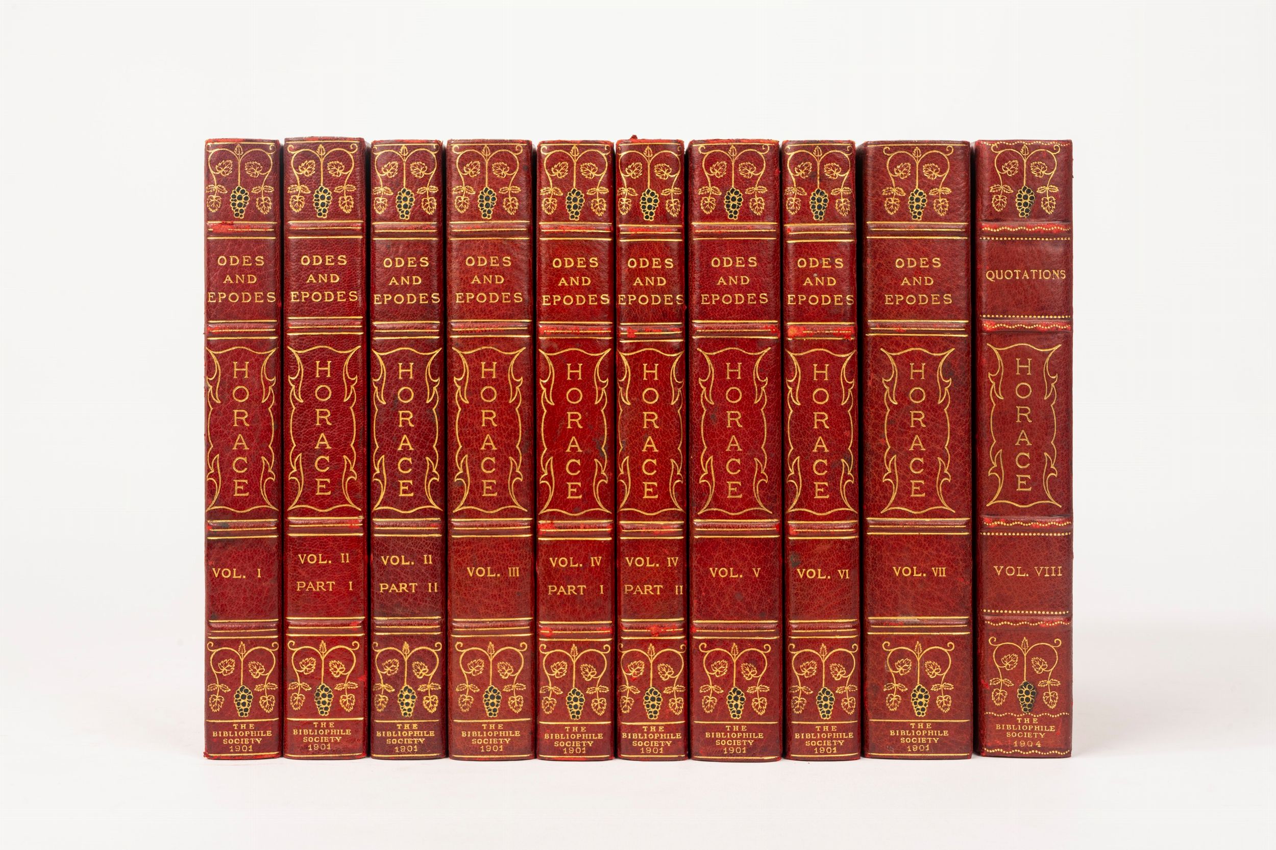 1901 Boston, Bibliophile Society, 1901-04. In 10 volumi (sette parti in nove volumi, più un volume 'A Thousand Horatian Quotations'). In 4°. Illustrato con frontespizi e tavole incise in due stati, da Howard Pyle, W.H.W. Bicknell, James Fagan e Edmund Garrett, con il primo stato di ogni tavola firmato dall'artista a matita e ciascuna protetta da una velina, numerose testatine e finalini e altre illustrazioni nel testo e riproduzioni fotografiche nel volume finale. Bella legatura in marocchino rosso con ricchi fregi fitomorfi a colori e in oro ai piatti, dorso a quattro nervi con titoli e fregi in oro, lievi difetti su alcune legature.