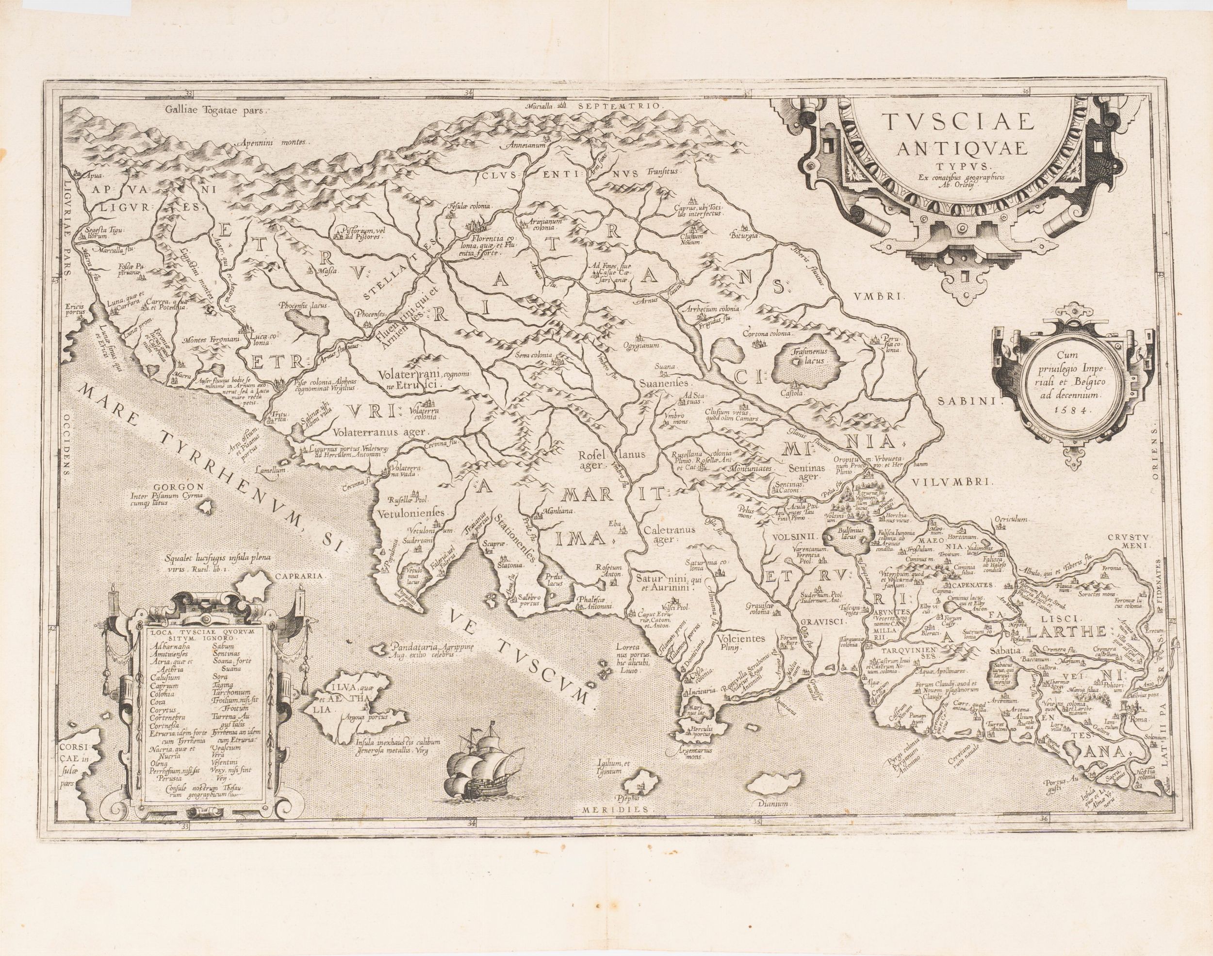 1584 ca. Incisione su rame, Anversa, 1584 ca., cm 41x50. Cum privilegio Imperiali et Belgico, titolo entro cartiglio, testo in latino al verso. Rinforzo alla piegatura centrale che copre parzialmente il testo. Con passepartout.
