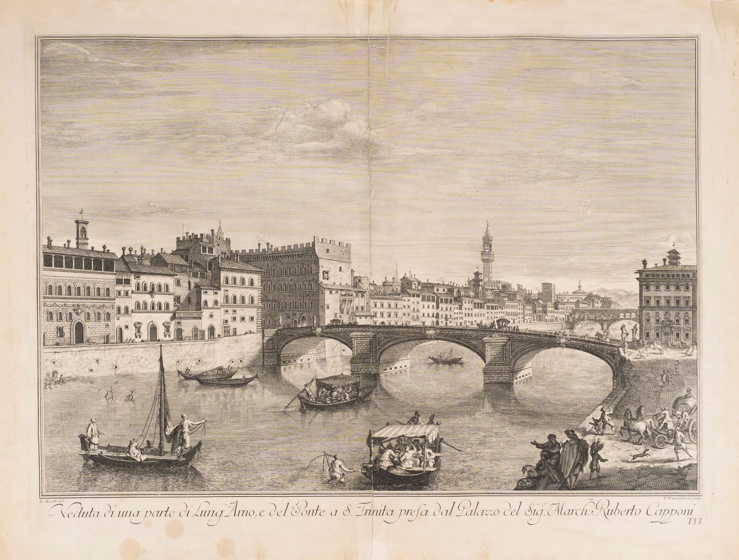 1744 Firenze, 1744. Acquaforte tratta da 'Scelta di XXIV vedute delle Principali Contrade, Piazze, Chiese e Palazzi della Città di Firenze', edito da G. Allegrini, mm 510x704 all'impronta della lastra, mm 580x765 il foglio. In basso a sinistra: 'Io. Zocchi del.', in basso a destra: 'V. Franceschini sculp.' Montata entro passepartout. Usuale piegatura centrale, piccoli strappi e restauri, qualche macchia di umidità.
