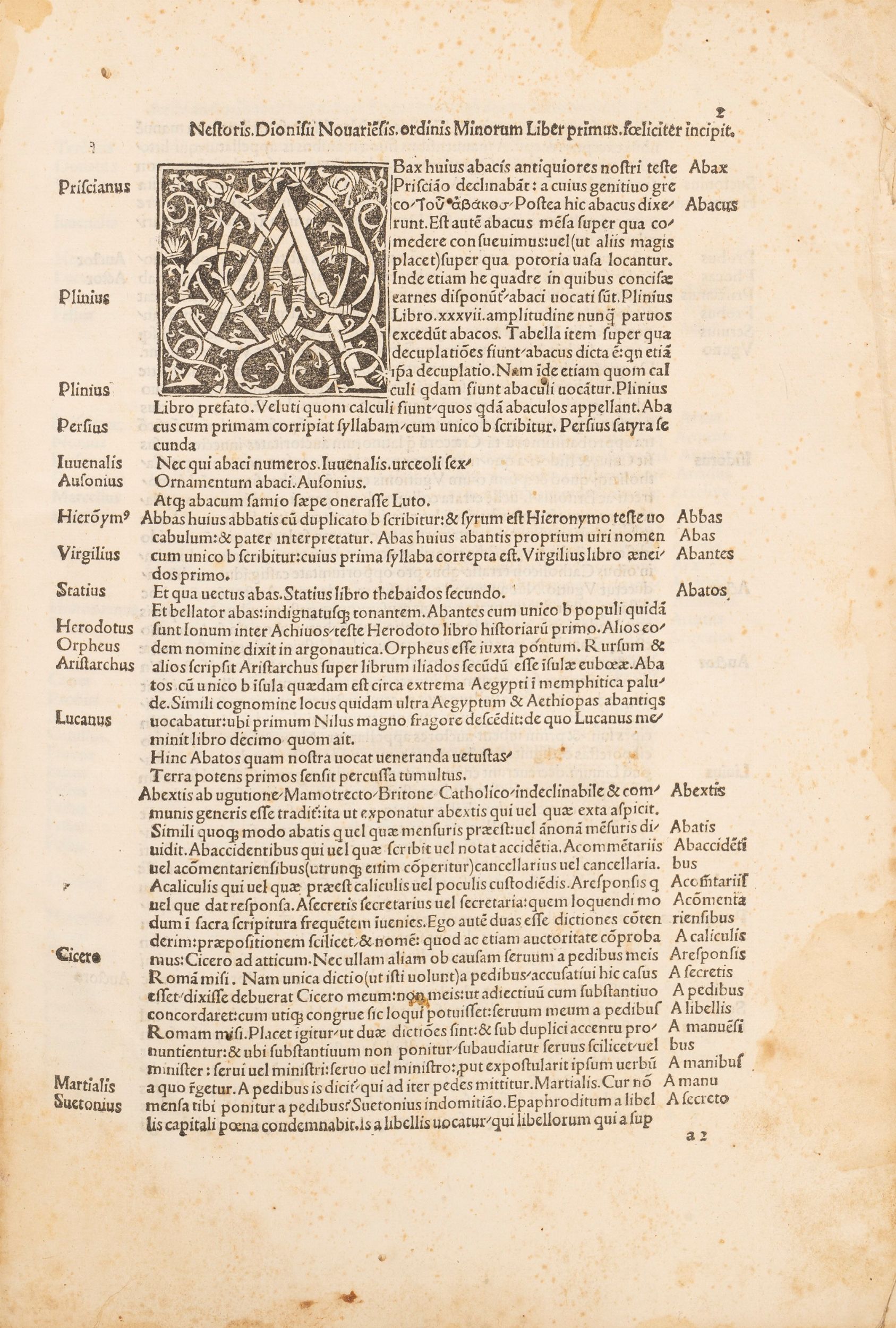 1488 [Venezia, Guglielmo Anima Mia, 1488]. In 2°. 185 carte (su 186). A carta a1v dedica a Lodovico Sforza, grande iniziale silografica su fondo nero al recto di carta a2, rinforzo alla prima carta brunita, macchie e gore d’acqua, diverse carte brunite, foro di tarlo che corre lungo il testo per circa 80 carte, mancante l’ultima carta bianca, legatura moderna in mezza pelle marrone. Antica nota di possesso al recto della prima carta.