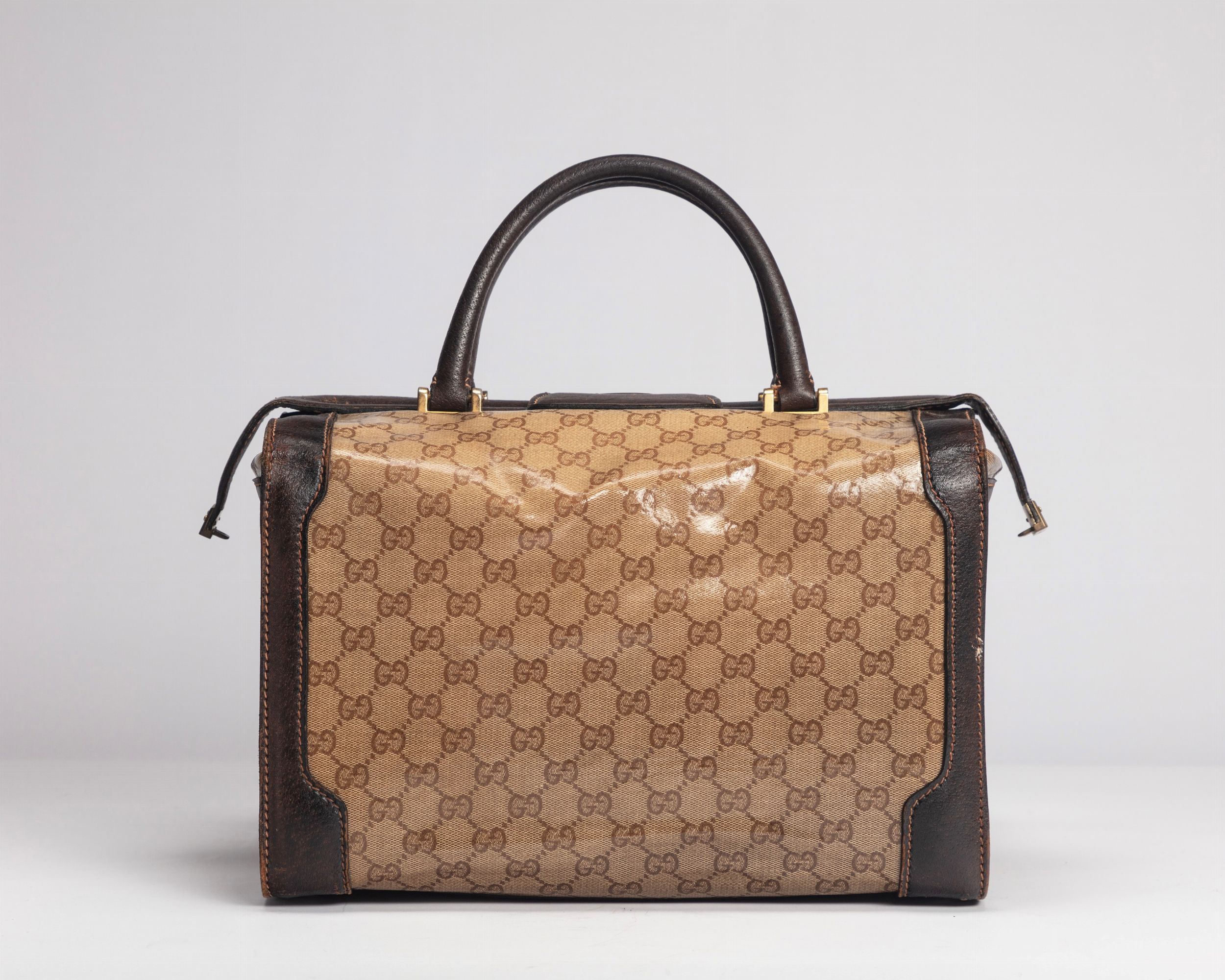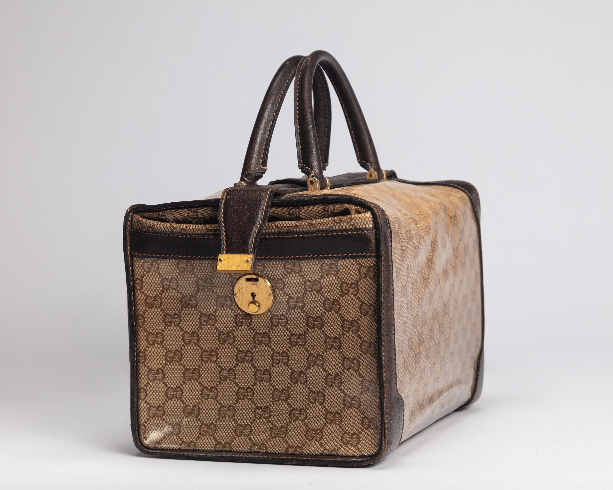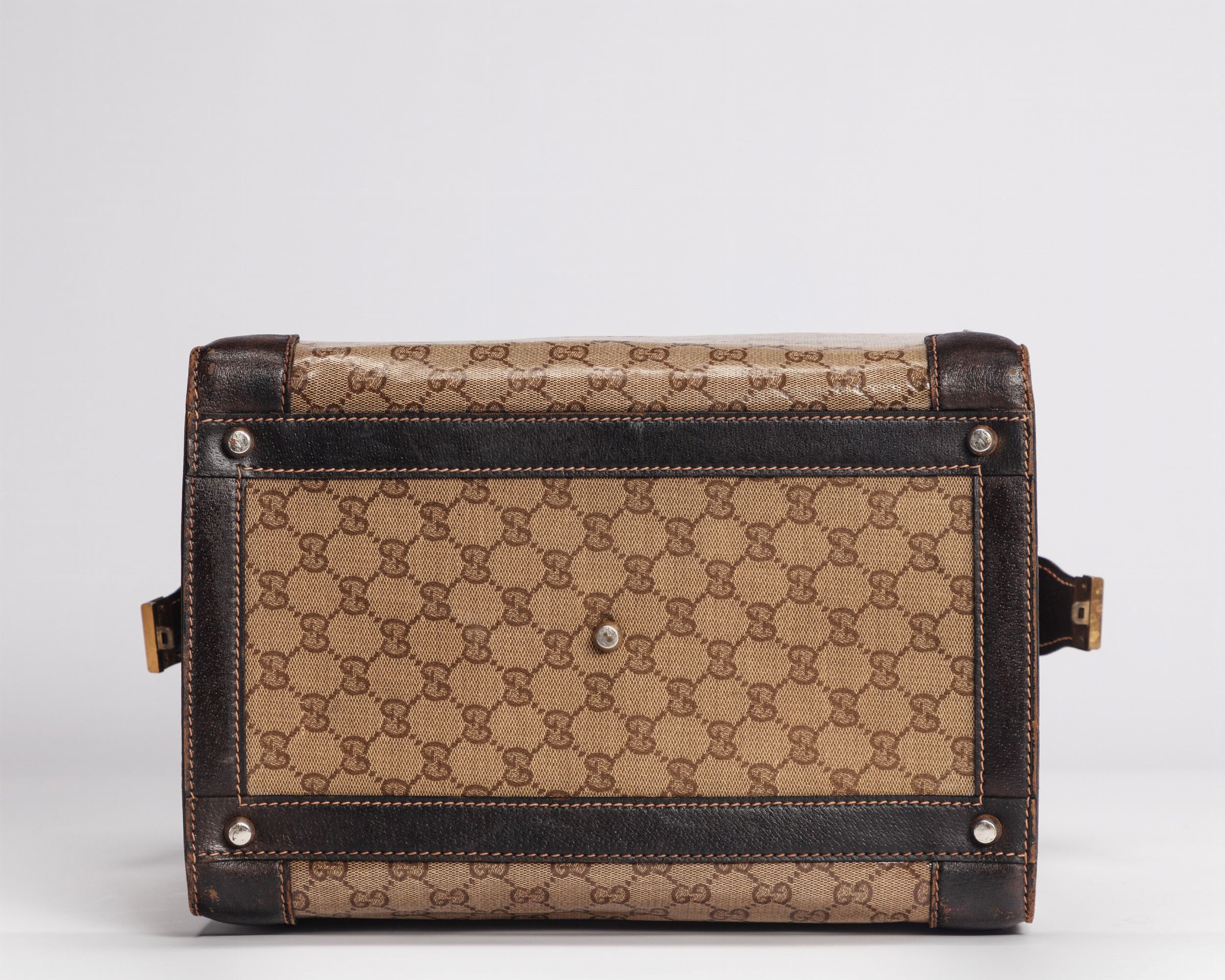 in tela monogrammata e plastificata, profili e manici in pelle di cinghiale color marrone, dettagli in metallo dorato, cm 33 x 22 x 22 (difetti)