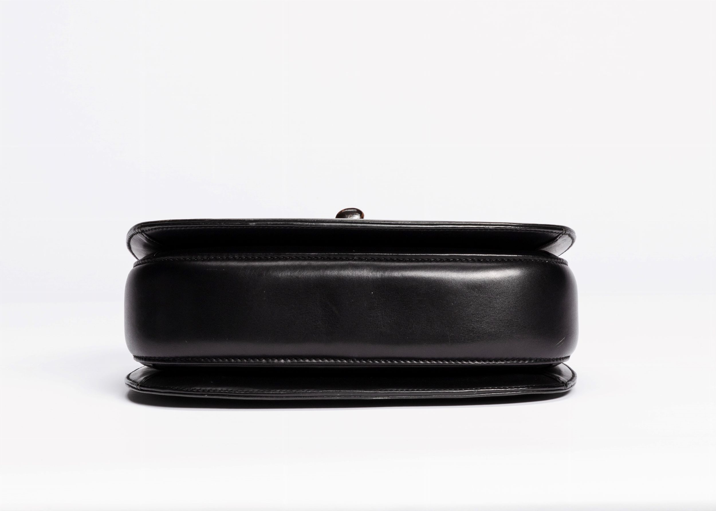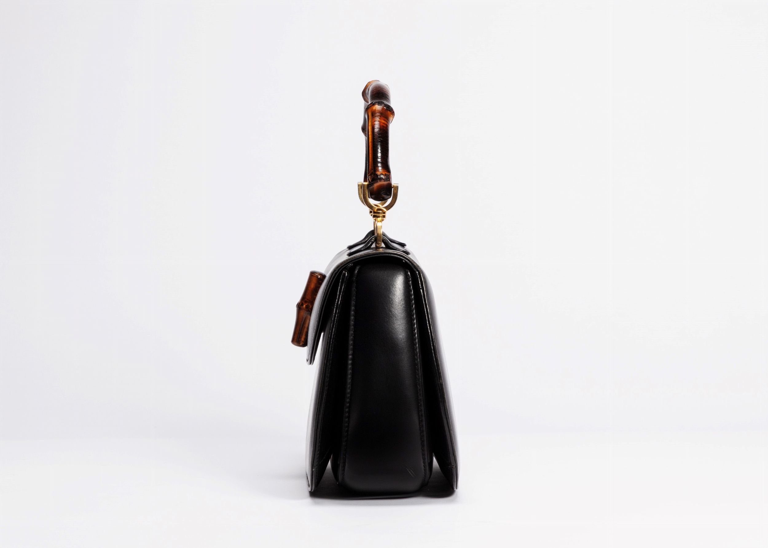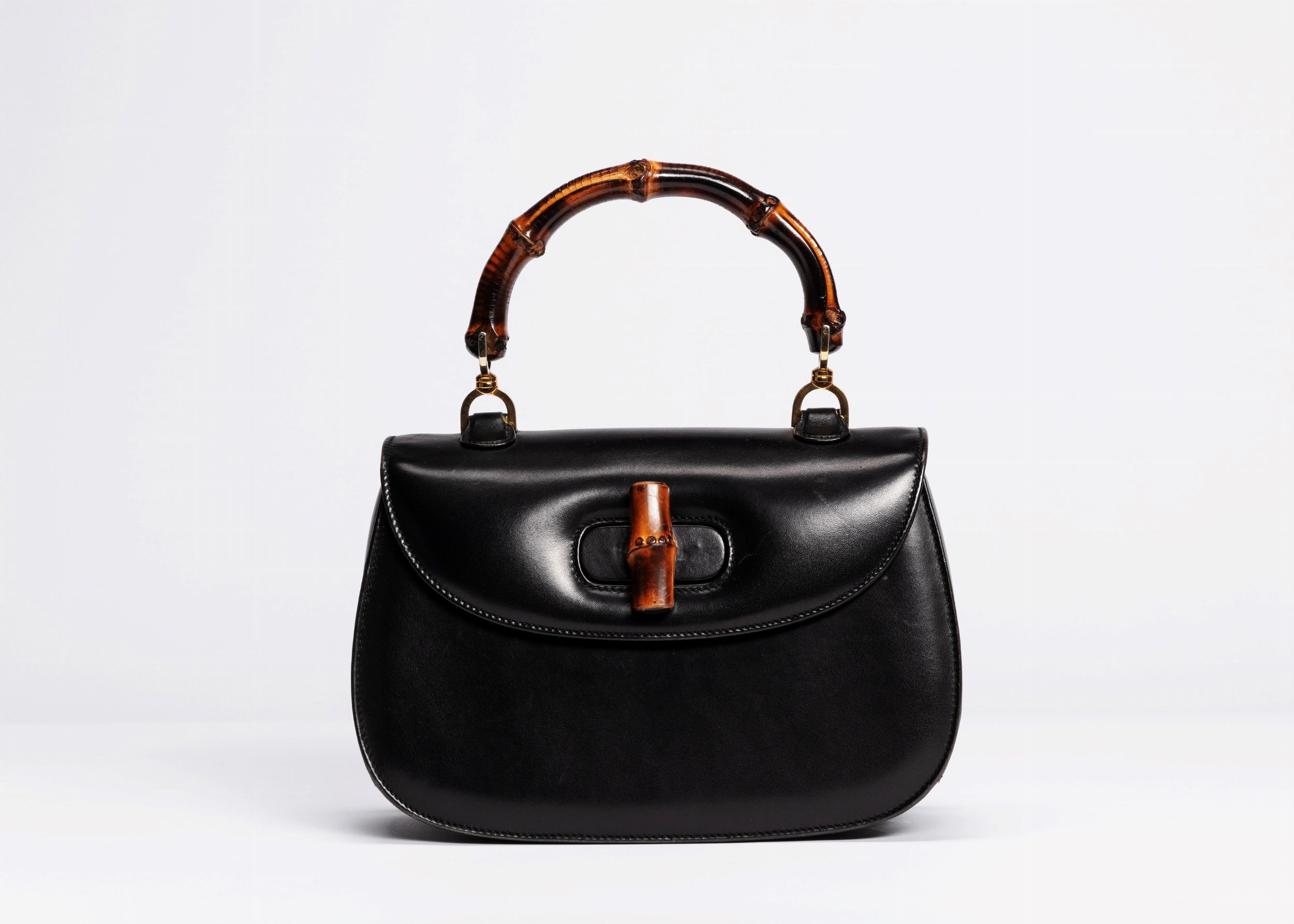 in pelle color nero, chiusura e manico in bambù in pelle color rosso, dettagli in metallo dorato, cm 26, con sacchetto (lievissimi difetti)