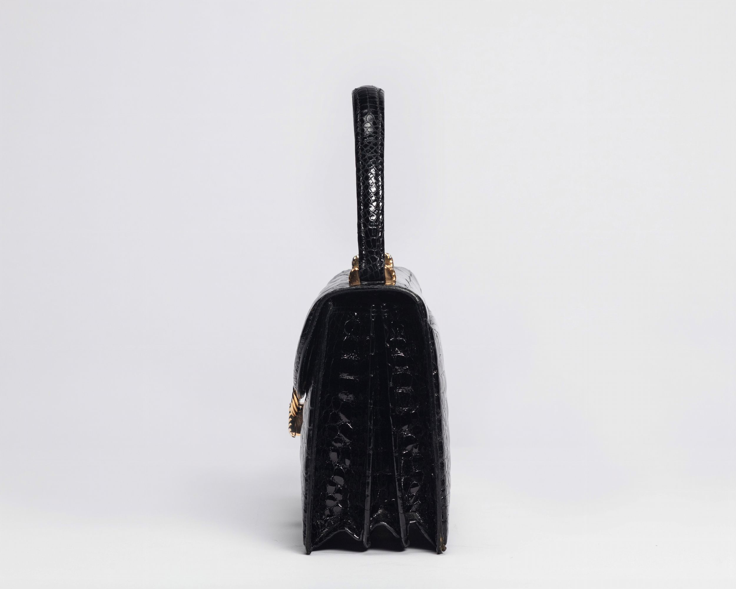 in coccodrillo color nero, manico stondato, chiusura in metallo dorato, interno in pelle, fine anni '60, cm 22, con sacchetto (lievi difetti), (pre convenzione Cites) Questa borsa è soggetta alle restrizioni di esportazione\importazione Cites e sarà richiesto un permesso di esportazione\importazione per spedire la borsa al di fuori dell'UE dopo la vendita all'asta. Gli acquirenti sono responsabili dell'ottenimento e del pagamento del permesso. L'uso commerciale di questo articolo è autorizzato solo nell'UE.