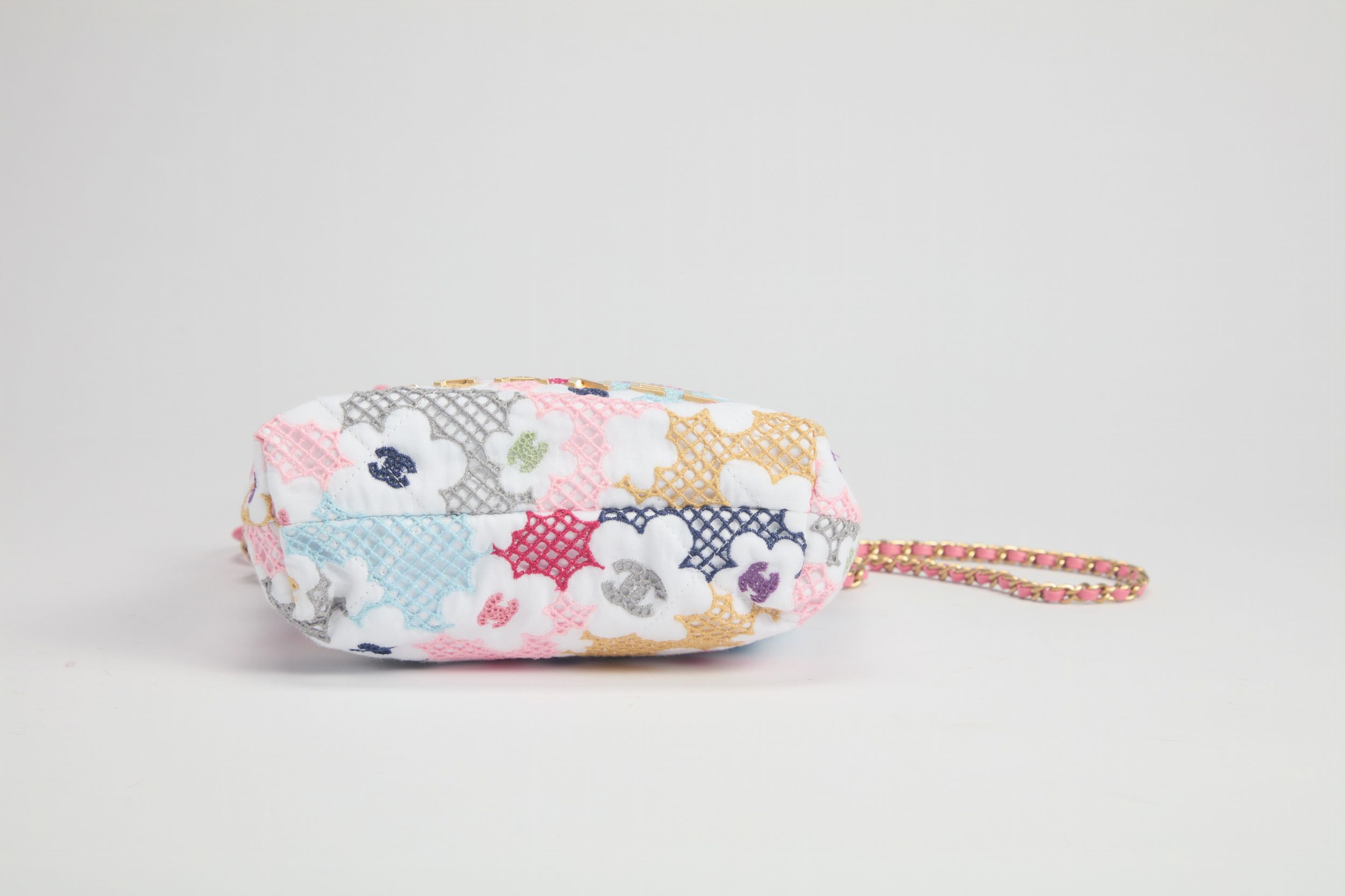 2024 in tessuto con ricami e motivi foreali colorati, tracolla a catena e in pelle color rosa, dettagli in metallo dorato satinato, cm 23, con sacchetto (nuova e mai usata)