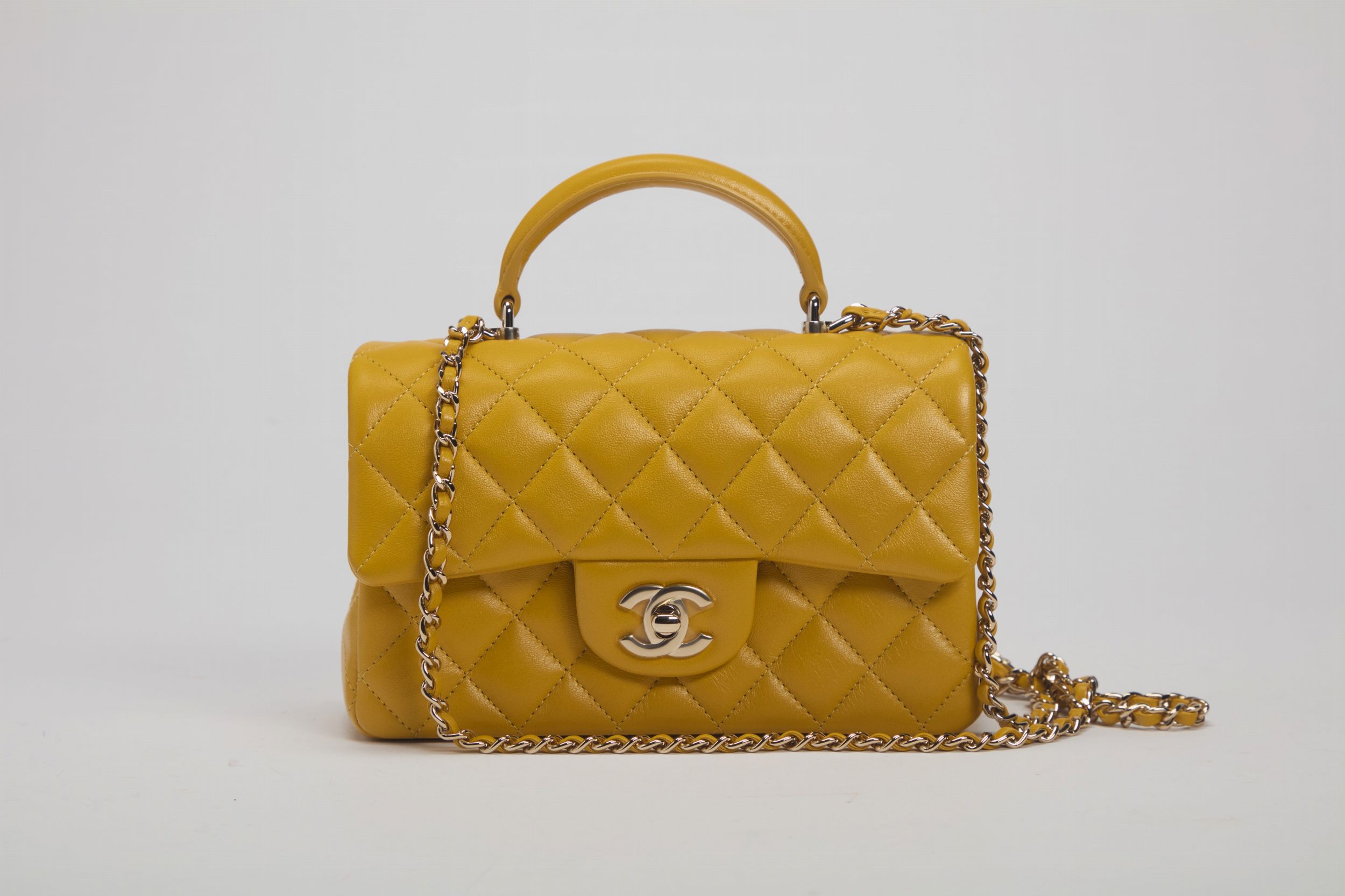 2022 in pelle color senape matelassé, tracolla a catena, cm 20, con sacchetto