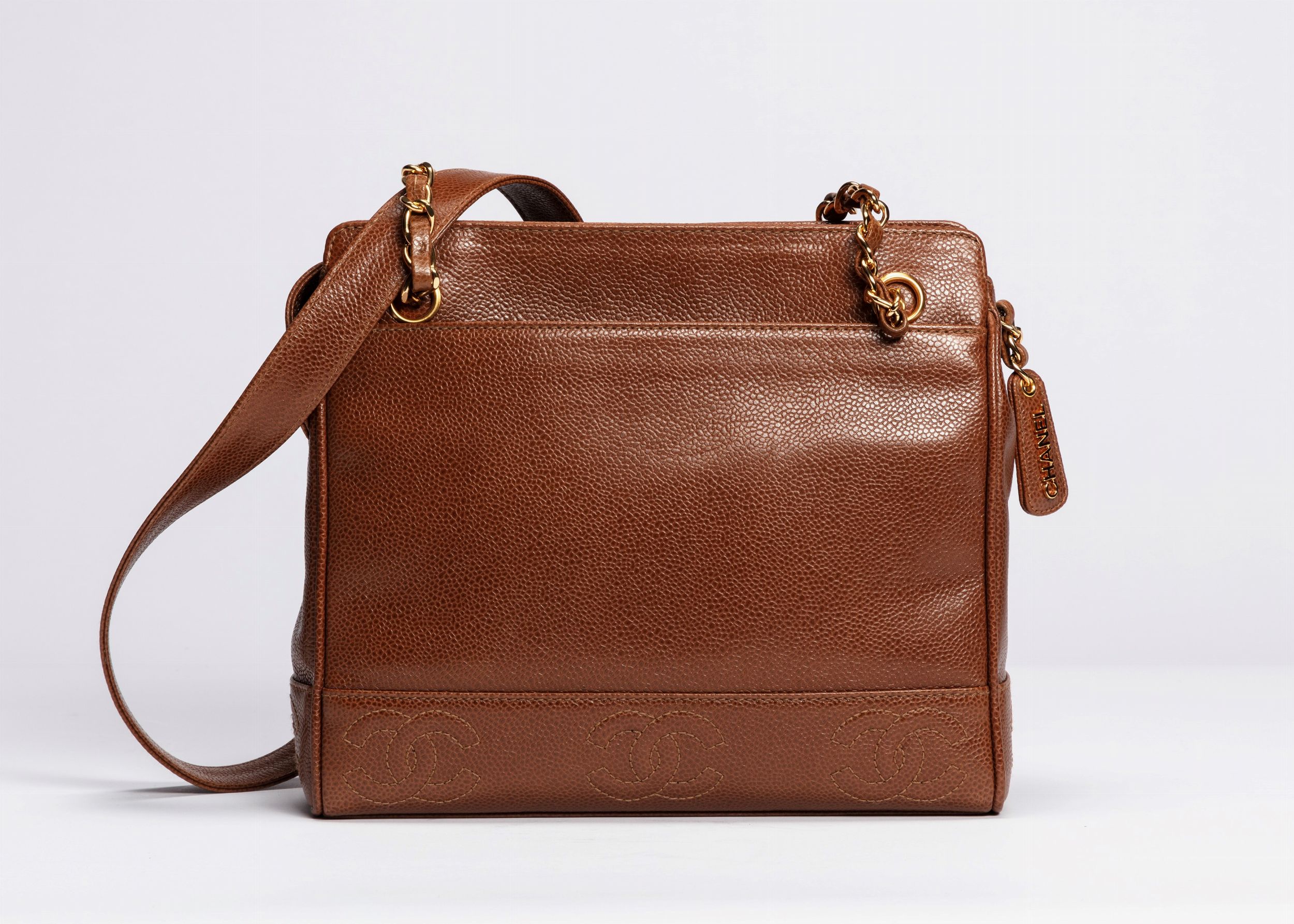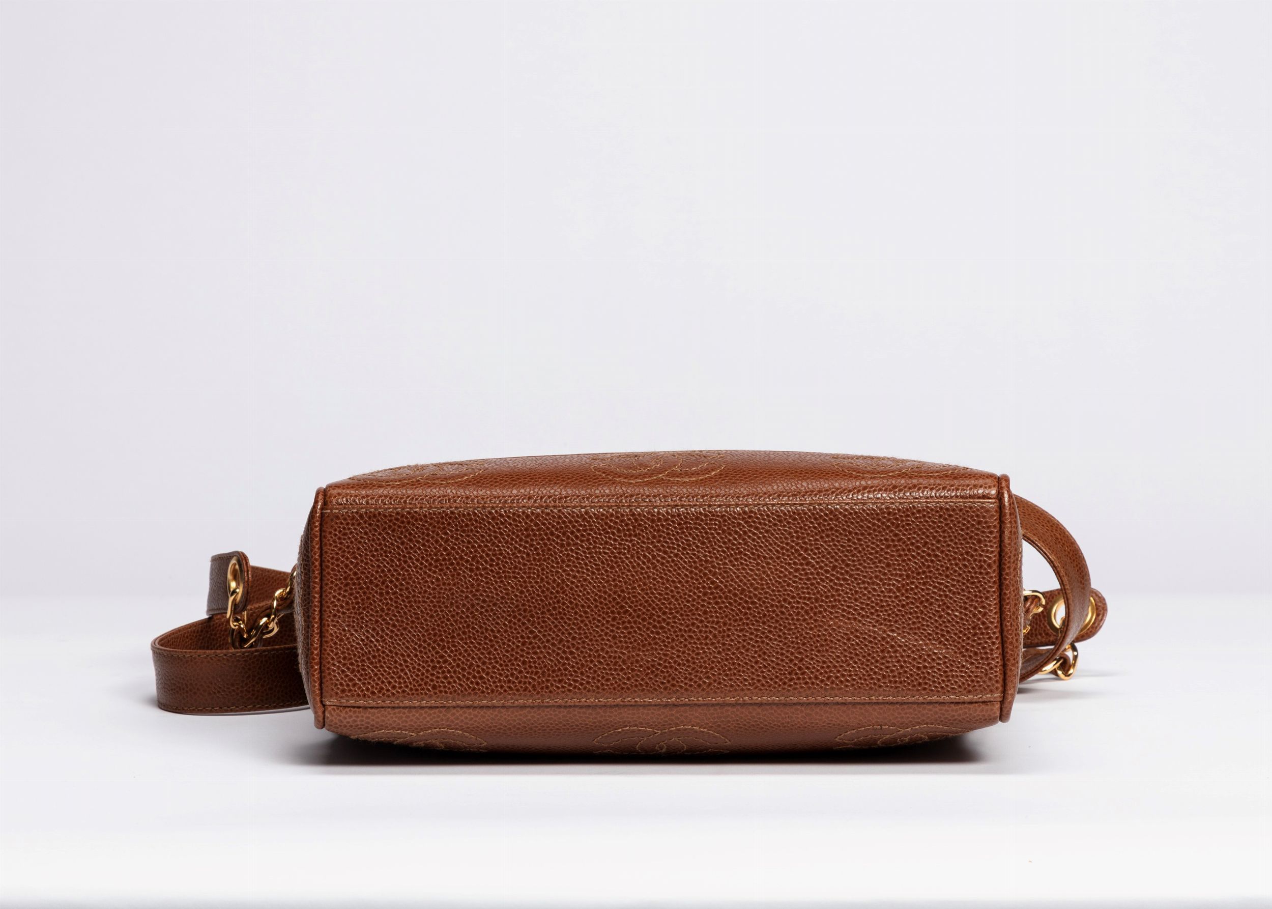 1996 in pelle caviar color tabacco, tracolla a catena, dettagli in metallo dorato, cm 25, con sacchetto (lievi difetti)