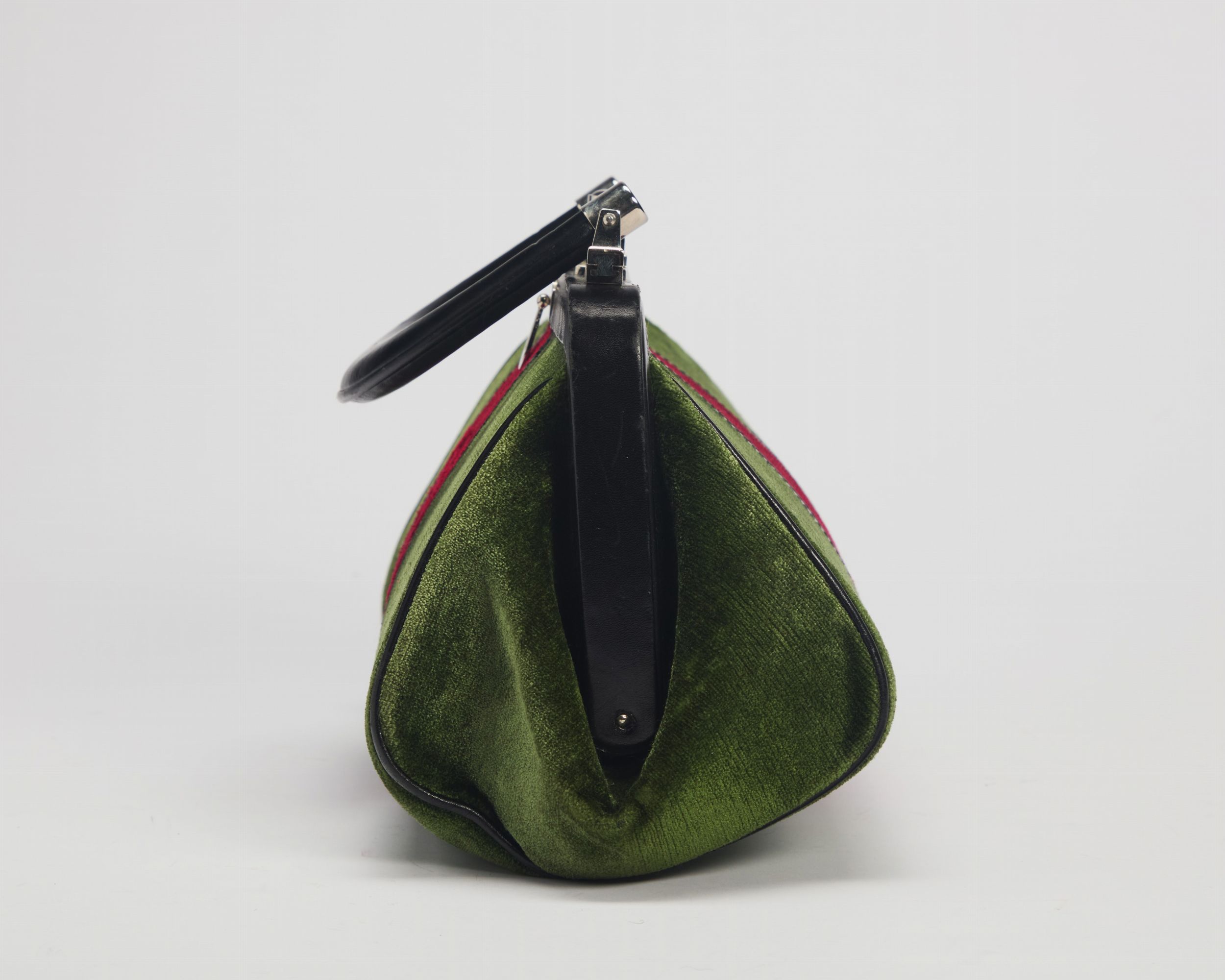 in velluto color verde e rosso, profili e manico in pelle color nero, cm 28, con sacchetto (lievi difetti)