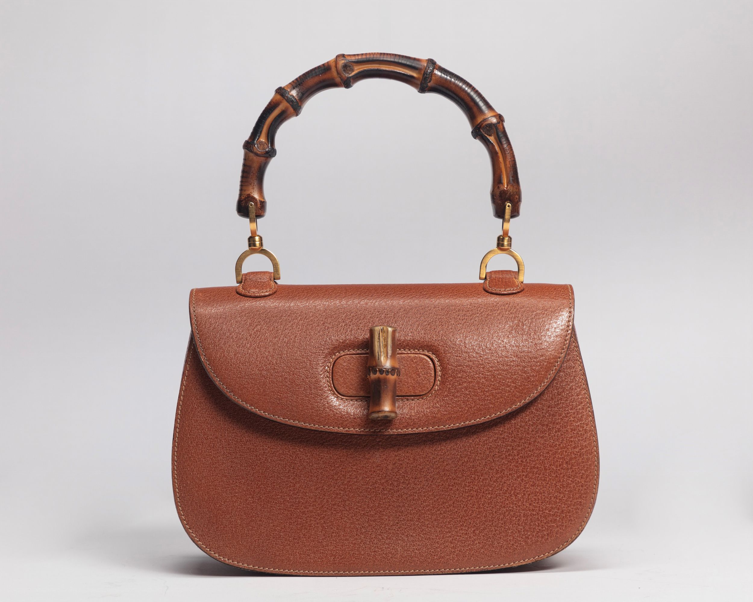in pelle di cinghiale color nocciola, tracolla staccabile, chiusura e manico in bambù, dettagli in metallo dorato, cm 26, con sacchetto (difetti)
