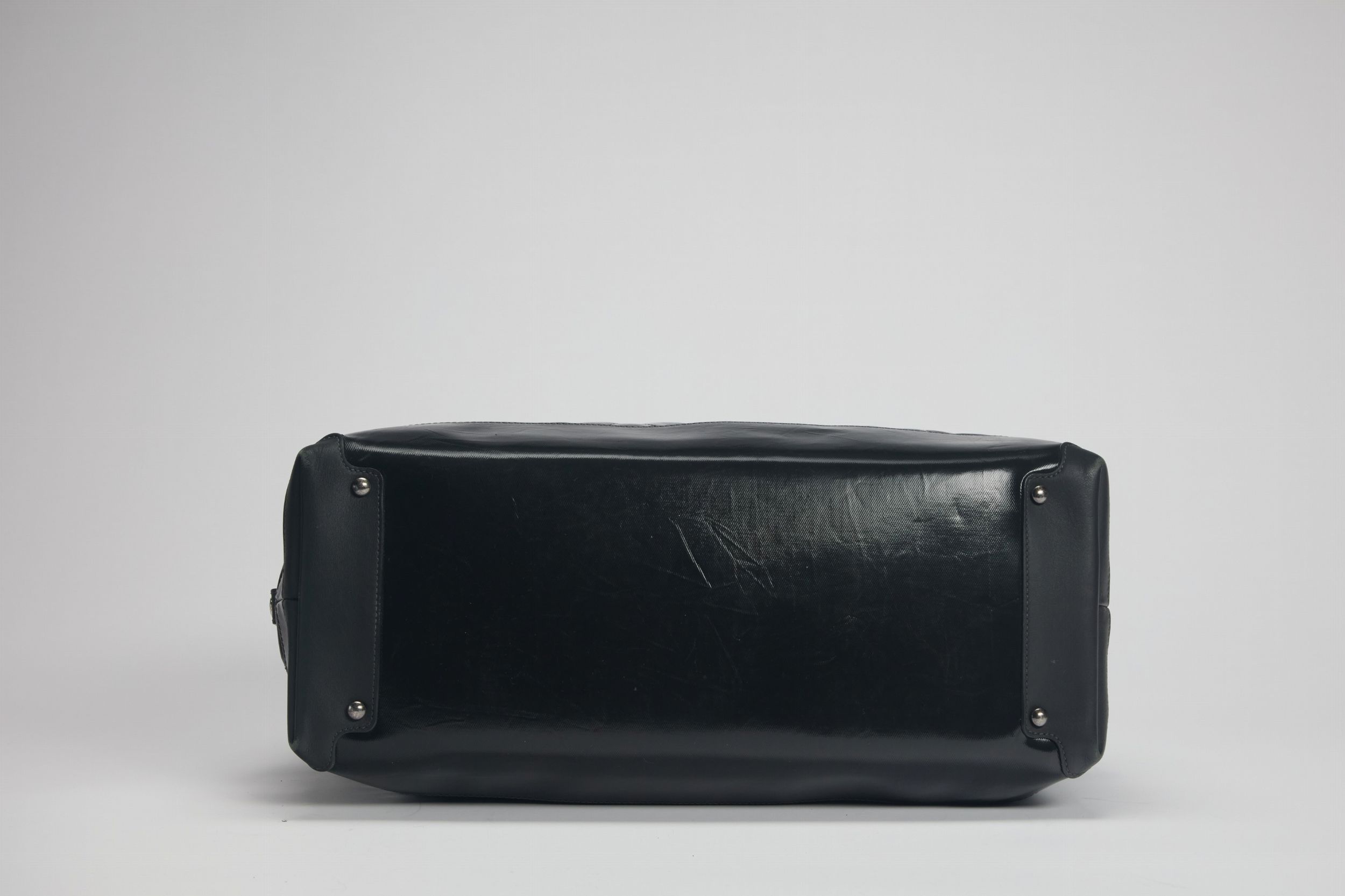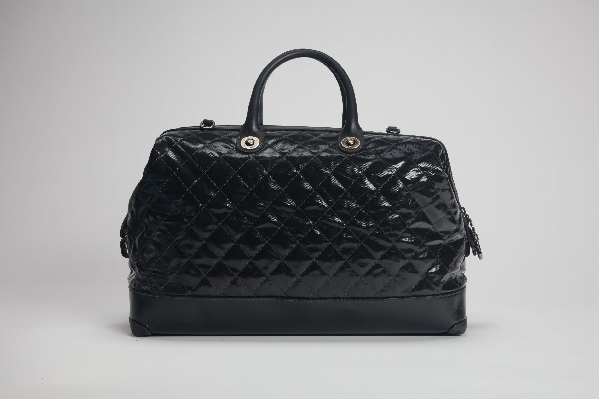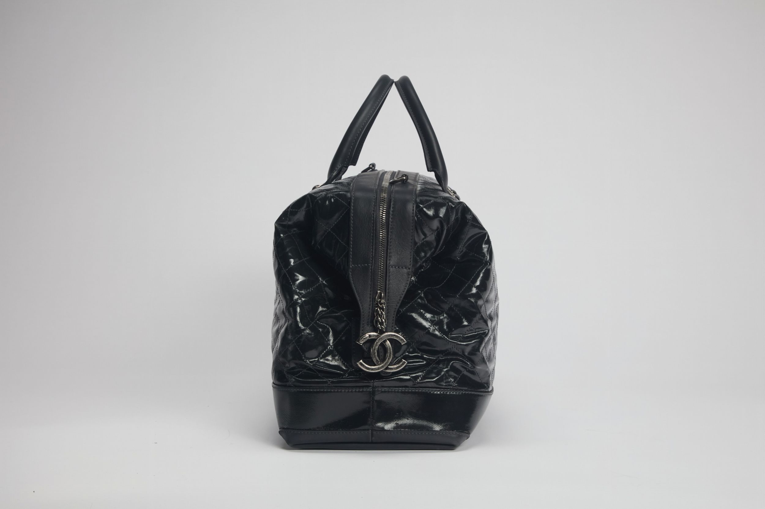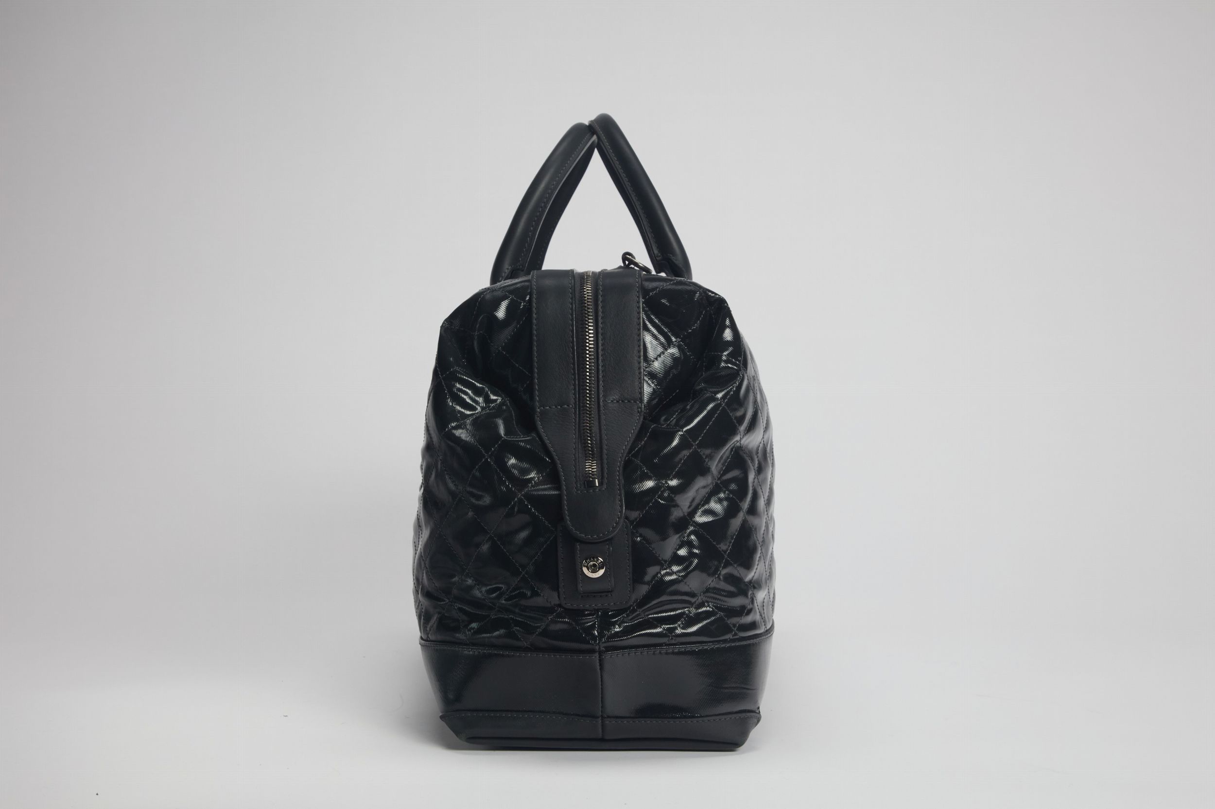 2012 in vernice matelassé color grigio antracite, doppi manici e profili in pelle, dettagli in metallo brunito, chiusura con cerniera, con sacchetto, cm 43 (lievi difetti)