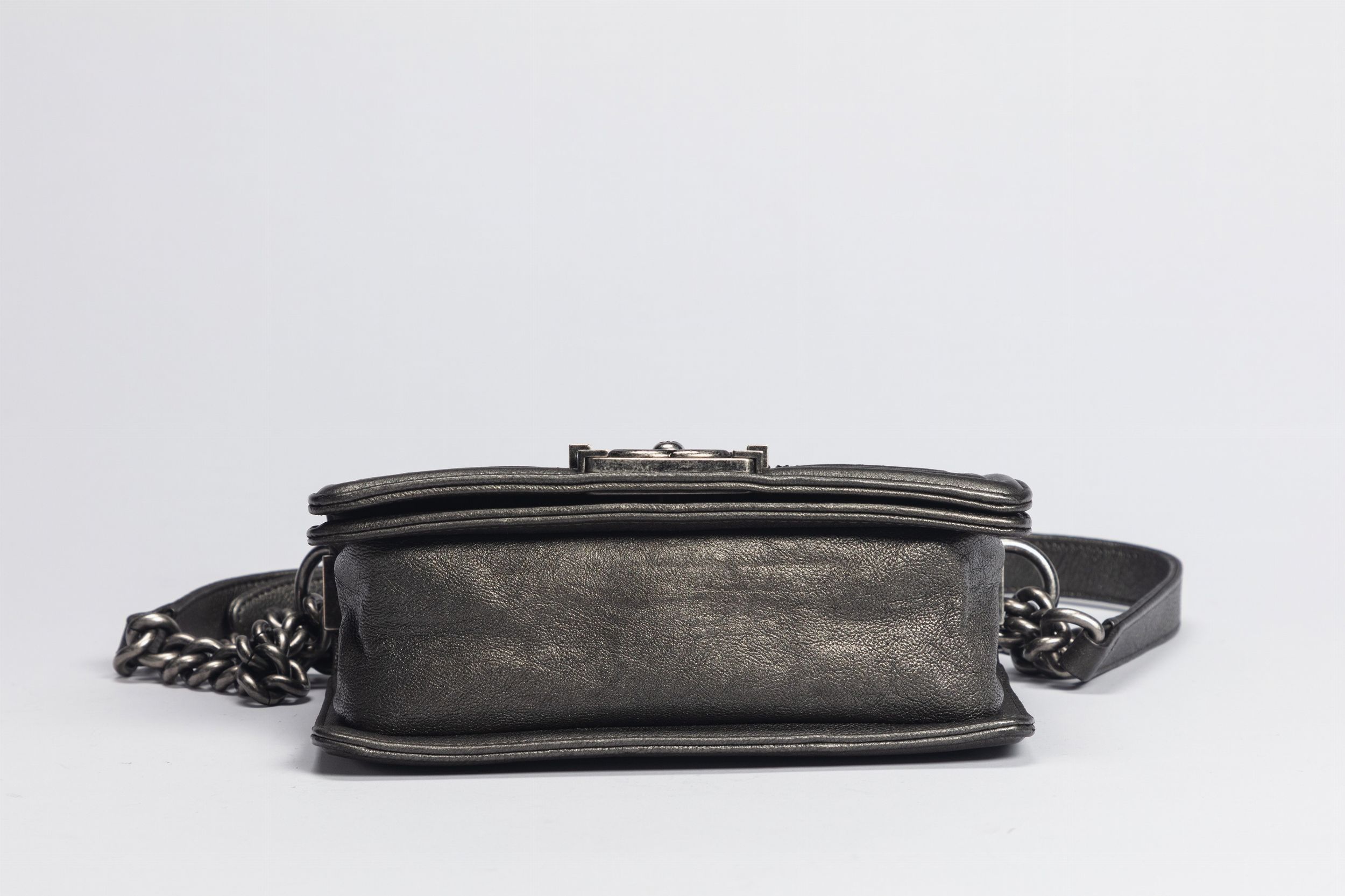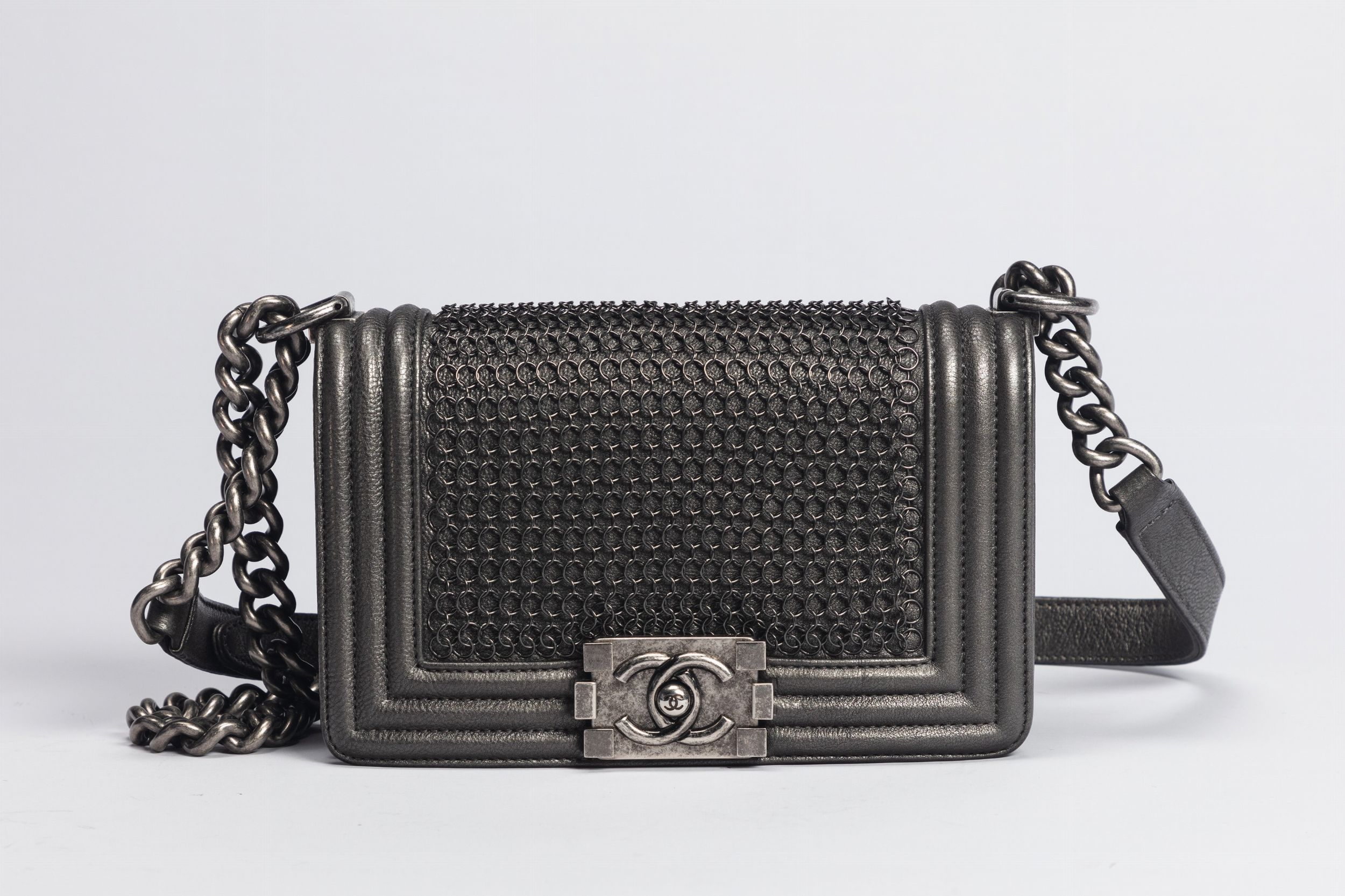 2013 in pelle color bronzo, inserto a maglia di metallo, tracolla a catena in metallo brunito, cm 20, con sacchetto