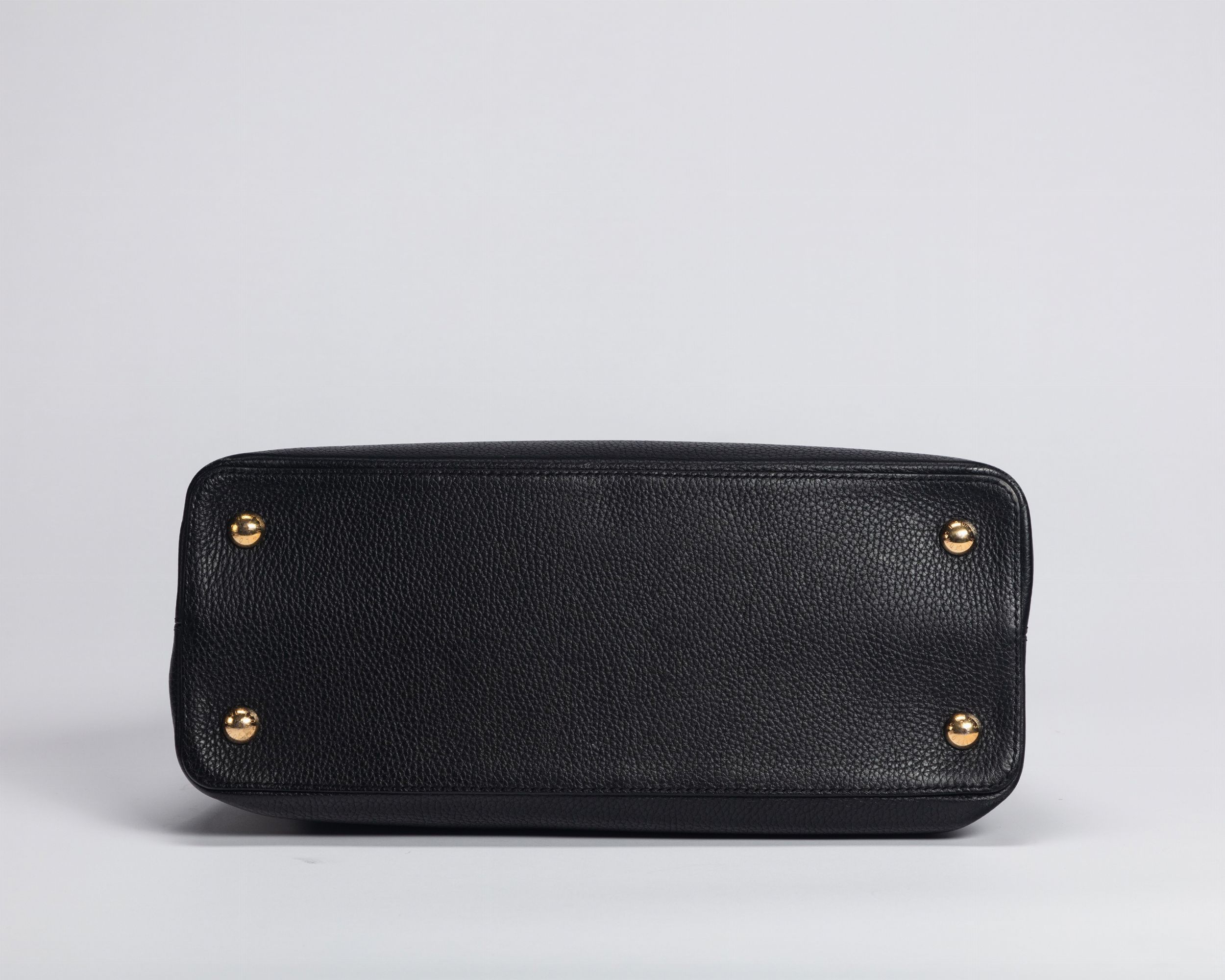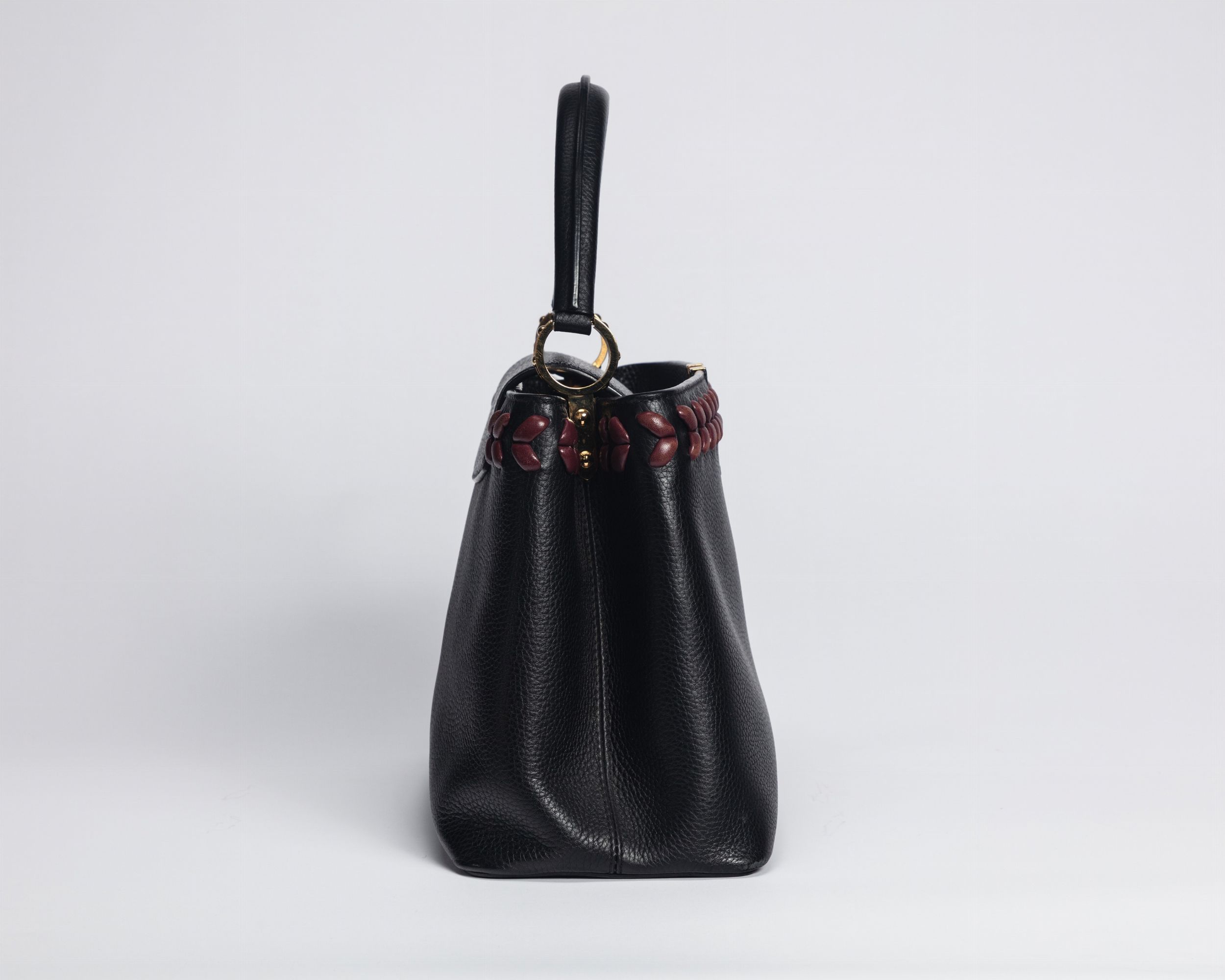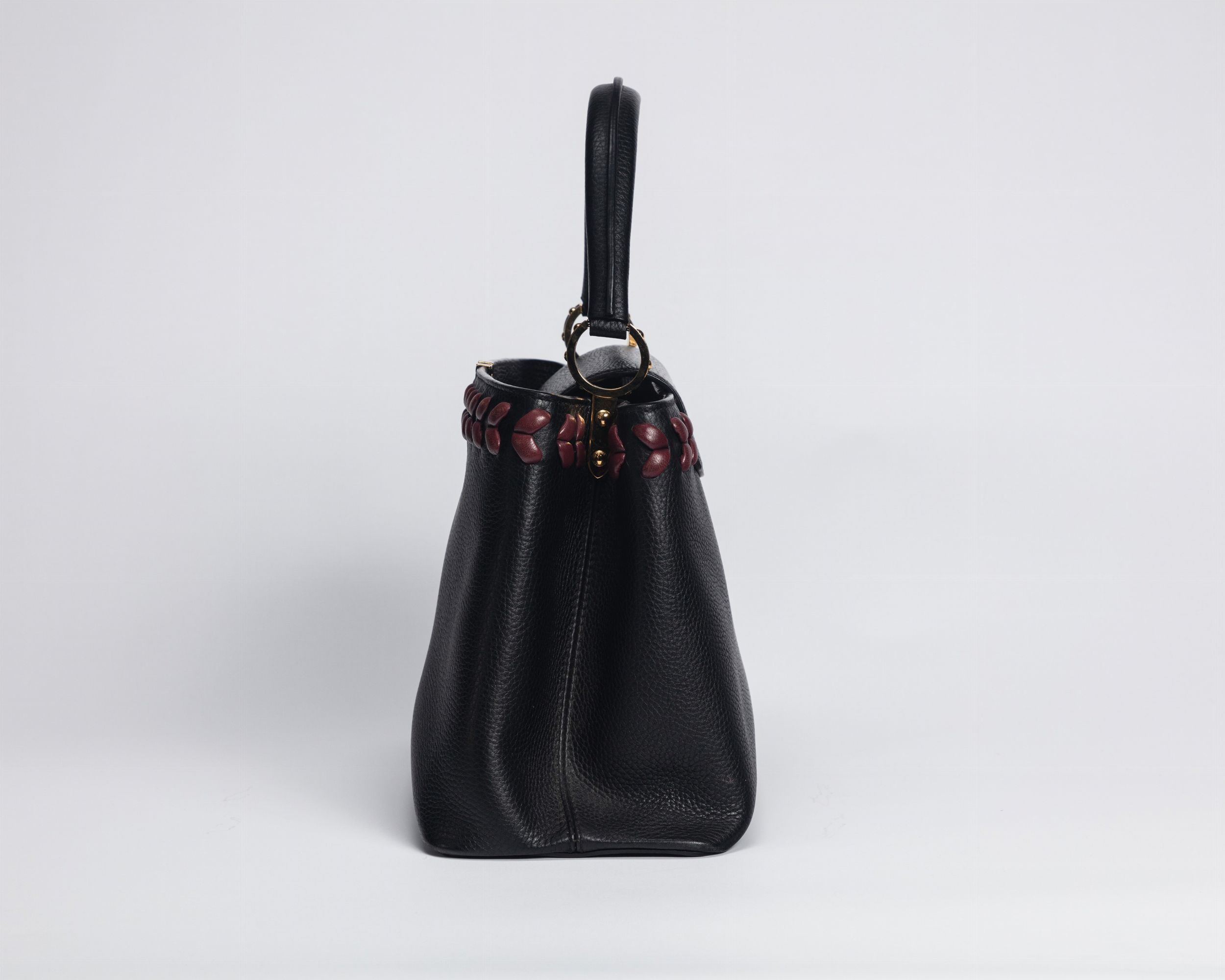 2017 in pelle color nero, inserti in pelle color bordeaux, dettagli in metallo dorato, con sacchetto, cm 36 (difetti)