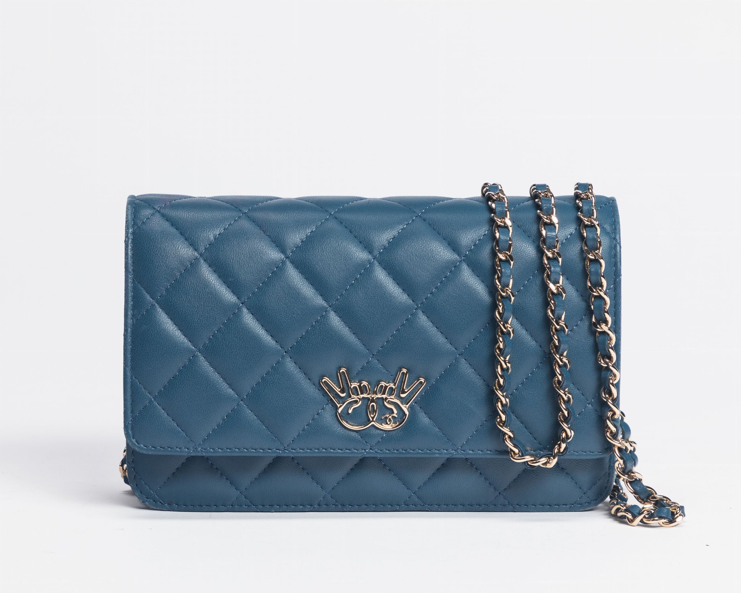 2016 in pelle matelassé color blu ottanio, tracolla a catena, dettagli in metallo, cm 19, con sacchetto