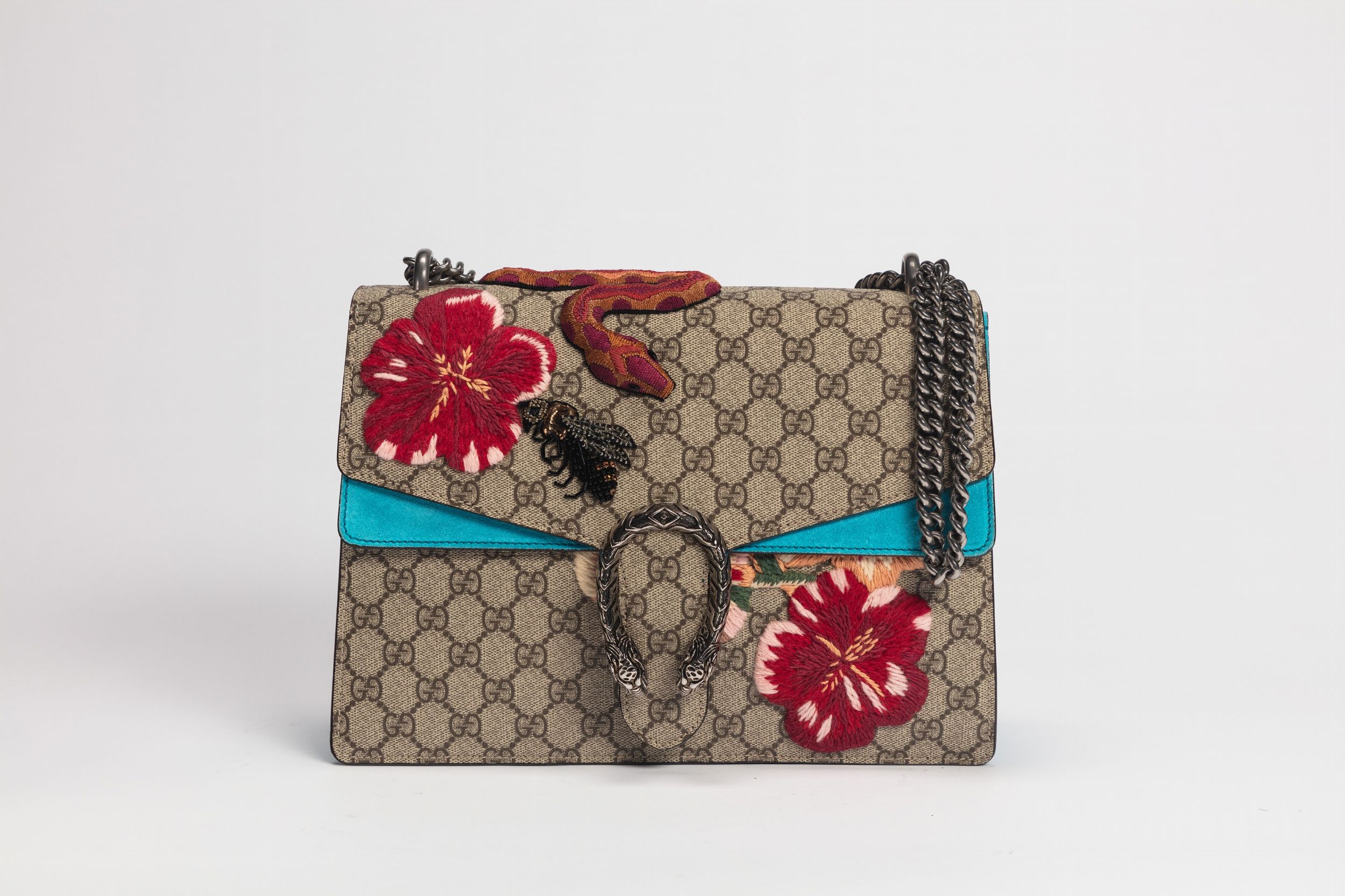 in tessuto logato, interno scamosciato color turchese e applicazioni a ricamo floreali e animalier, con tracolla a catena, dettagli in metallo brunito, cm 30, con sacchetto (lievissimi difetti)