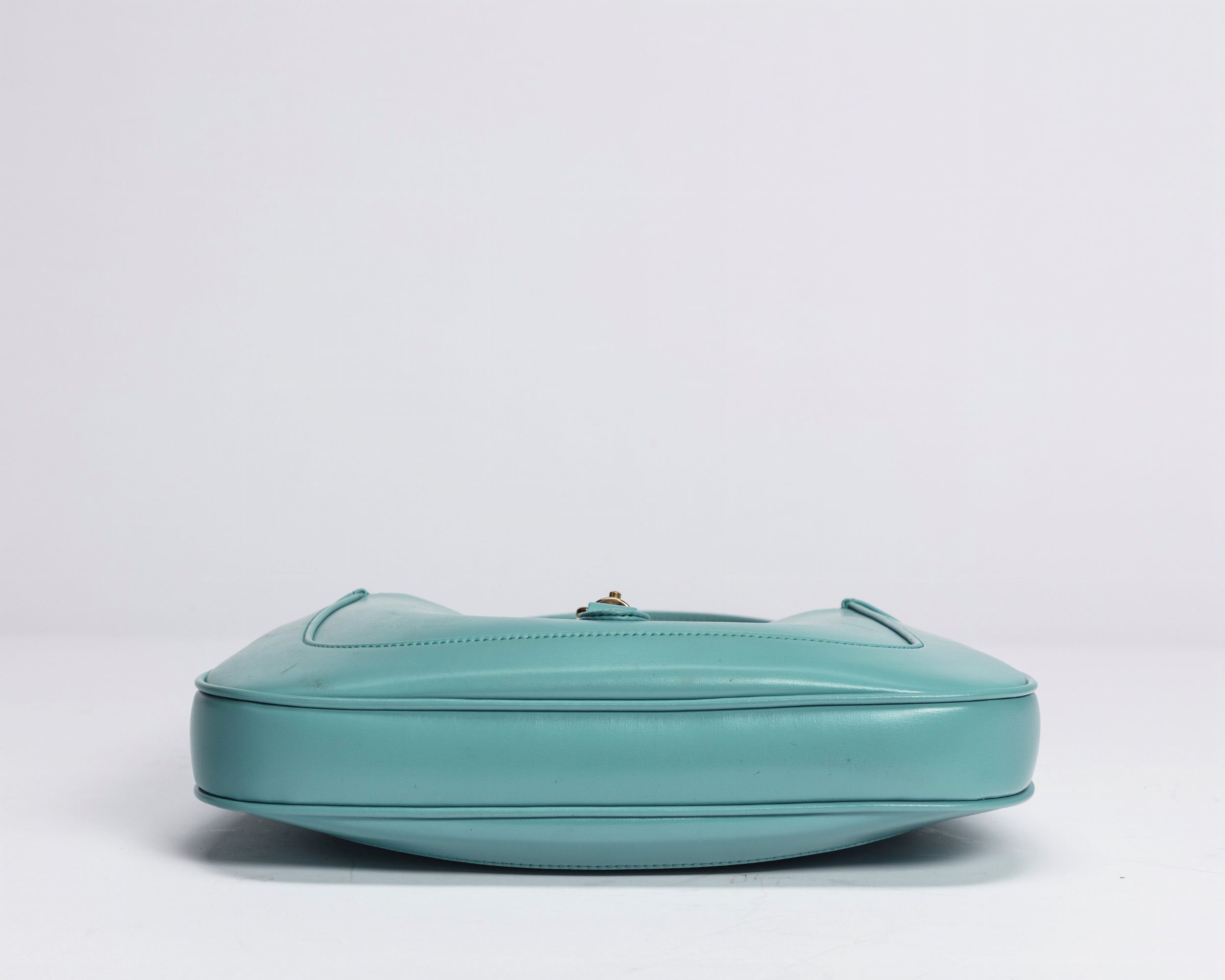 in pelle color azzurro, tracolla allungabile, dettagli in metallo dorato, chiusura a pistone, interno in suede color beige, cm 28, con sacchetto (difetti)
