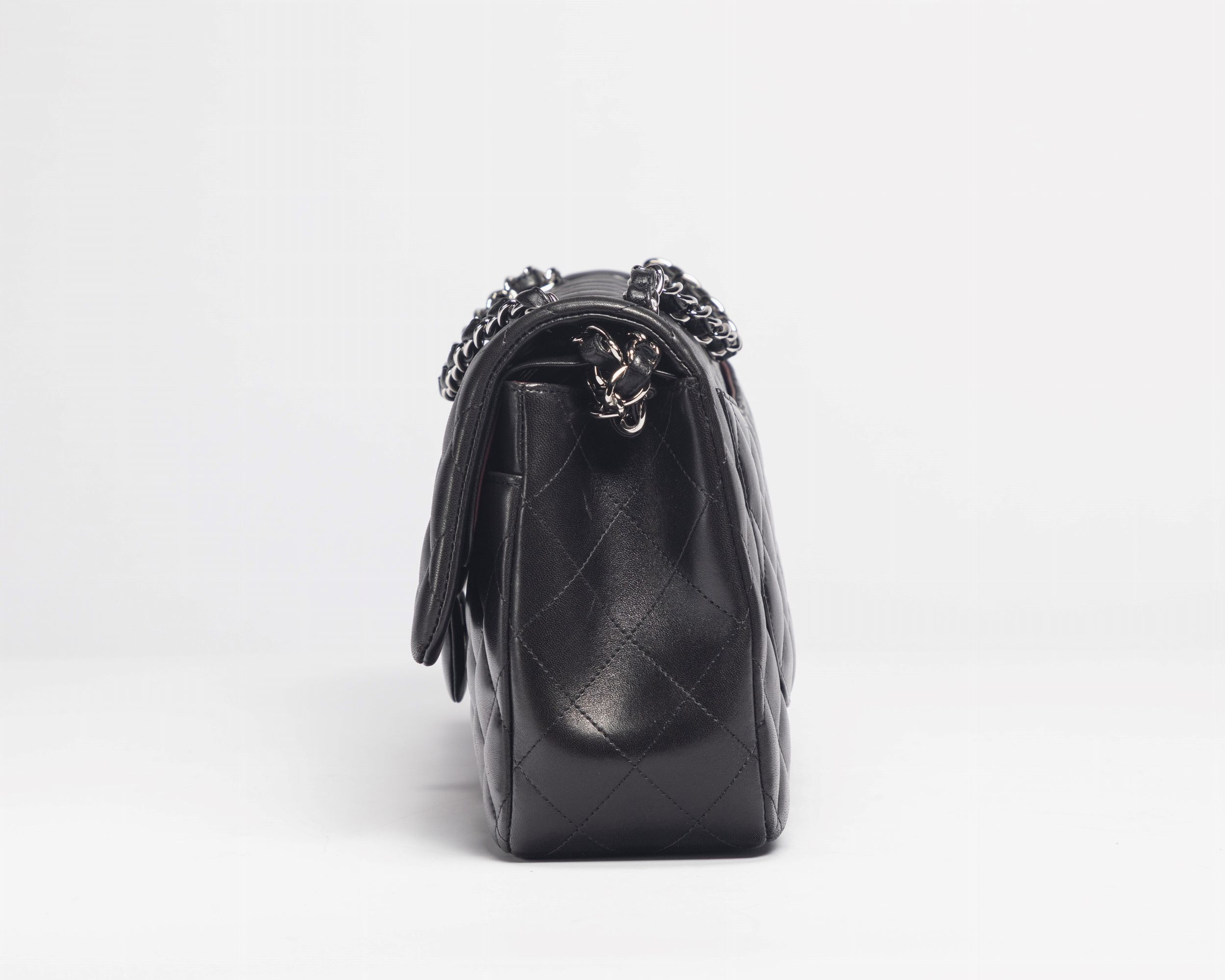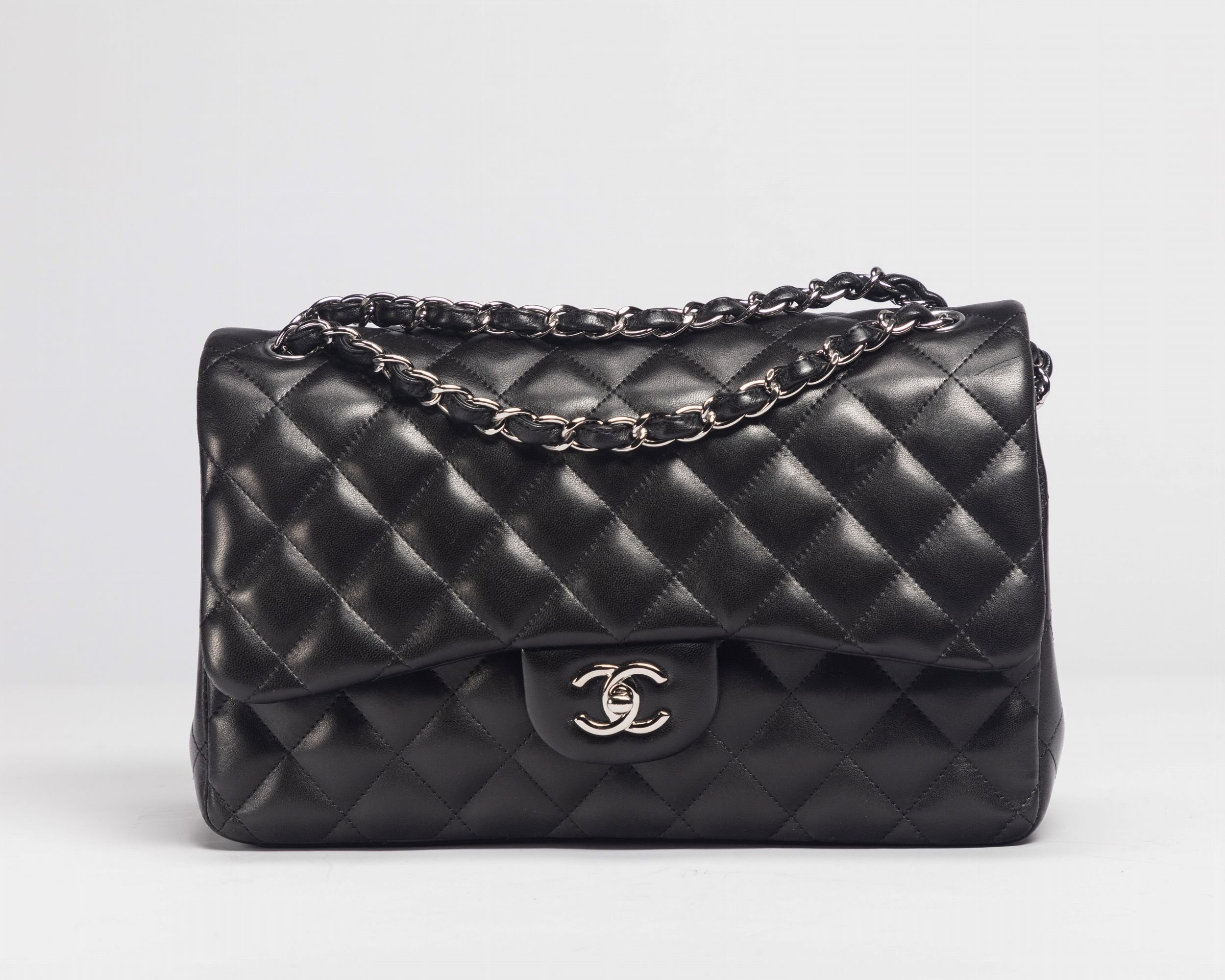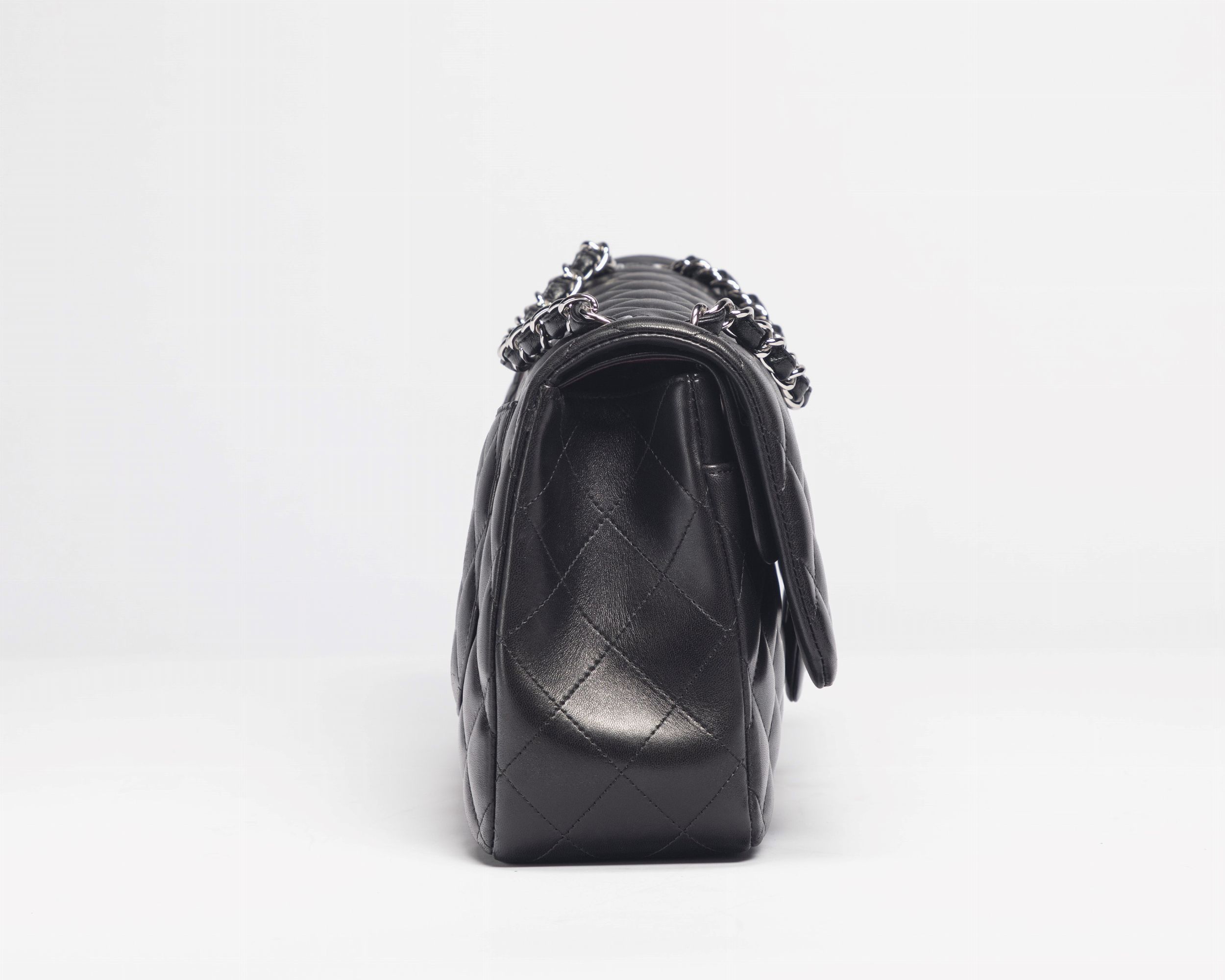 2011 in pelle matelassé color nero, tracolla a catena in metallo, (sticker interno staccato, card presente), cm 30, con sacchetto (lievi difetti)