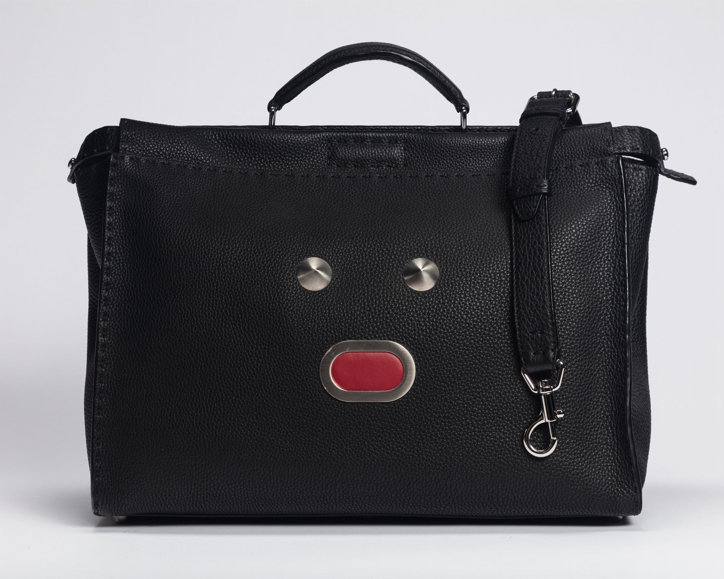 in pelle color nero, dettagli in metallo e pelle color rosso, con tracolla staccabile, cm 40, con sacchetto