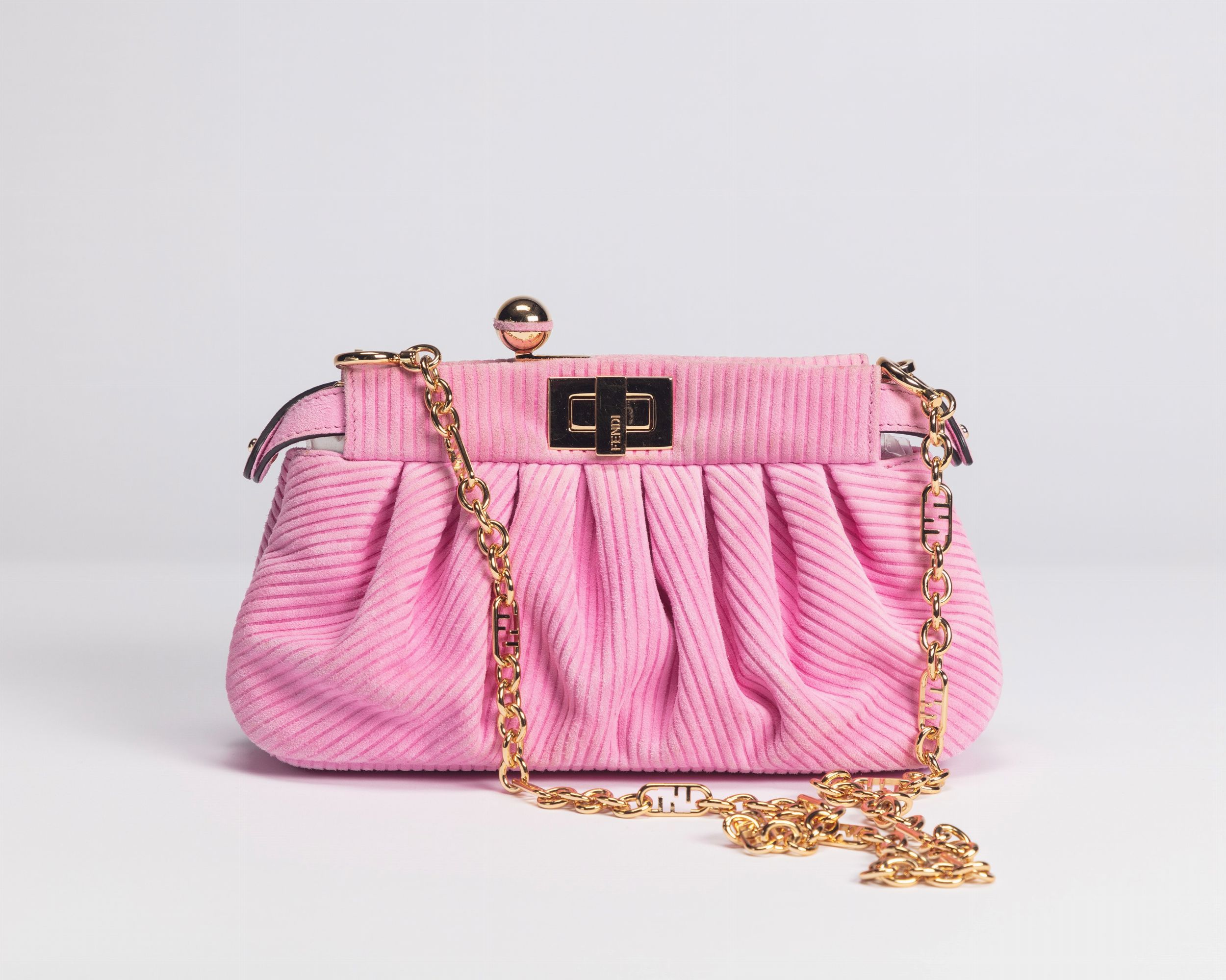 in camoscio rigato color rosa, tracolla a catena in metallo dorato staccabile, cm 24 (difetti)