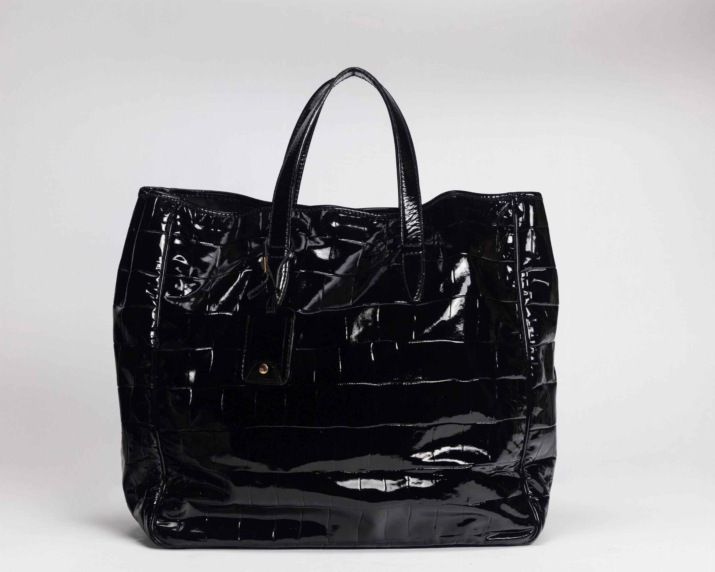 Borsa in vernice nera stampata, doppi manici, dettagli in metallo dorato, cm 40 (lievi difetti)