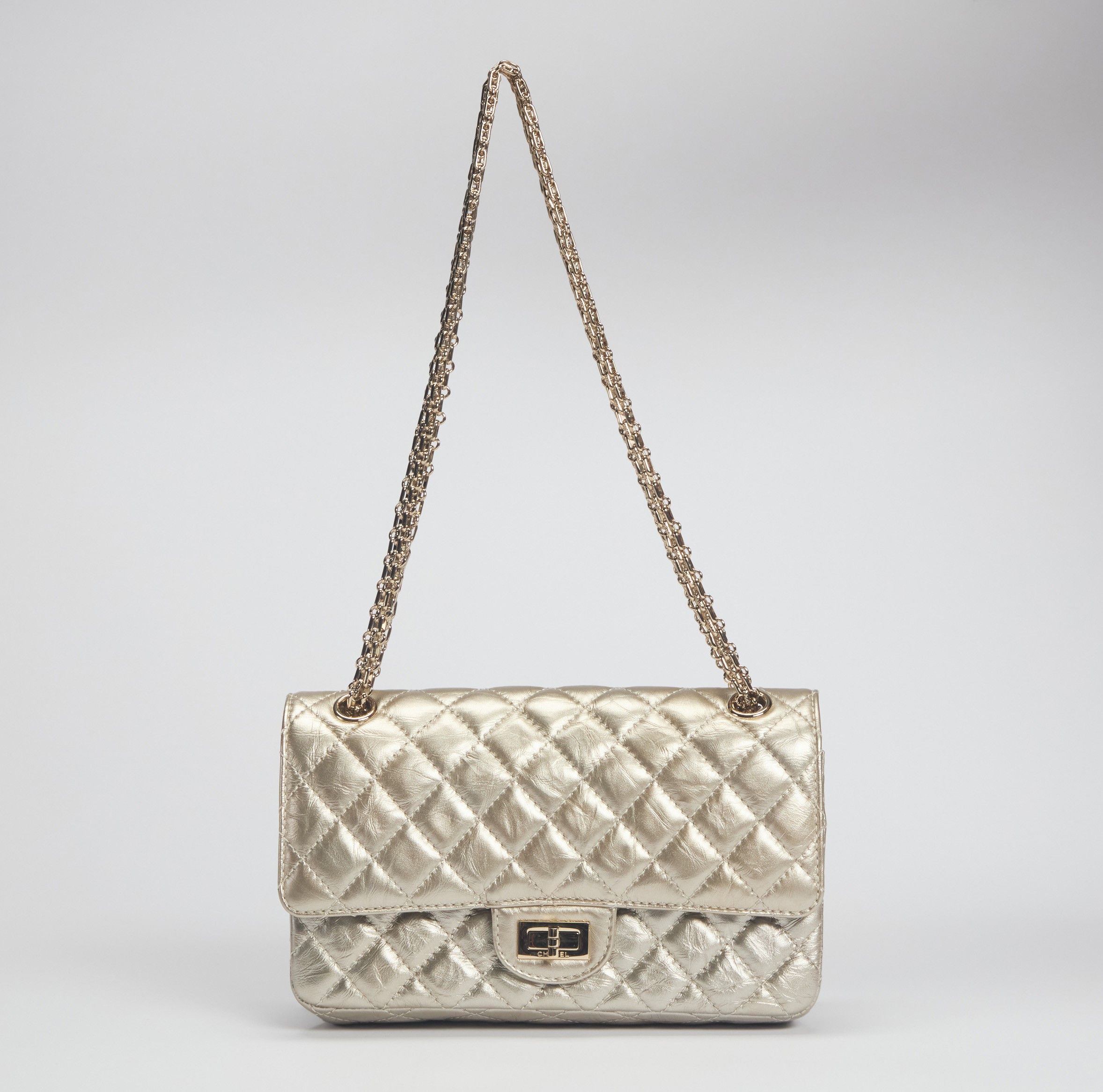 2020 in pelle matelassé color oro, tracolla a catena in metallo dorato, cm 24, con sacchetto e scatola (nuova e mai usata)