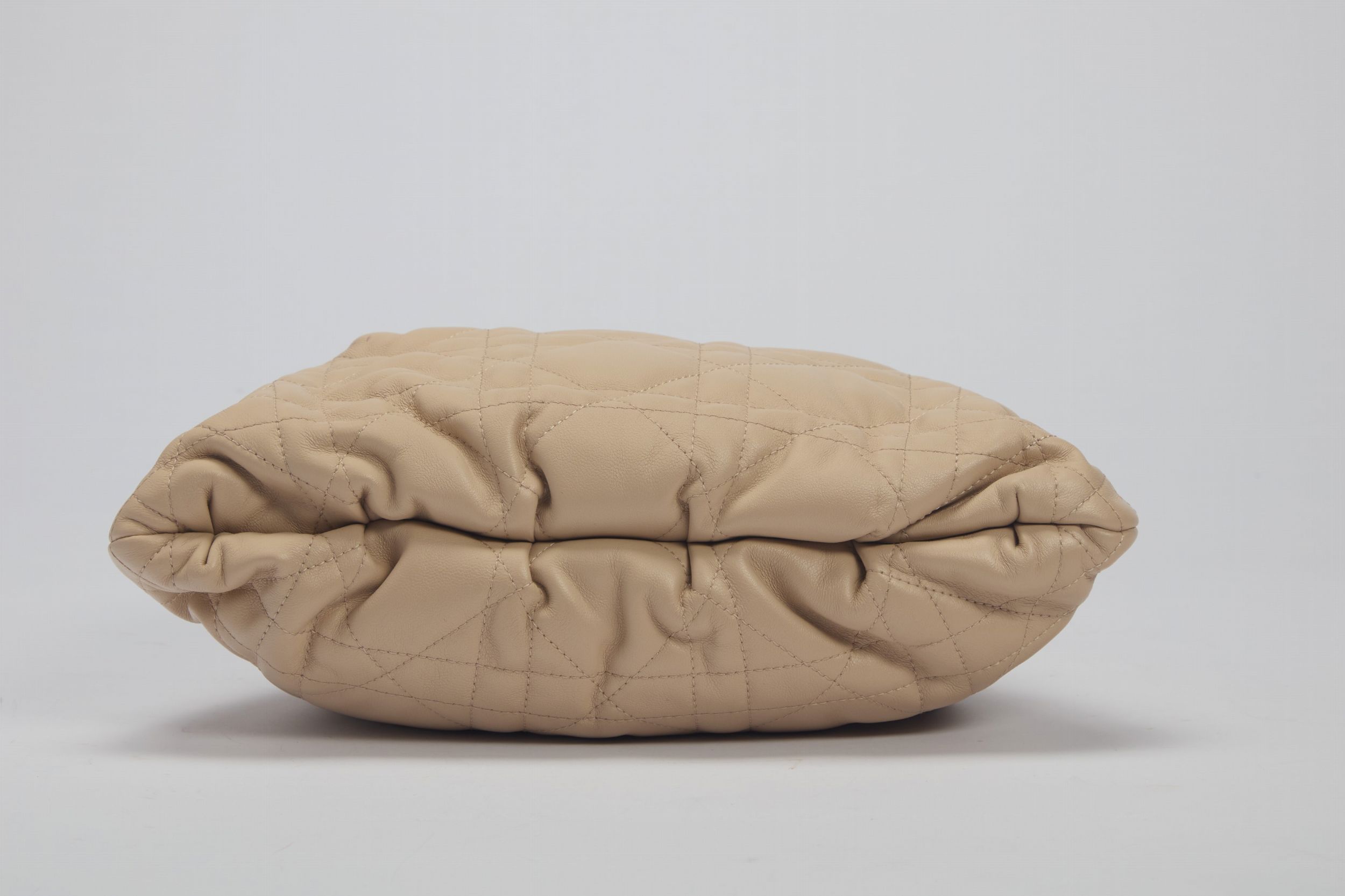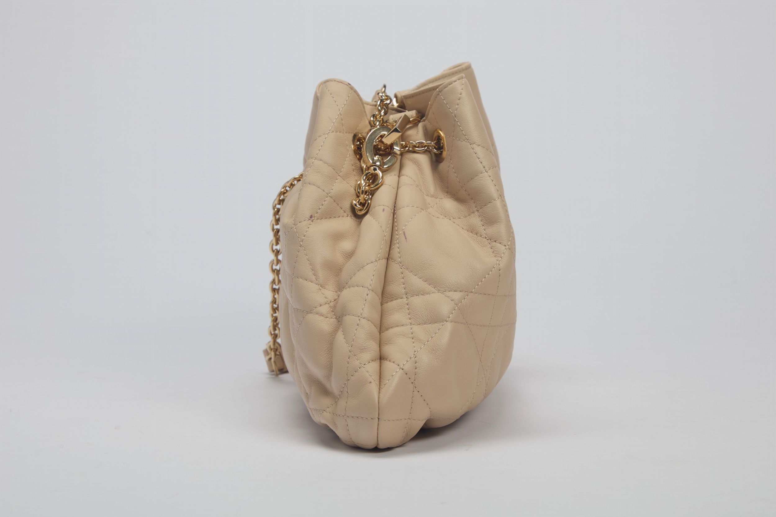 in pelle matelassé color beige, dettagli in metallo dorato, con tracolla, con sacchetto, cm 30 (difetti)