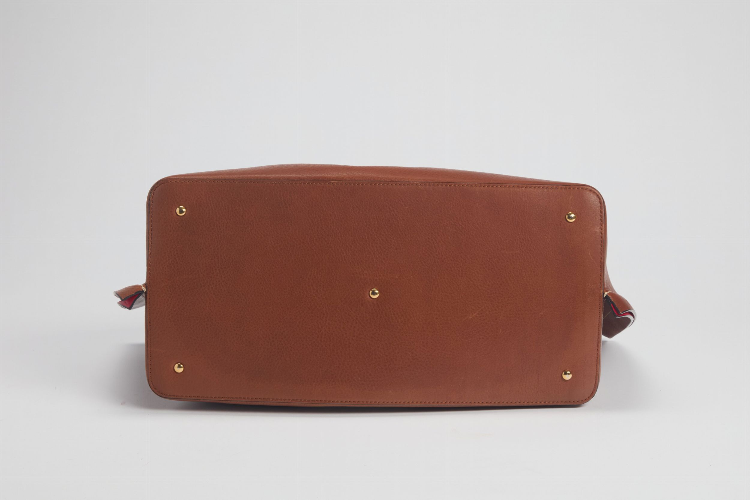 a doppi manici in cuoio color marrone, interno in pelle color nero con pochette in pelle color rosso, tracolla staccabile, dettagli in metallo dorato, cm 35 (difetti)
