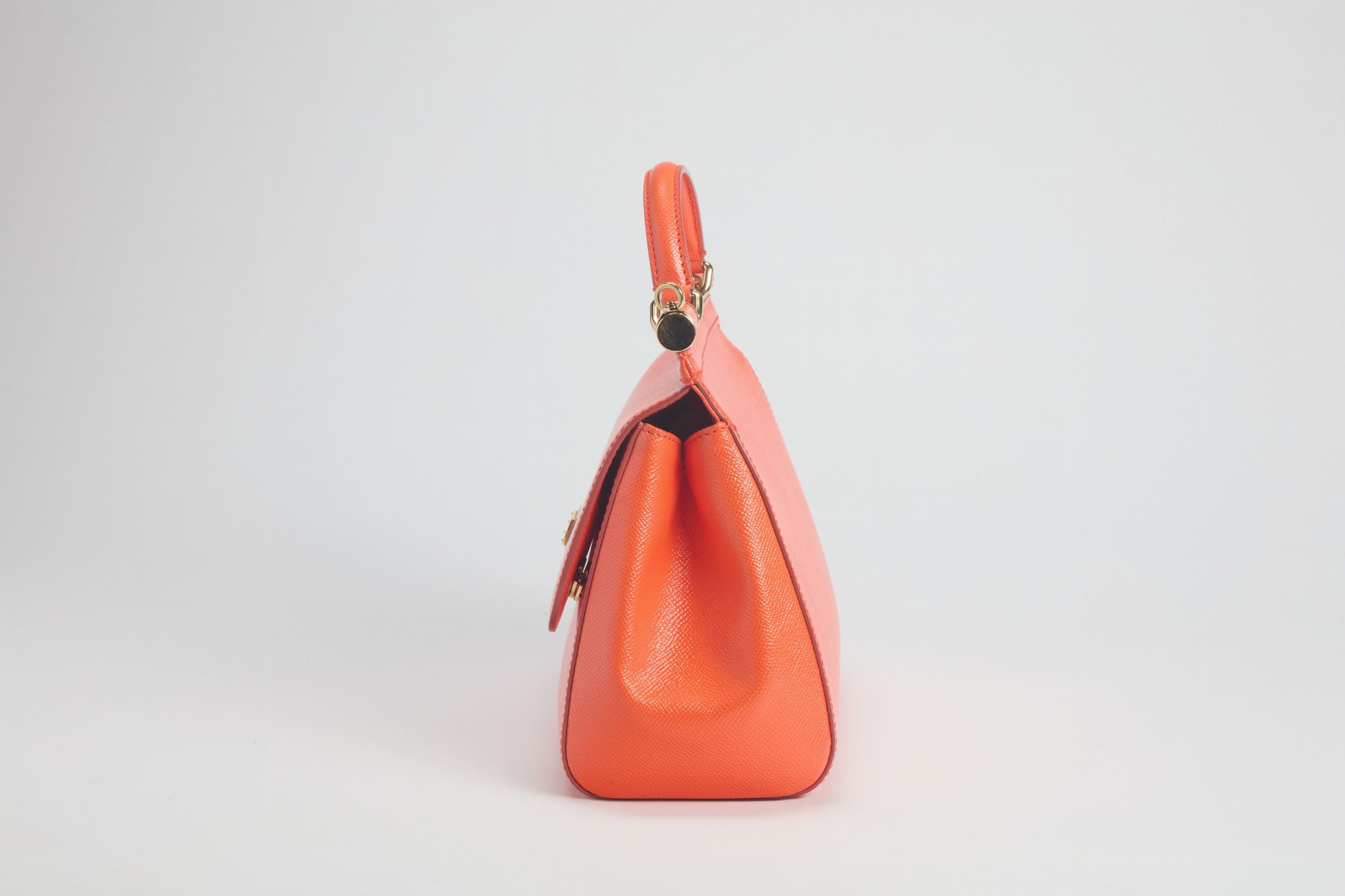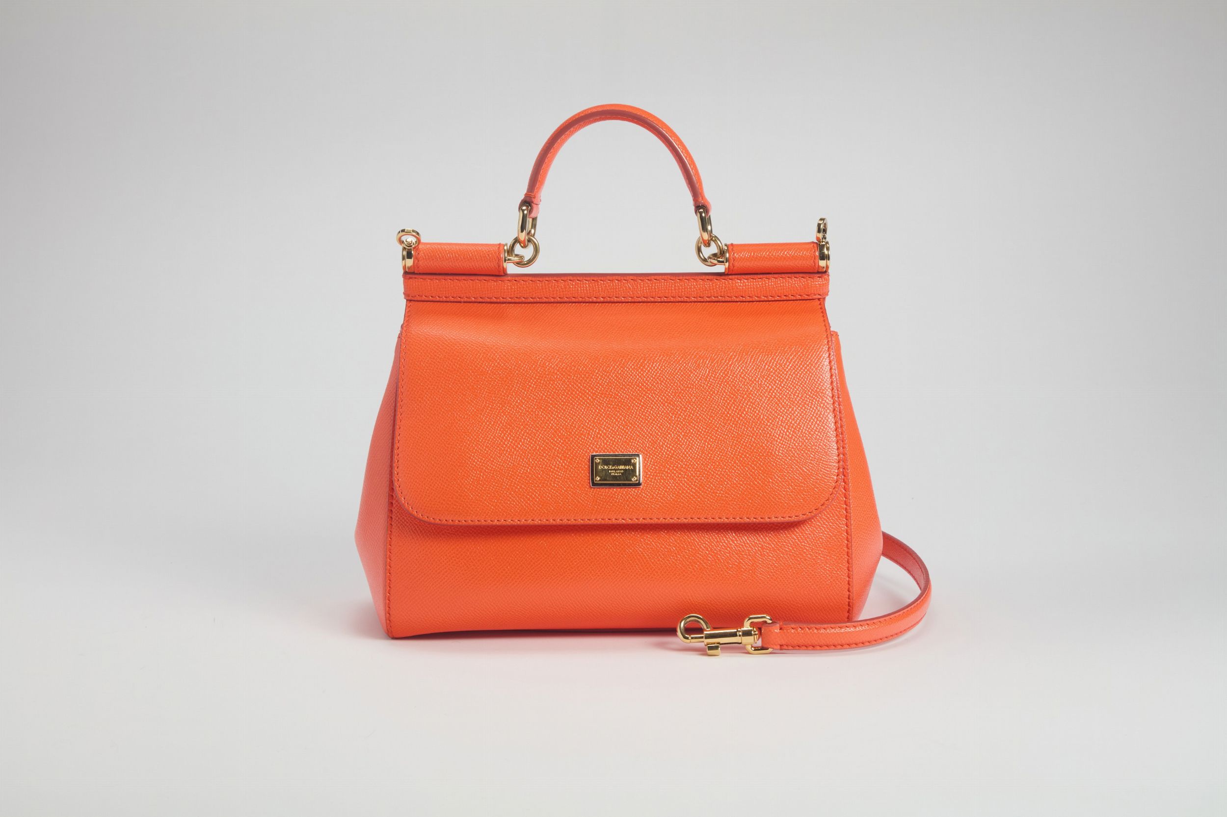 in pelle color mandarino, dettagli in metallo dorato, con tracolla staccabile, cm 25, con sacchetto (lievissimi difetti)